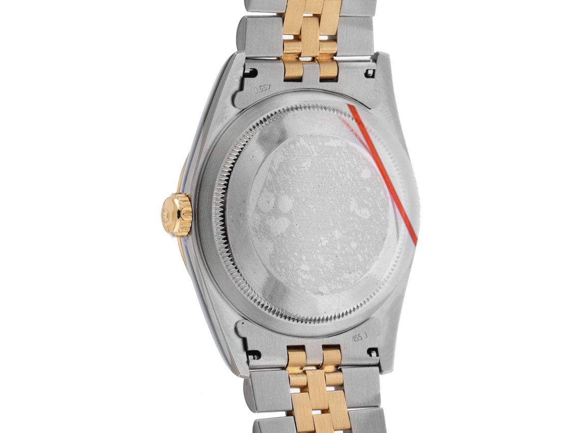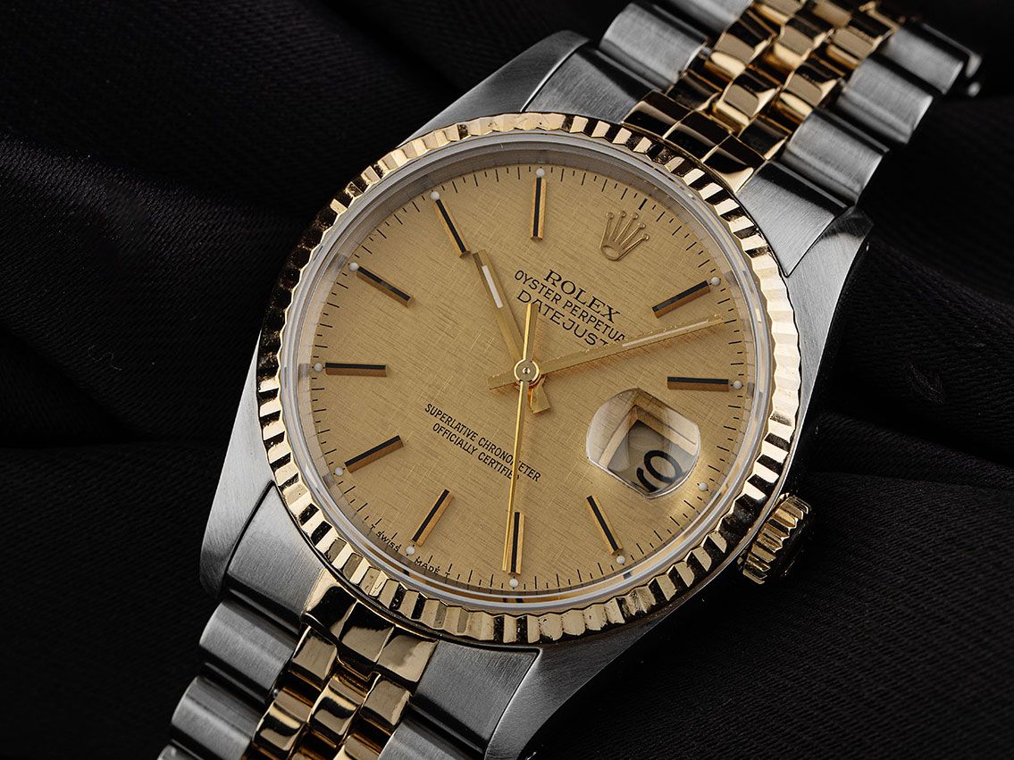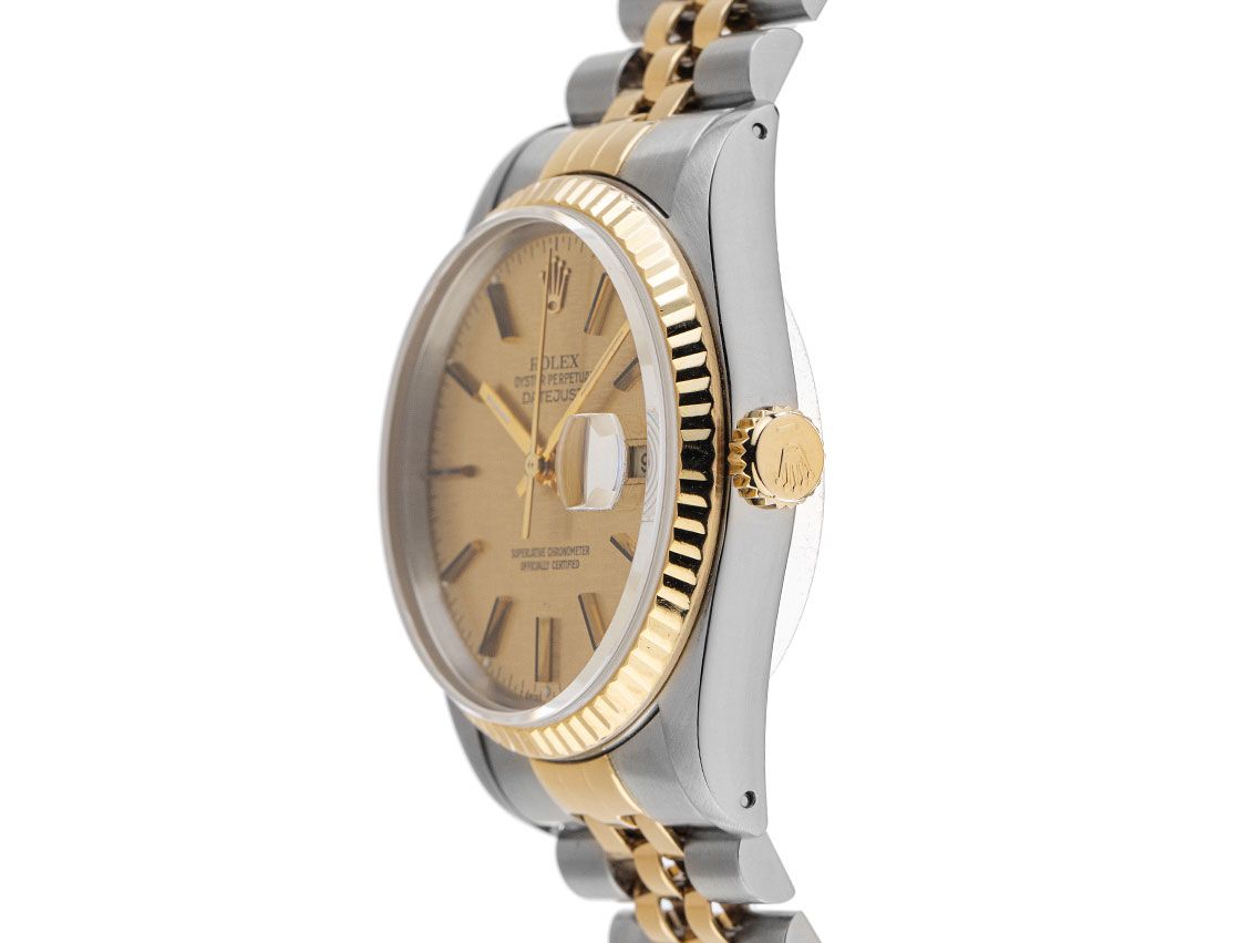 Gehäuse aus poliertem und satiniertem Edelstahl, Gehäusedurchmesser ohne Krone 36mm, Gehäusehöhe 11,5mm. Lünette aus 18kt Gelbgold, geriffelt und poliert. Armband Jubilé aus poliertem und satiniertem Edelstahl / 18kt Gelbgold, Faltschließe aus Edelstahl mit Hersteller-Logo. Zifferblatt Leinen Dial in champagnerfarben mit aufgesetzten gelbgoldenen Indexen und gelbgoldenen Zeigern, "T SWISS MADE T" Aufschrift bei 6 Uhr. Uhrwerk Automatik, Chronometer, Rolex Manufakturkaliber 3135 mit 31 Edelsteinen. Anzeige von Stunde, Minute und Sekunde über Zeiger aus der Mitte mit Sekundenstopp zur sekundengenauen Einstellung der Uhrzeit, Datumsanzeige mit Schnellverstellung unter Glaslupe bei 3 Uhr. Saphirglas kratzfest. Krone verschraubbar mit Hersteller-Logo. Boden aus Edelstahl, verschraubt. Gewicht der Uhr inklusive Armband 96g, Länge des Armbandes inklusive Gehäuse 175mm. Referenznummer: 16233, Gehäusenummer: R632XXX, Baujahr: 1987, ID: P186998001125H-9200, Artikelnummer: 10000083082. Mit Gangkontrolle und kompletter äußerlicher Aufarbeitung von November 2025. Original Rolex Box mit Umkarton und Beschreibung sowie Ledermäppchen, Übersetzungsheft und Rolex Chronometer-Siegel sowie Watchregister Auszug von November 2025, The Watch Register Zertifikat / ohne Eintrag (Internationale Datenbank für verlorene oder gestohlene Uhren). Superschnäppchen, Kapitalanlage mit Wertsteigerungspotential. Sehr guter Zustand. Lieferzeit sofort.