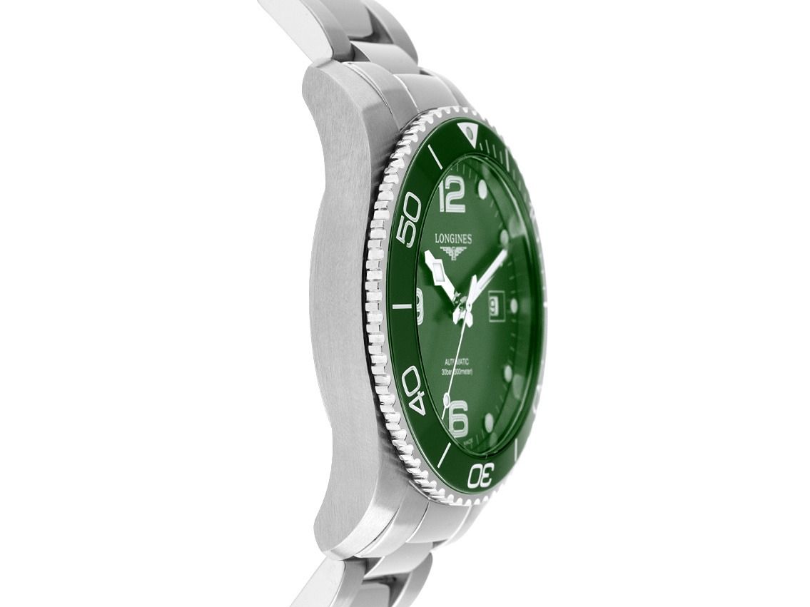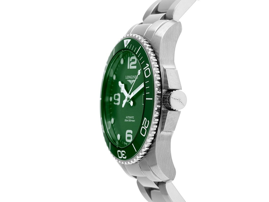 Longines Hydroconquest Stahl Keramik Automatik Armband StahlGehäuse Edelstahl poliert und satiniert, Gehäusedurchmesser ohne Krone 41mm, Gehäusehöhe 11,9mm. Lünette Edelstahl mit grünem Keramik Inlay, 60-Minuten Einteilung und Leuchtpunkt, einseitig drehbar. Armband Edelstahl poliert und satiniert, Sicherheitsfaltschließe Edelstahl mit Hersteller-Logo. Zifferblatt grün mit aufgesetzten arabischen Leuchtziffern und Leuchtpunkten sowie versilberten polierten Leuchtzeigern. Uhrwerk Automatik, Longines Kaliber L888, Gangreserve ca. 72 Stunden. Anzeige von Stunde, Minute und Sekunde über Zeiger aus der Mitte mit Sekundenstopp zur sekundengenauen Einstellung der Uhrzeit, Datumsanzeige mit Schnellverstellung bei 3 Uhr. Saphirglas kratzfest. Krone verschraubbar mit Flankenschutz und Hersteller-Logo. Boden Edelstahl verschraubt und graviert. Gewicht der Uhr inklusive Armband 188g, Länge des Armbandes inklusive Gehäuse 220mm. Wasserdicht bis 30 ATM. Referenznummer: L3.781.4.06.6, ID: ST610223401125H-1950, Artikelnummer: 10000083480. Original Longines Box mit Umkarton und Garantie Papiere von 2025 sowie Beschreibung, Full Set. Ungetragen. Lieferzeit sofort.