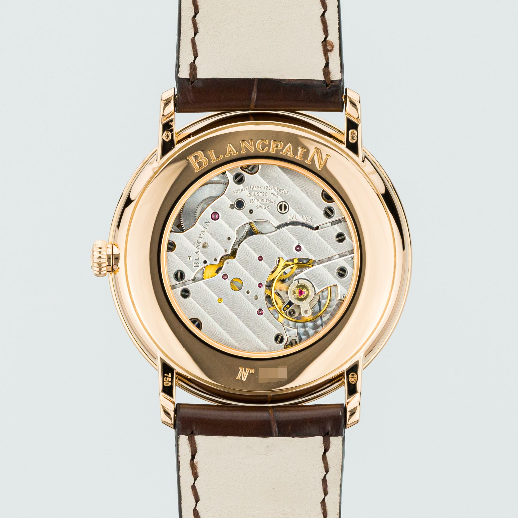 Das Zifferblatt ist ein sogenanntes Opaline mit aufgesetzten eleganten römischen Ziffern in Roségold und eleganten goldenen Zeigern im sogenannten Breguet-Stil. Das Gehäuse hat eine klassische Form, gefertigt aus 18-karätigem Roségold, und hat die eleganten Maße von 40 mm bei nur 8,55 mm Höhe! Der Gehäuseboden ist massiv, trägt die Modellinschrift Blancpain Villeret und verbirgt leider die Möglichkeit, die Mechanik des mechanischen Herzens dieses horologischen Kunstwerks zu bewundern. Und im Inneren der Uhr schlägt das hauseigene Blancpain Kaliber 11C5 – ein hauseigenes Handaufzugswerk mit einer Gangreserve von 100 Stunden, einer Dicke von nur 3,3 mm (nicht umsonst trägt es den Namen „ultraplate“), es besteht aus 211 Komponenten und 23 Edelsteinen, und sein Erscheinungsbild ist wirklich beeindruckend – mit einer Rhodium-Beschichtung und einer Côtes de Genève-Oberfläche.