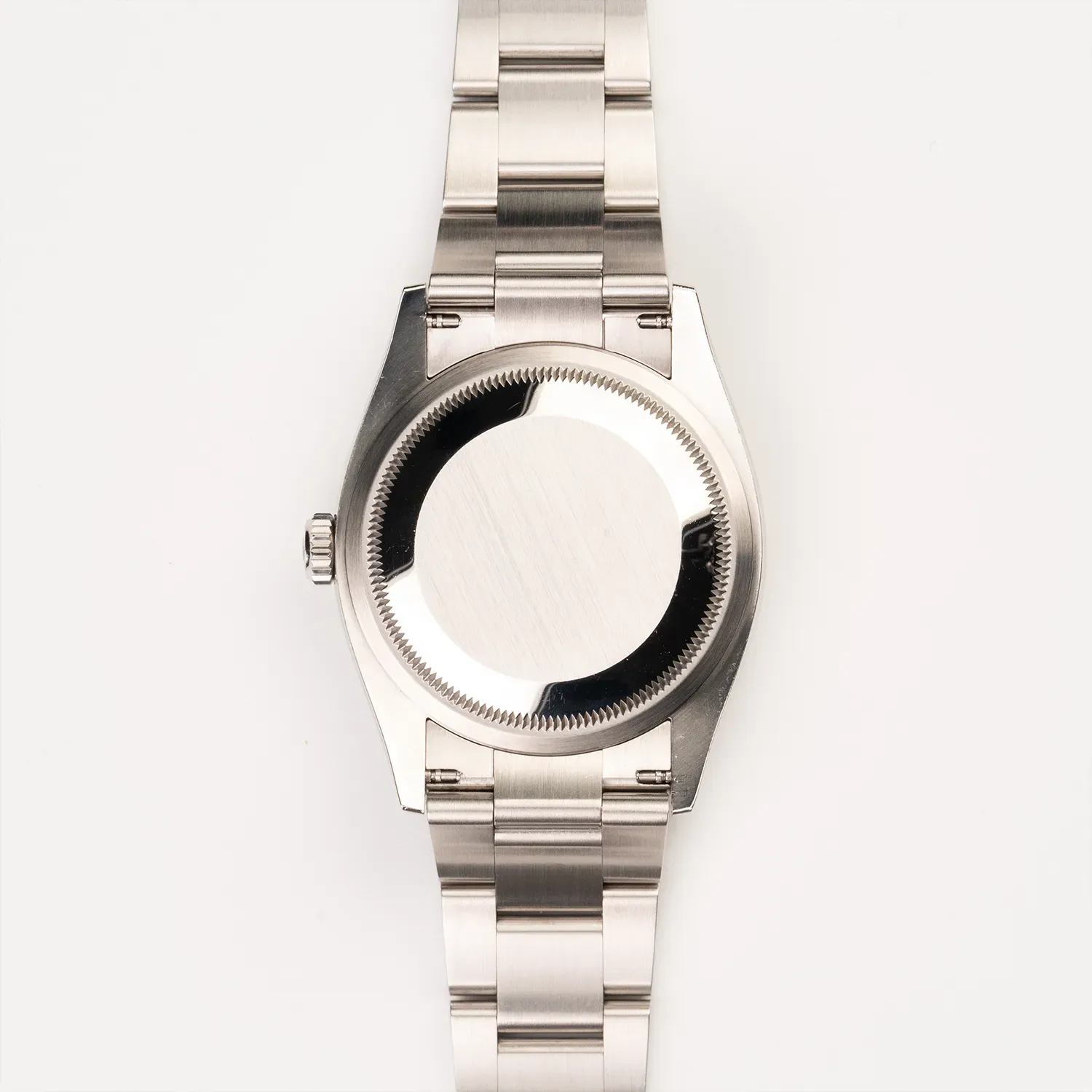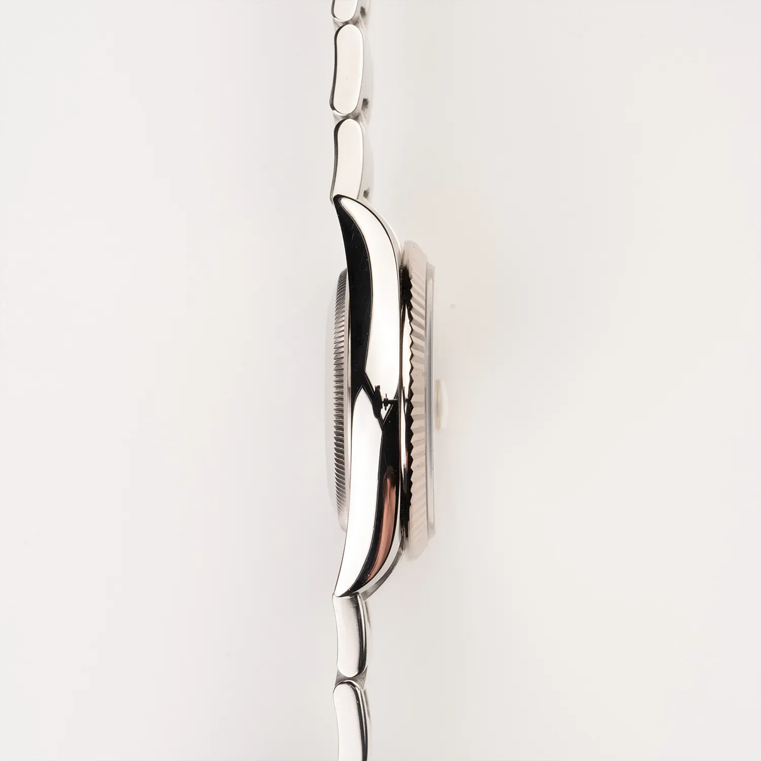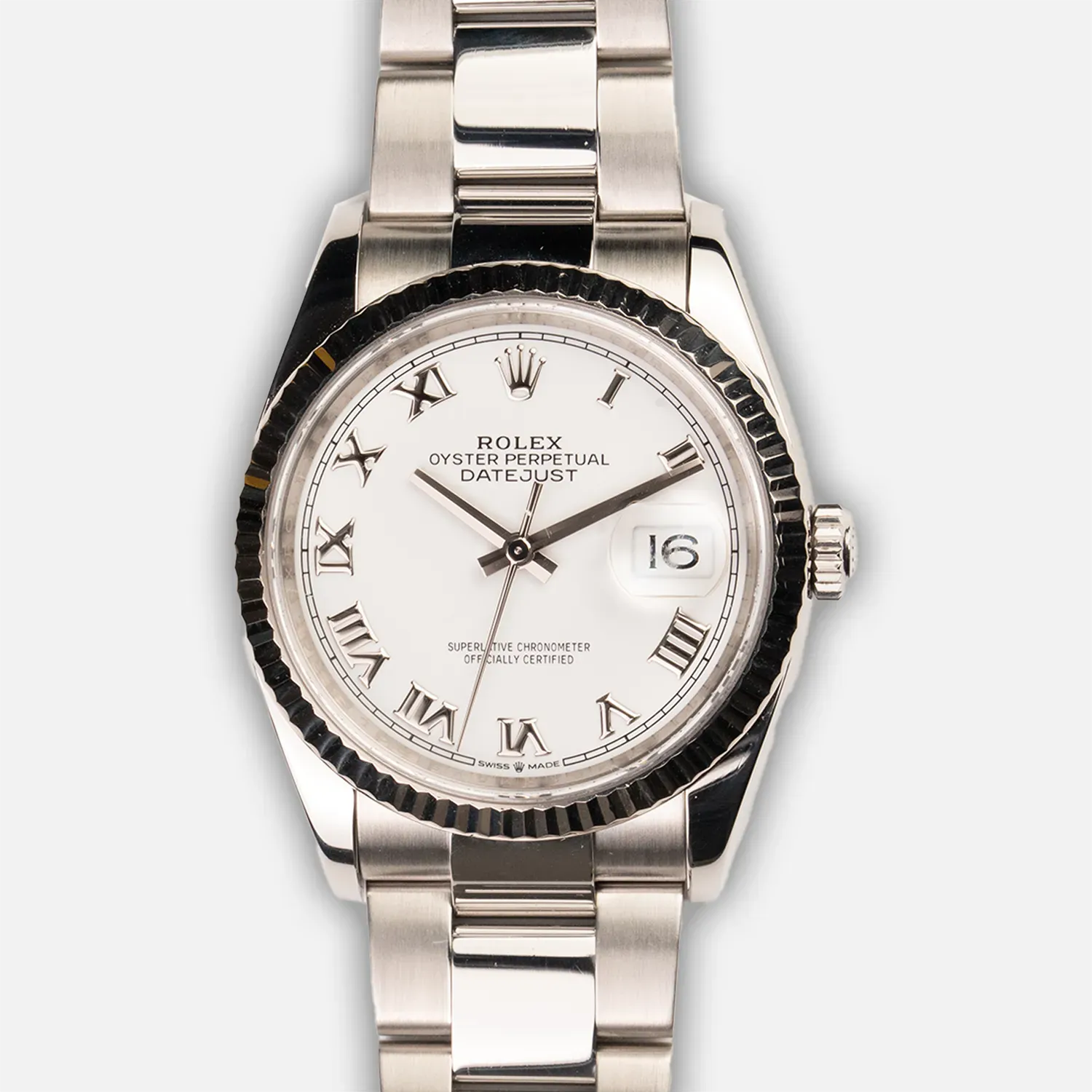 Was passt besser zu einer eleganten 36mm Uhr als römische Indizes auf einem weißen Ziffernblatt? Mit dem Oysterband trotzdem noch sportlich tragbar und als absolutes Muss natürlich mit Weißgoldlünette.