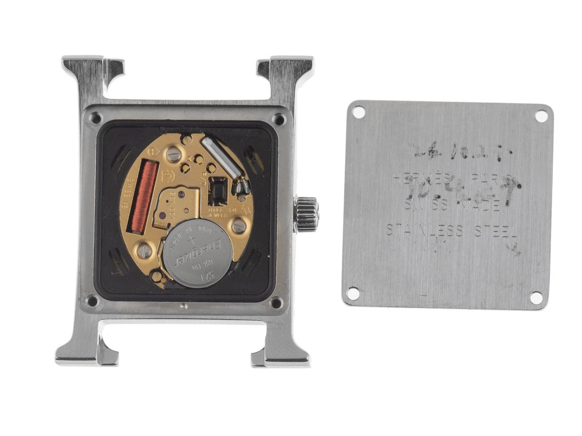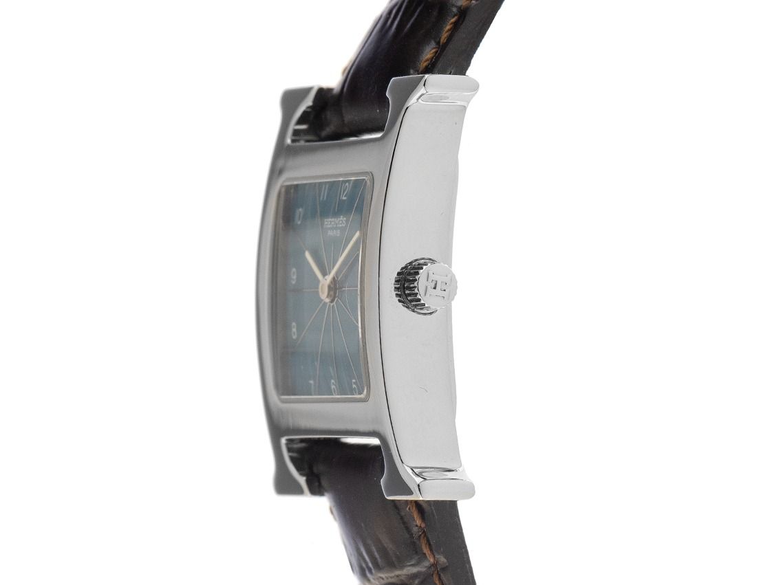 Gehäuse aus poliertem Edelstahl, H-förmig, Gehäusemaße ohne Maße (L x B x H) 30 x 24 x 6,3 mm. Armband aus braunem Leder mit Ziernaht, Anstoßbreite 16 mm, Stiftschließe aus Edelstahl mit Hersteller-Logo. Zifferblatt blau mit weißen arabischen Ziffern und weißen Zeigern. Uhrwerk quarzgesteuert, Kaliber Hermès 901.001 mit 3 Edelsteinen. Anzeige von Stunde und Minute über Zeiger aus der Mitte. Saphirglas kratzfest und gewölbt. Krone mit Hersteller-Logo. Boden aus Edelstahl, 4-fach verschraubt und graviert. Gewicht der Uhr inklusive Armband 24 g. Referenznummer: HH1.210, Gehäusenummer: 1539XXX, ID: P22766000126H-2900, Artikelnummer: 10000084274. Mit Gangkontrolle und kompletter äußerlicher Aufarbeitung von Februar 2026. Original Hermès Box mit Umkarton und Garantie-Papieren ohne Datumseintrag sowie Watchregister-Auszug von Januar 2026, The Watch Register Zertifikat / ohne Eintrag (Internationale Datenbank für verlorene oder gestohlene Uhren), Full Set. Superschnäppchen, sehr seltenes Sammlerstück. Sehr guter Zustand. Lieferzeit sofort.