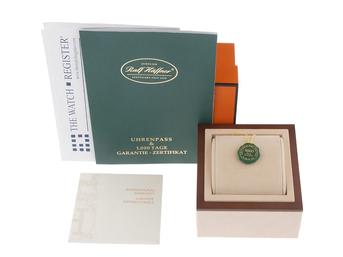 Inklusive certified pre owned Siegel / Uhrenpass mit einem Farbbild, der genauen Beschreibung sowie dem Wiederbeschaffungswert der Uhr über 2900,-€ und 1000 Tage Garantie ab Kaufdatum.