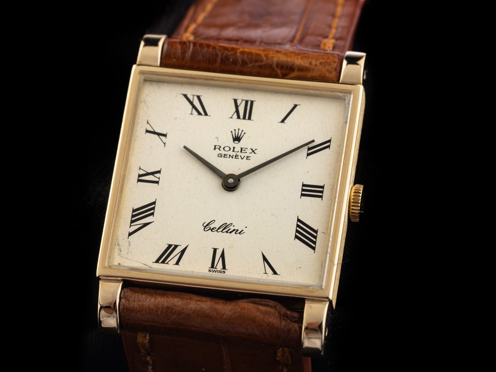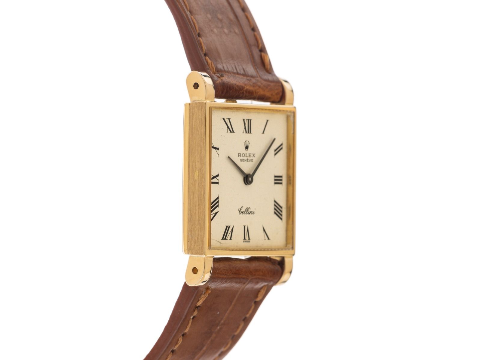 Gehäuse 18kt Gelbgold poliert, rechteckig, Gehäusemaße ohne Krone (L x B x H) 32 x 23 x 5,3mm. Rolex Armband Krokoleder braun mit Ziernaht, Anstoßbreite 18mm, Rolex Stiftschließe Gelbgold vergoldet mit Hersteller-Logo. Zifferblatt cremeweiß leicht patiniert mit schwarzen römischen Indexen und schwarzen Zeigern. Uhrwerk Handaufzug, Rolex Manufakturkaliber 1601 mit 19 Edelsteinen. Anzeige von Stunde und Minute über Zeiger aus der Mitte. Saphirglas kratzfest. Krone 18kt Gelbgold mit Hersteller-Logo. Boden 18kt Gelbgold. Gewicht der Uhr inklusive Armband 27g. Referenznummer: 3996, ID: P247251000226H-6900, Artikelnummer: 10000084710. Mit Gangkontrolle und kompletter äußerlicher Aufarbeitung von Februar 2026. Original Rolex Cellini Box mit Umkarton und Beschreibung sowie Ledermäppchen und Übersetzungsheft. Superschnäppchen, Kapitalanlage mit Wertsteigerungspotential, extrem seltenes Sammlerstück. Sehr guter Zustand. Lieferzeit sofort.