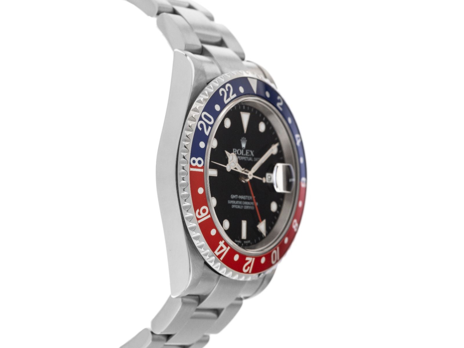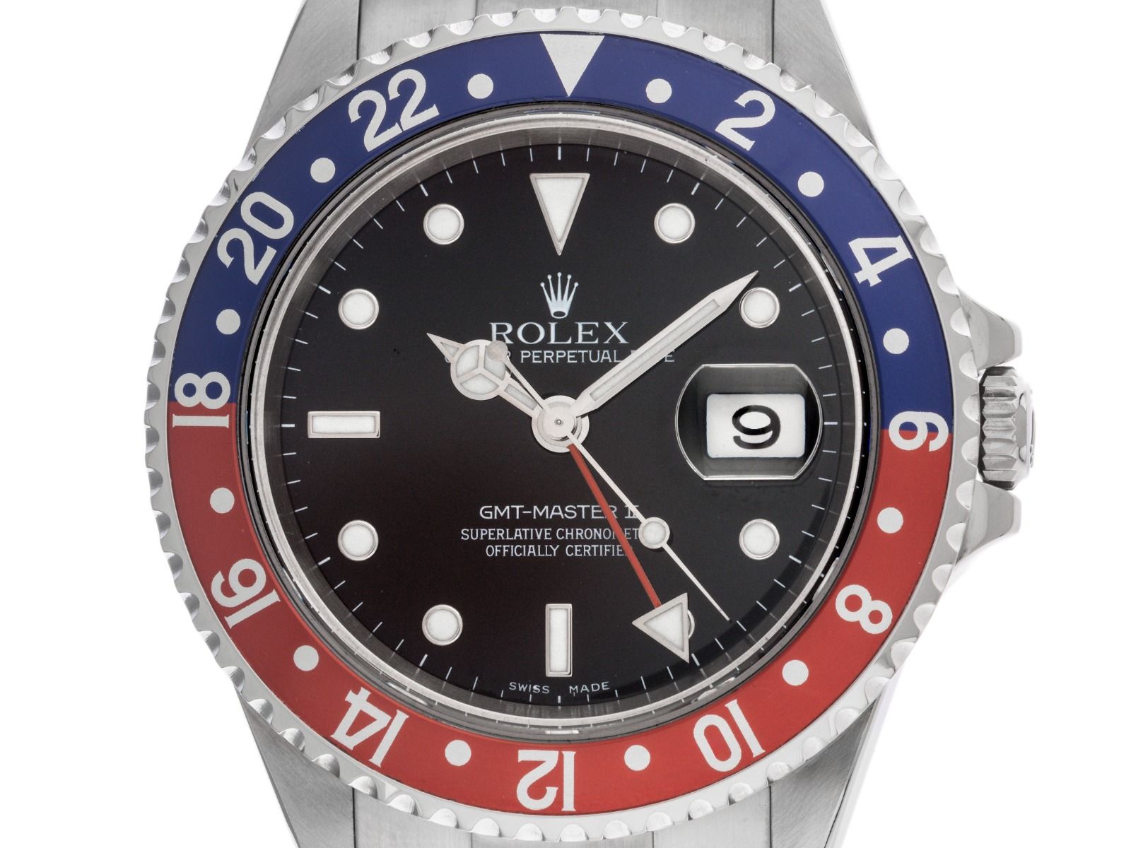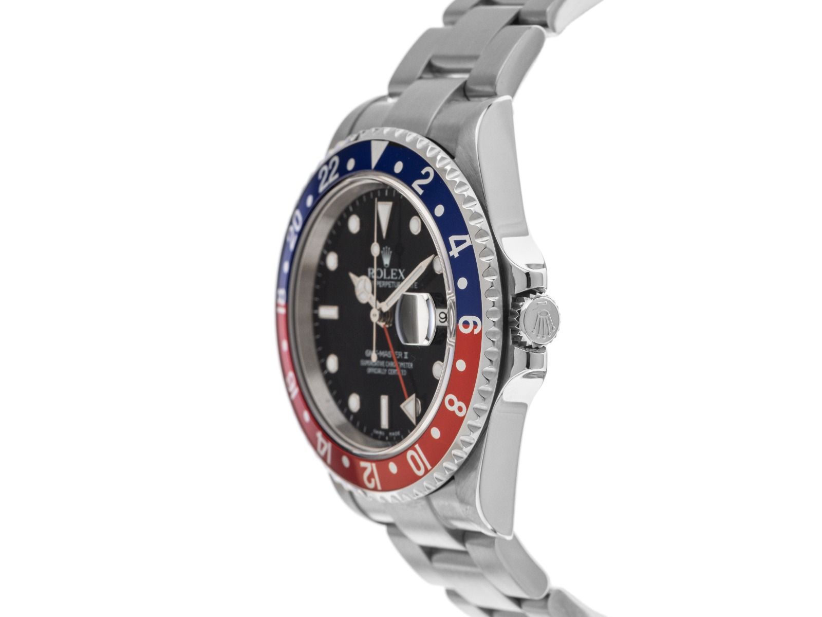 Gehäuse Edelstahl poliert und satiniert, no Hole (Gehäuse ungelocht), Gehäusedurchmesser ohne Krone 40mm, Gehäusehöhe 12,0mm. Lünette Edelstahl mit rot/blauem Pepsi Inlay, 24-Stunden Skala, beidseitig drehbar. Armband Oyster Edelstahl poliert und satiniert, Sicherheitsfaltschließe Edelstahl mit Hersteller-Logo. Zifferblatt schwarz mit aufgesetzten weißgoldenen Indexen und weißgoldenen Zeigern. Uhrwerk Automatik, Chronometer mit Zeugnis, Rolex Manufakturkaliber 3185 mit 31 Edelsteinen. Anzeige von Stunde, Minute und Sekunde über Zeiger aus der Mitte mit Sekundenstopp zur sekundengenauen Einstellung der Uhrzeit, Datumsanzeige mit Schnellverstellung unter Glaslupe bei 3 Uhr, zweite Zeitzone (GMT) ablesbar über Lünette, einstellbar über roten Zeiger aus der Mitte. Saphirglas kratzfest. Krone verschraubbar mit Flankenschutz und Hersteller-Logo. Boden Edelstahl verschraubt. Gewicht der Uhr inklusive Armband 123g, Länge des Armbandes inklusive Gehäuse 175mm. Referenznummer: 16710T, Gehäusenummer: F013XXX, ID: KA1785255180226H-17900, Artikelnummer: 10000084818. Mit Gangkontrolle und kompletter äußerlicher Aufarbeitung von Februar 2026. Original Rolex Box mit Umkarton und Garantie Papiere von Oktober 2003, LC 160 Großbritannien / Irland sowie Beschreibung, Ledermäppchen, Rolex Chronometer-Siegel und Watchregister Auszug von Februar 2026, The Watch Register Zertifikat / ohne Eintrag (Internationale Datenbank für verlorene oder gestohlene Uhren), Full Set. Superschnäppchen, Kapitalanlage mit Wertsteigerungspotential, sehr seltenes Sammlerstück. Sehr guter Zustand. Lieferzeit sofort.