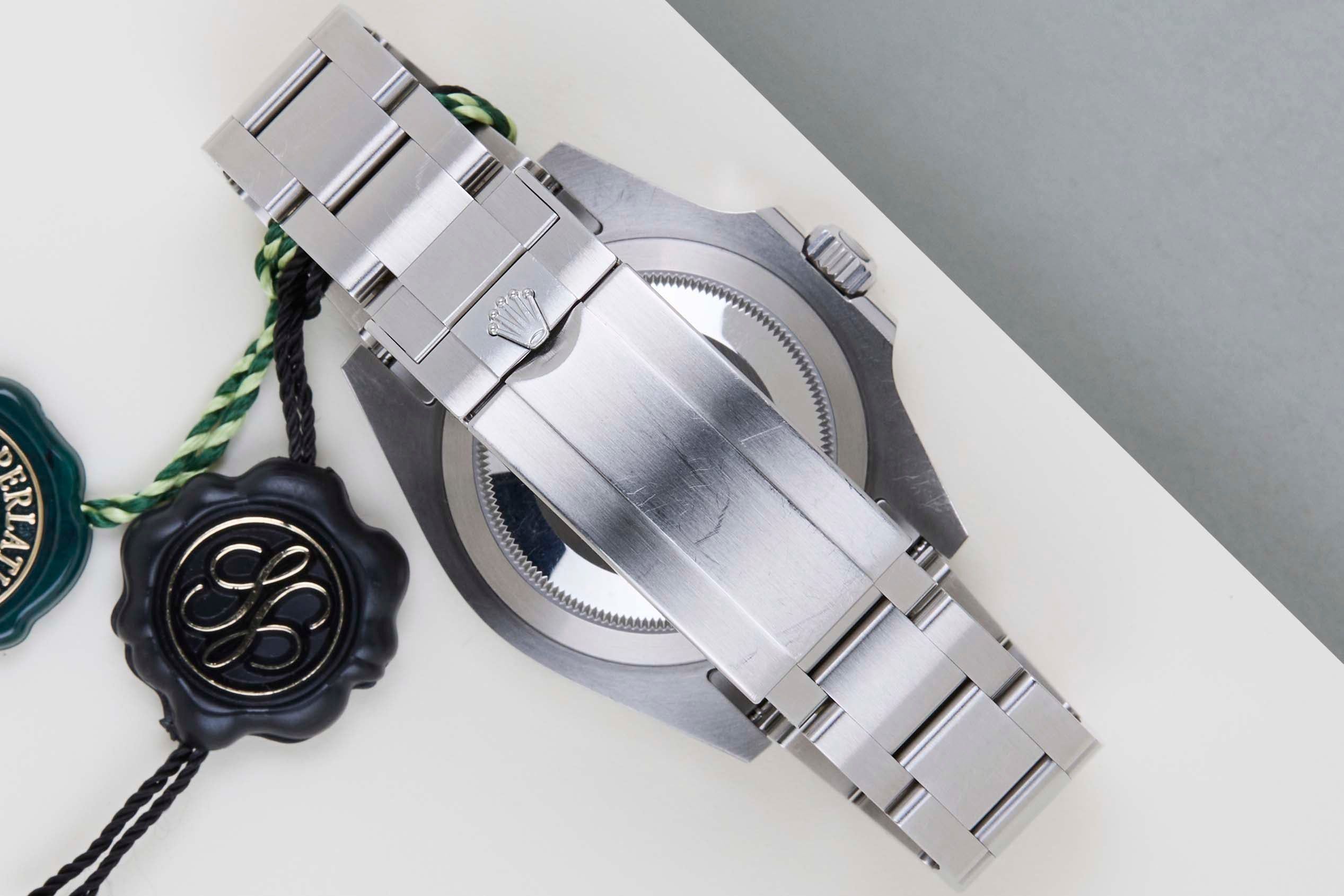 Die Uhr besteht vollständig aus Edelstahl. Rolex verwendet 904L in seinen Stahluhren, das ist eine extrem widerstandsfähige und hochpolierbare Superlegierung. Diese Rolex ist mit einer Chromalight-Wijzerplaat ausgestattet, die durch das blaue Leuchten erkennbar ist.