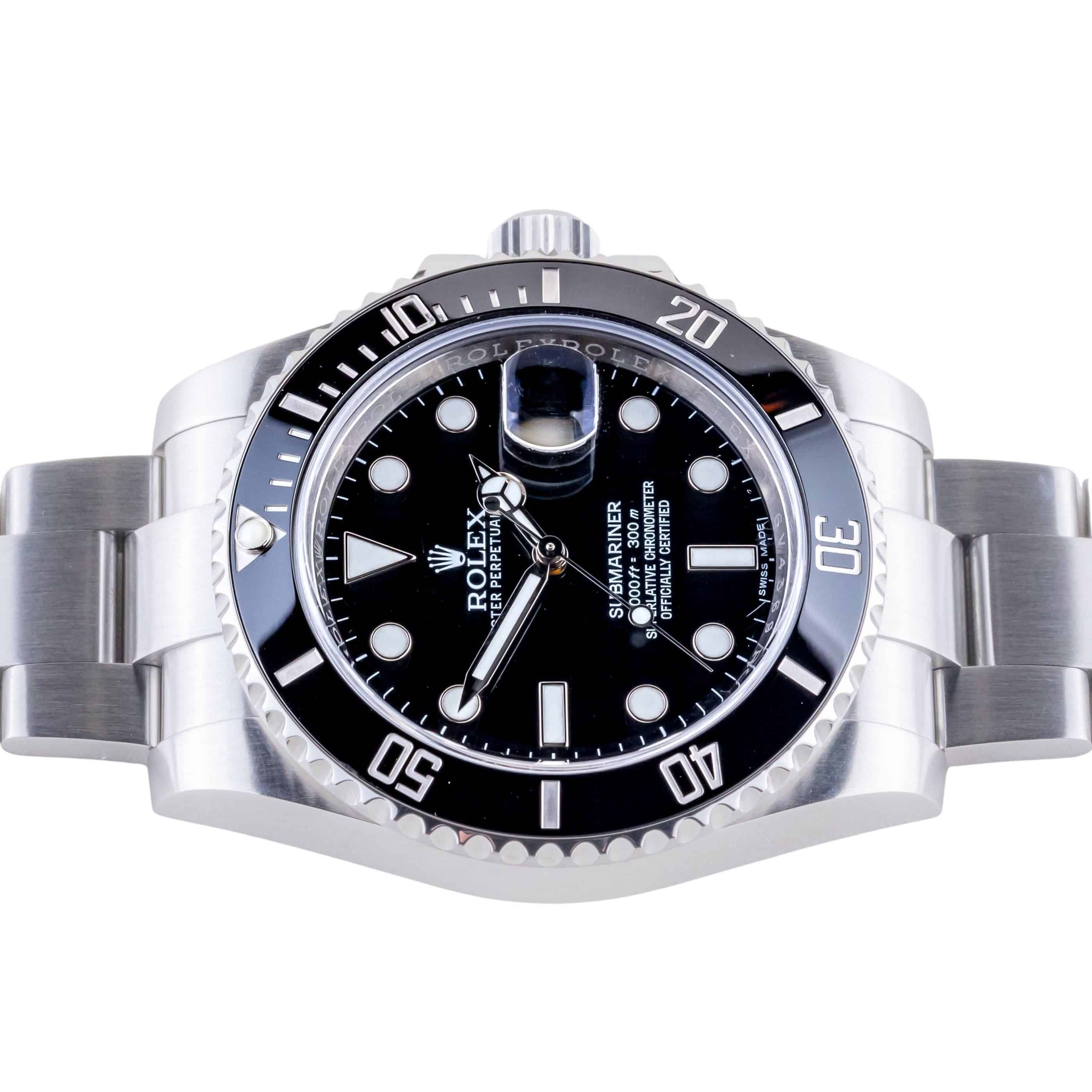 Rolex Oyster Perpetual Submariner Referenz 116610LN aus 2016 inklusive vollständigem Set. Die Submariner 116610LN hat ein 40 mm Gehäuse aus Edelstahl, ein Edelstahl-Oyster-Armband mit Fliplock-Schließe und eine schwarze drehbare Lünette. Die Submariner 116610LN verfügt über ein automatisches Kaliber 3135 mit Schnellverstellung für das Datum, ein kratzfestes Saphirglas und eine schwarze Zifferblatt mit Chromalight-Anzeige.