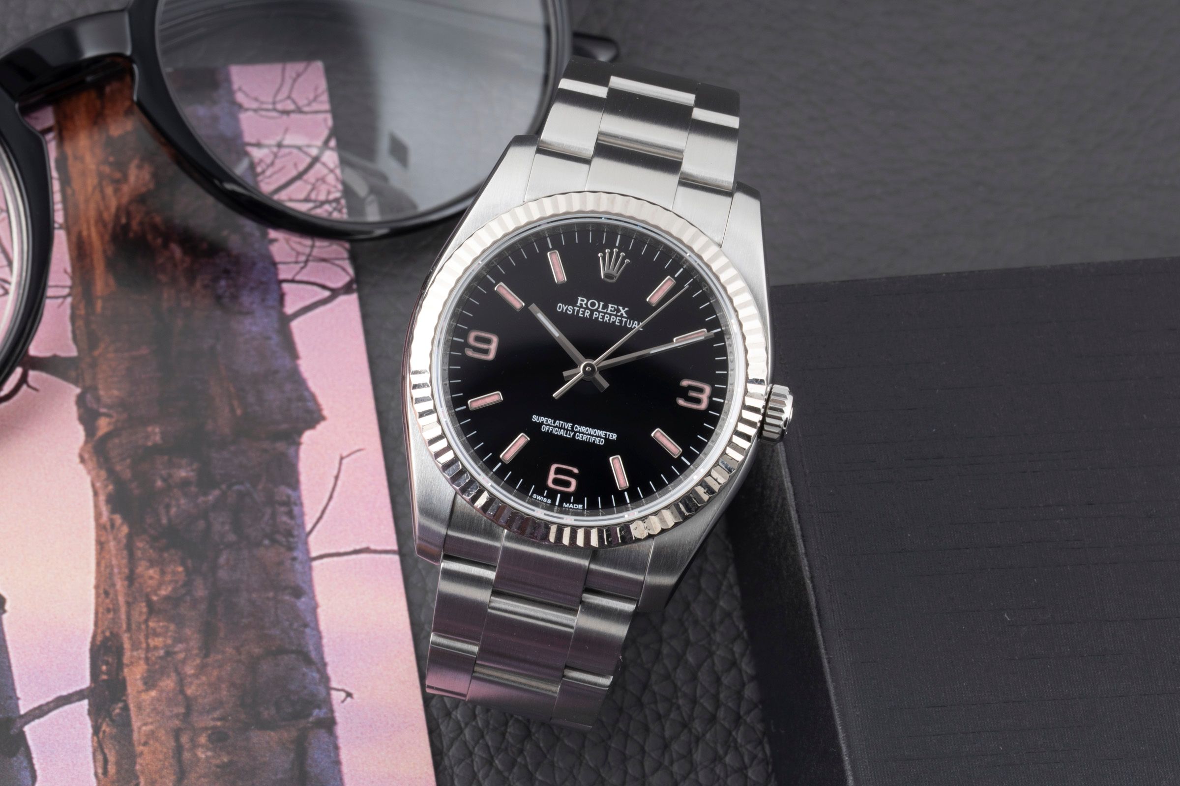 Alternative title: Rolex 116034 - Oyster Perpetual 36; Rolex Oyster Perpetual 36 Black Dial Stahl Weissgold Herrenuhr Ref. 116034 B&P [2601047]
