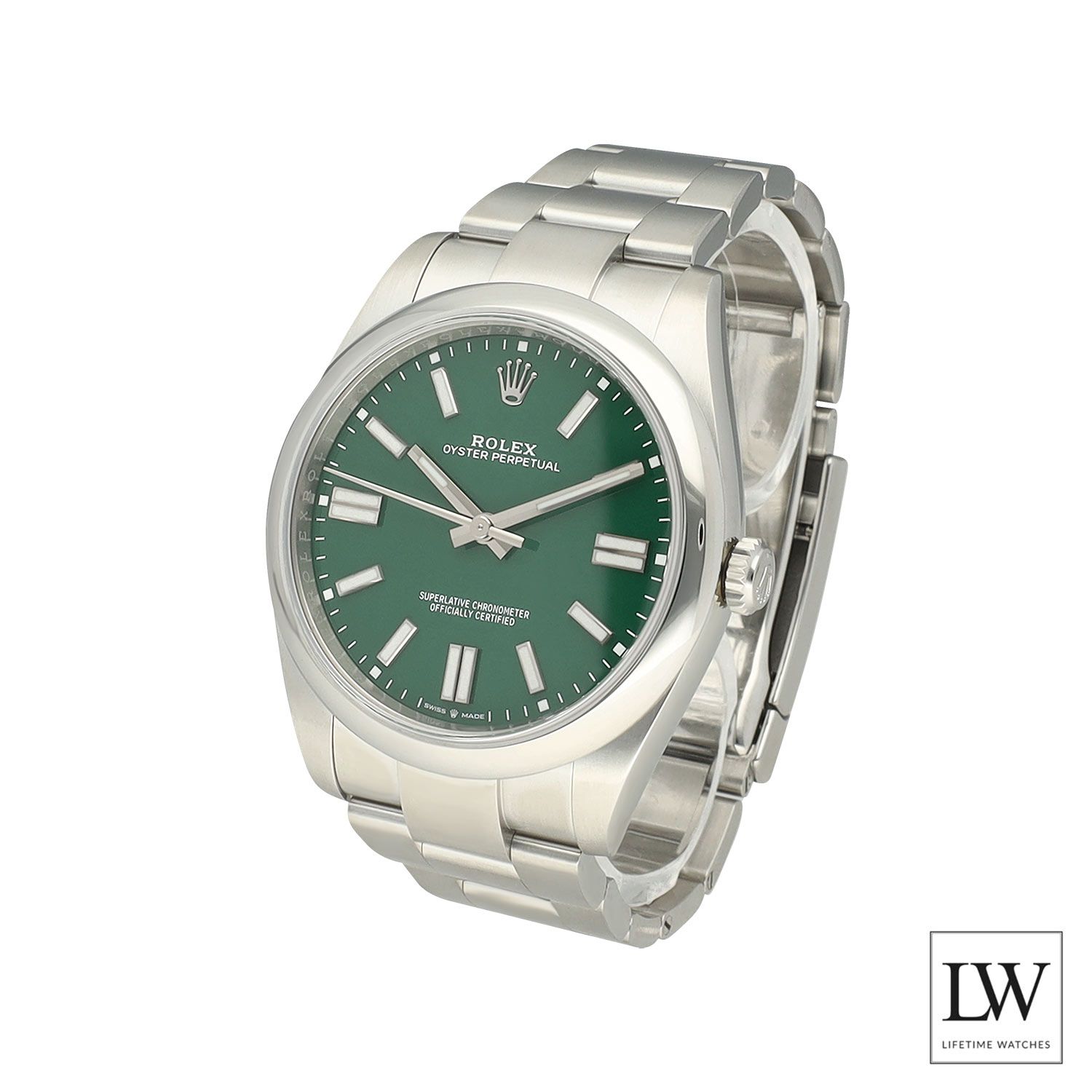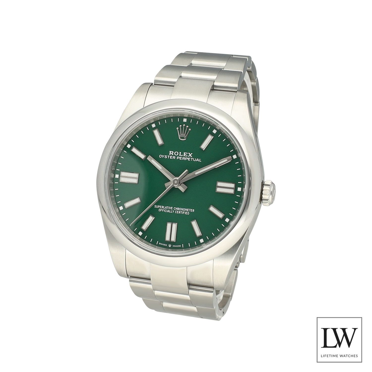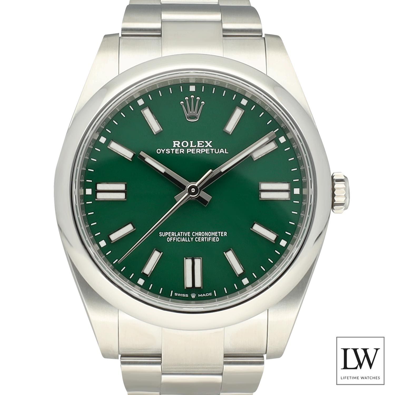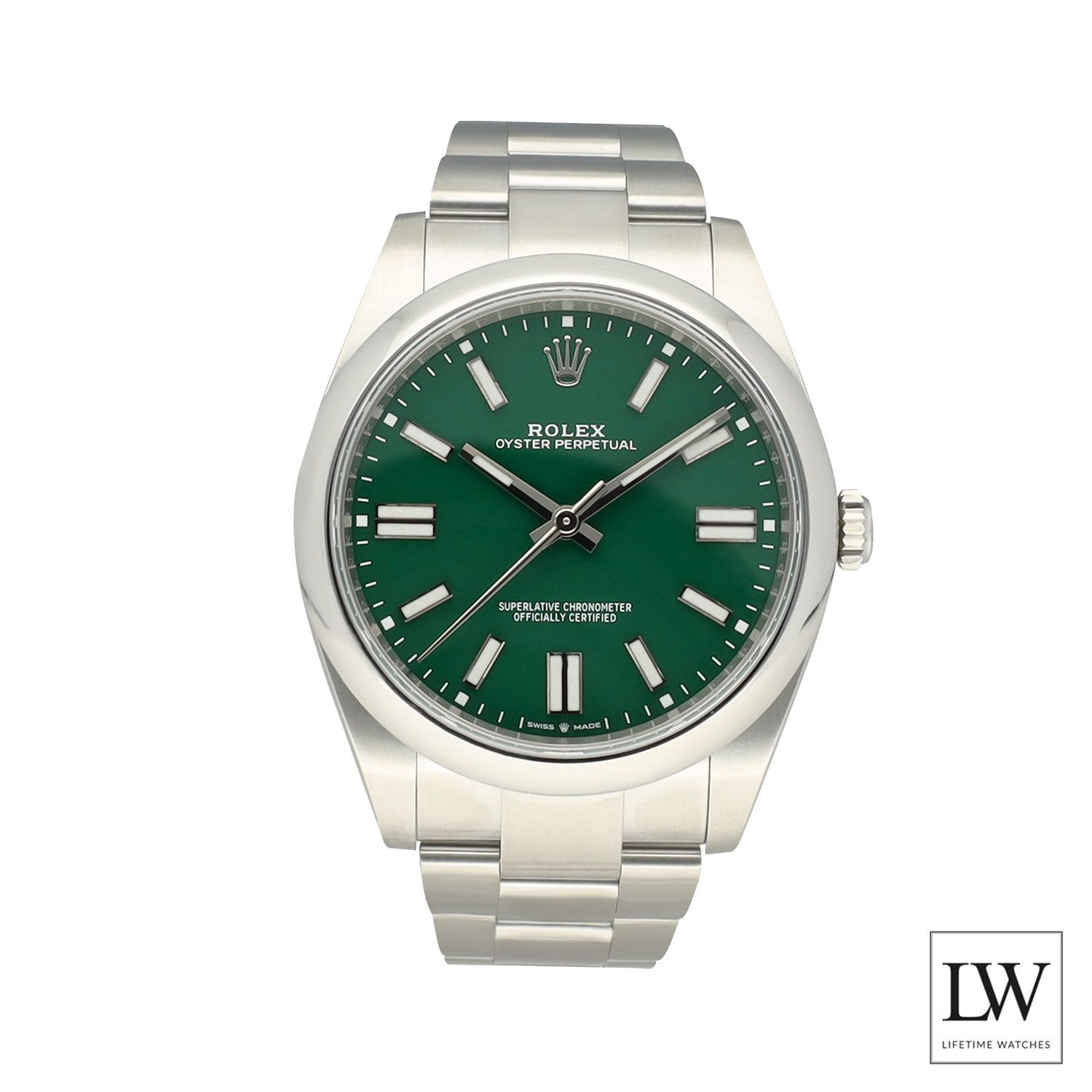 The watch features a 41 mm case crafted entirely from robust Oystersteel, paired with a smooth bezel and the solid link Oyster bracelet. This combination ensures durability, comfort, and versatility, making it ideal for both casual and formal occasions. The clean no date configuration preserves the symmetry and purity of the dial.