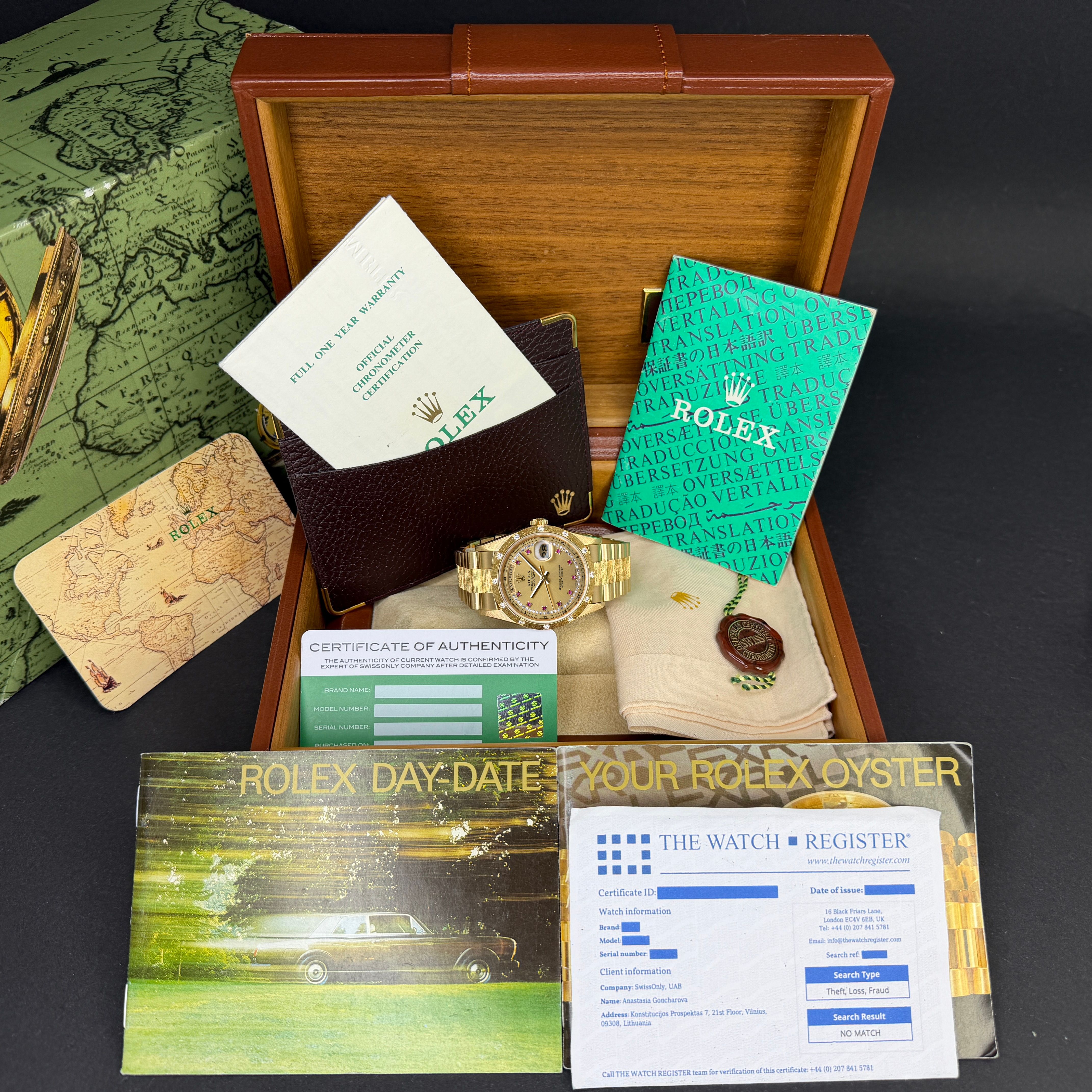 This Rolex Day-Date features a Champagne ruby diamond dial and is crafted from 18K yellow gold, with a production year of 1991.Case No: N14XXXX