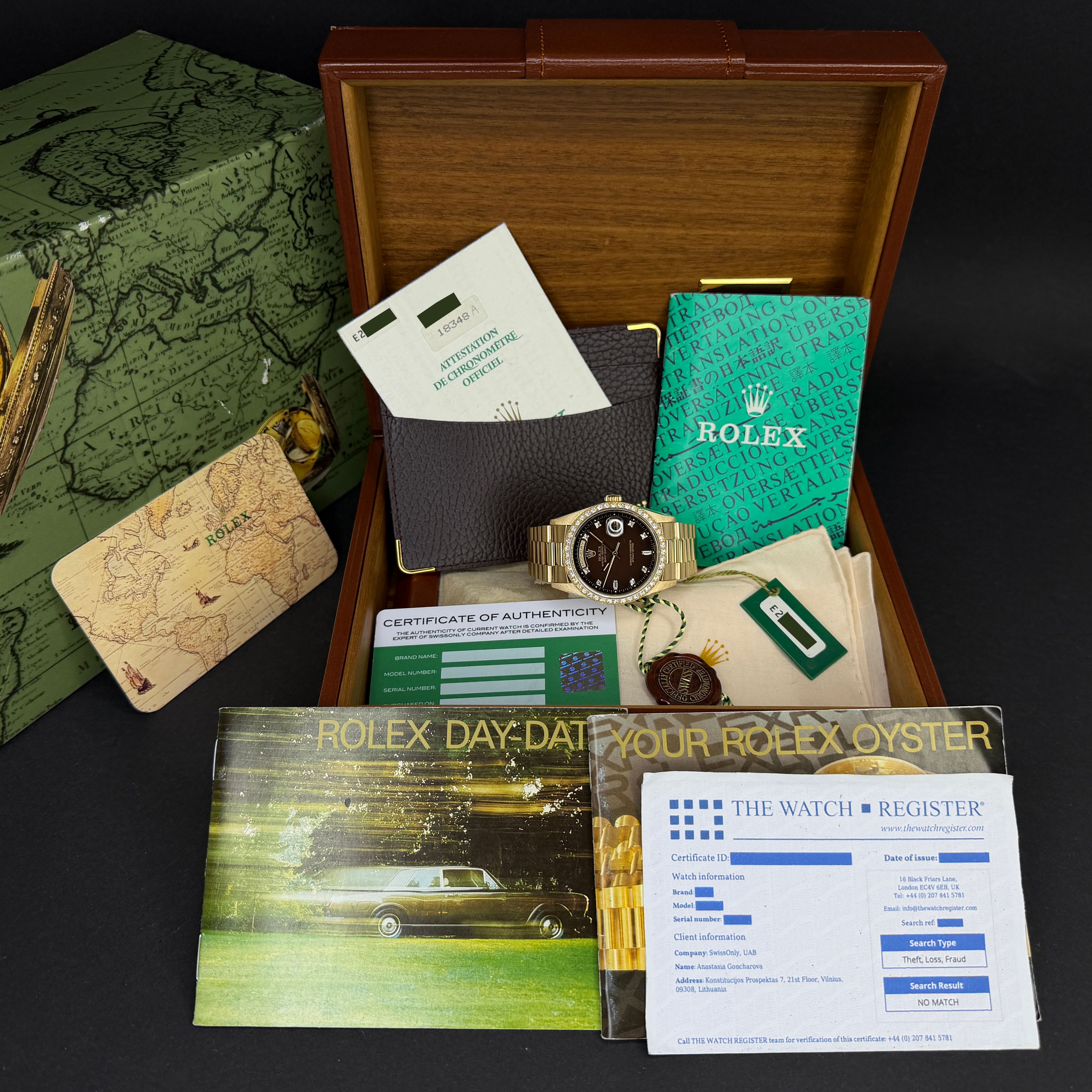 This Rolex Day-Date 18348 features a Brown vignette diamond small dial and is crafted from 18K yellow gold, with a production year of 1990.Case No: E20XXXX