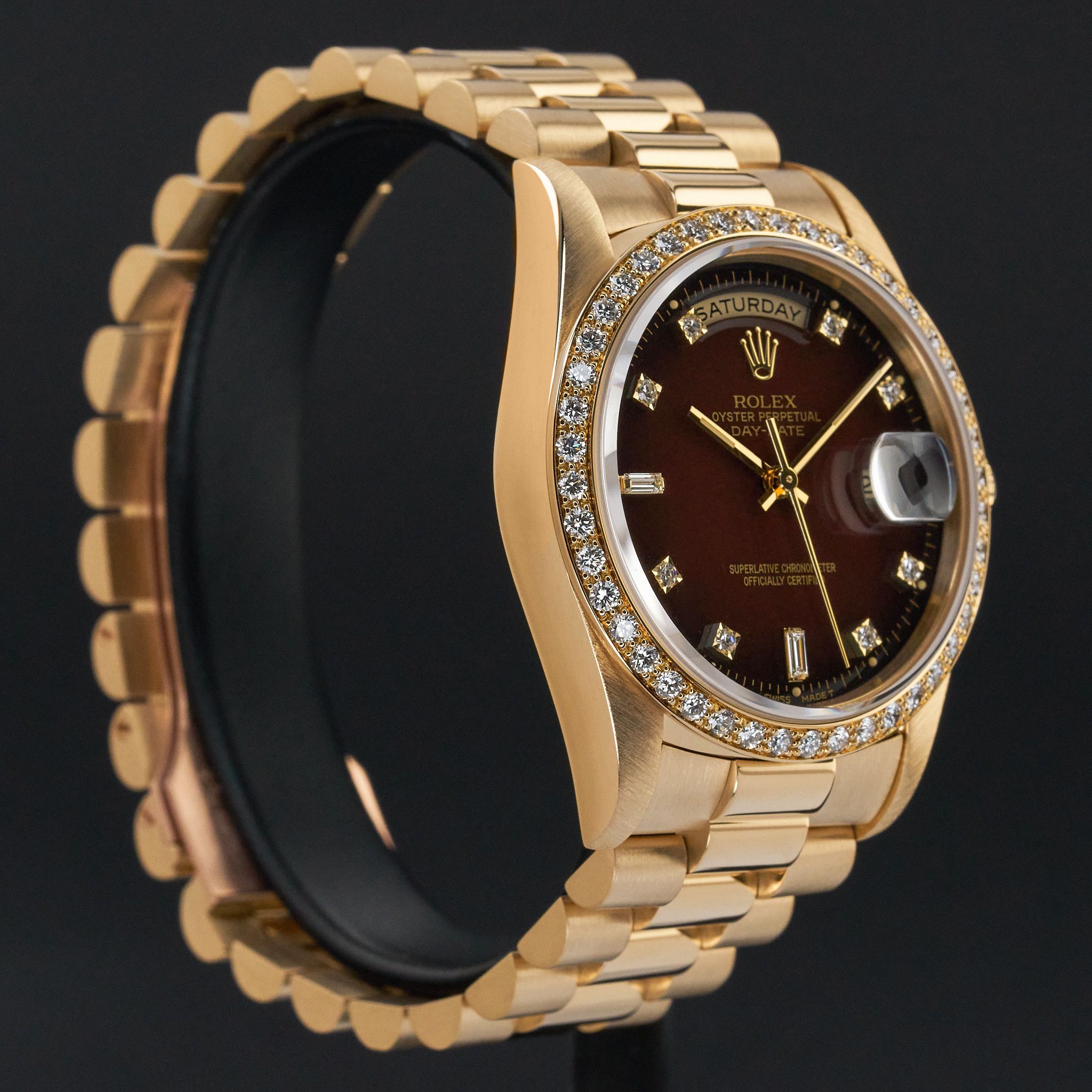 Diese Rolex Day-Date 18348 verfügt über eine braune Vignette-Diamantkleinanzeige und ist aus 18K Gelbgold gefertigt, mit einem Produktionsjahr von 1990.