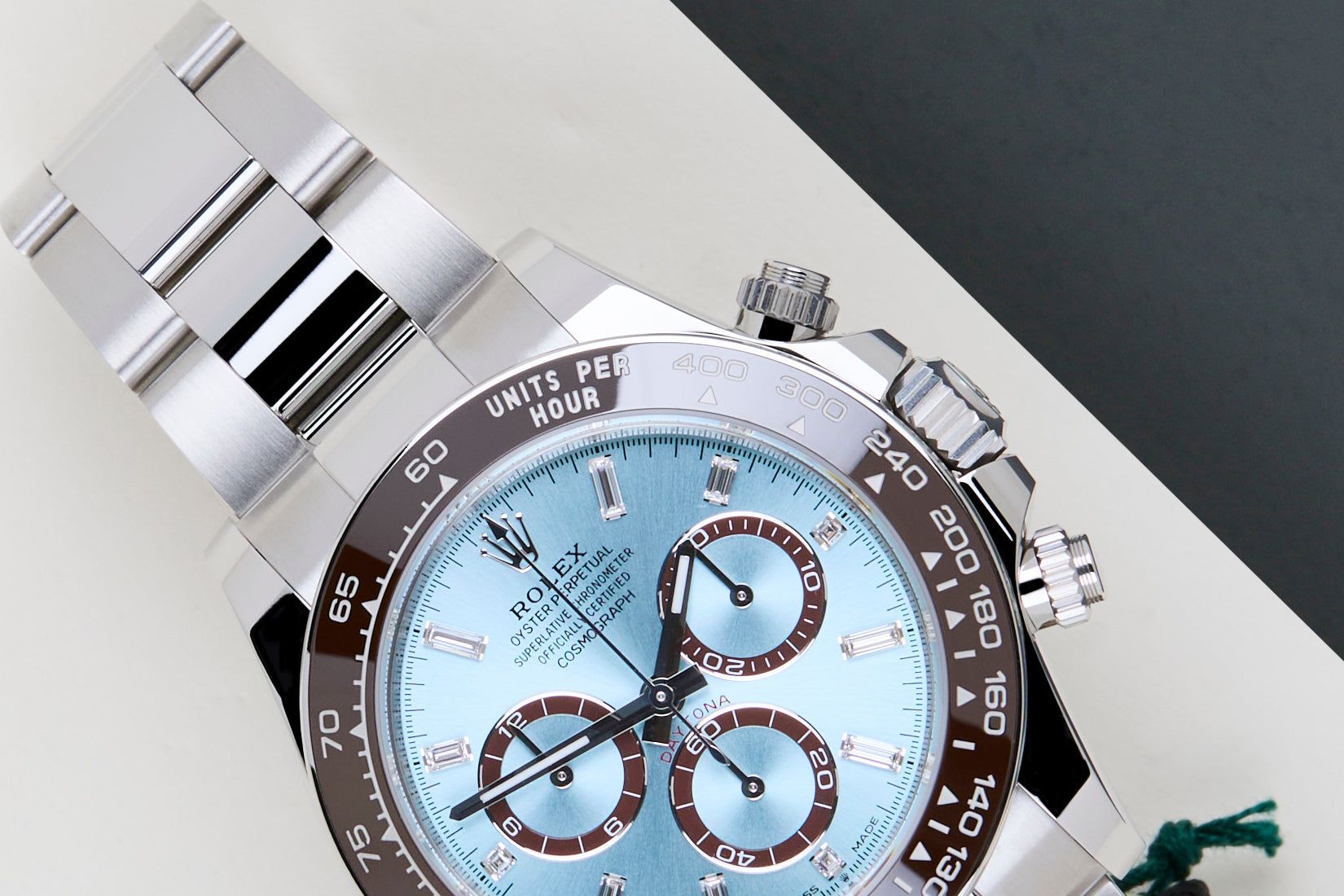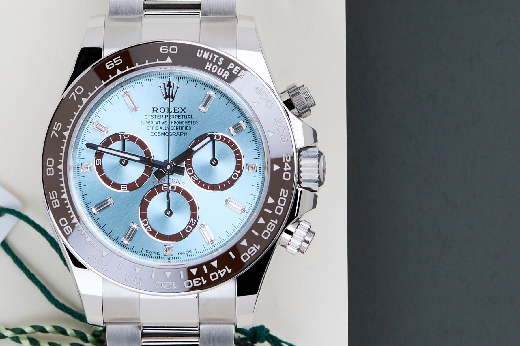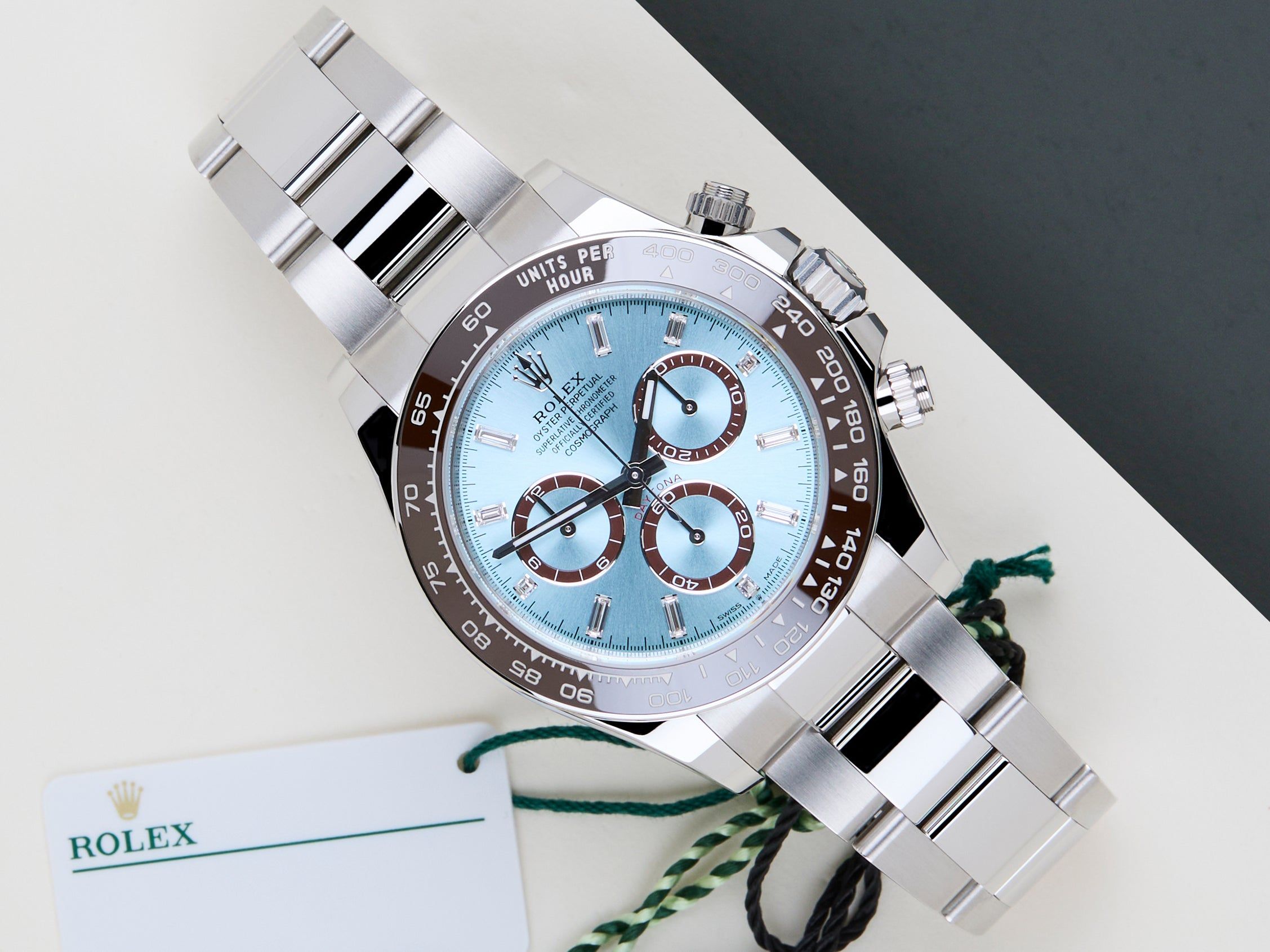 New & Unworn | Full Set | Including Rolex White Tag | International Rolex Warranty Until February 2031The Rolex Cosmograph Daytona is considered one of the most popular models in the world. The reasons for this vary from the watch's history in timekeeping, racing and the love it evoked amongst timepiece enthusiasts, to the huge demand for both the current and the vintage references.This particular model, the Rolex Daytona 126506, is crafted entirely from 950 platina, it features a 40mm case, chestnut brown cerachrom bezel, and Oyster bracelet. The Ice Blue Baguette Diamond dial is adorned with white gold hour markers and hands, enhanced by Chromalight luminescence for optimal readability in low light. The tachymetric scale engraved on the bezel underscores its racing roots. This Rolex Daytona 126506 has a Saphire caseback. This exceptional Rolex Daytona is New & Unworn and comes with the original Rolex Warranty Card and Box. Furthermore, the watch still has International Rolex Warranty until February 2031.
