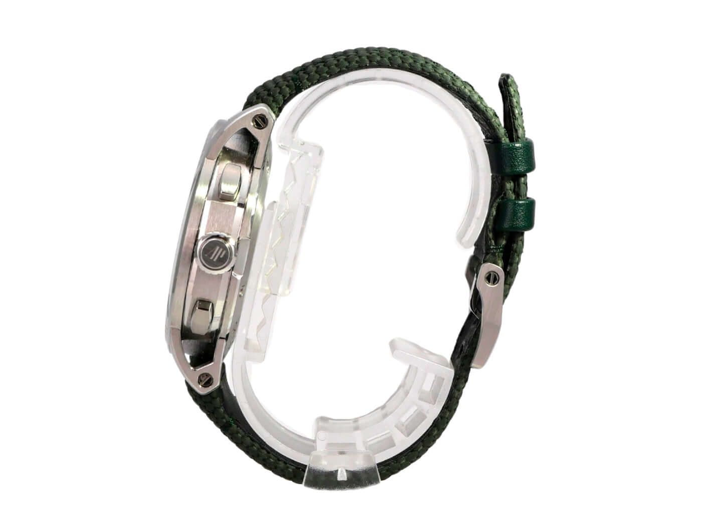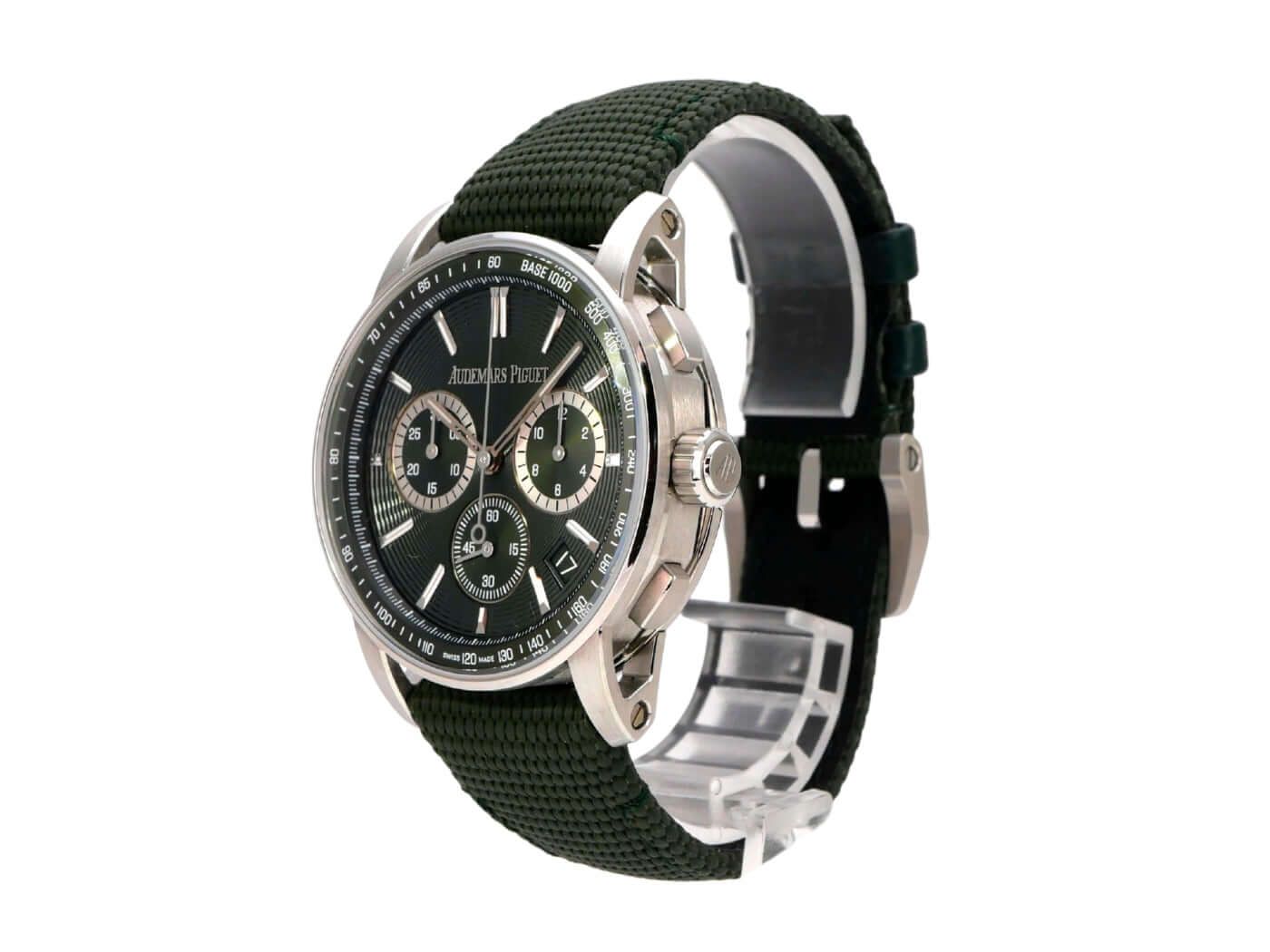 Audemars Piguet Code 11.59 Chronograph 26393ST.OO.A056KB.01Case made of polished and satin-finished stainless steel, case diameter 41 mm, case height 12.6 mm, polished stainless steel bezel, rubber strap with pin buckle, green dial with indices, tachymeter scale, automatic movement, manufacture caliber 4401 with 40 jewels, frequency 28,800 vibrations per hour, power reserve of approximately 70 hours, date display, anti-reflective sapphire crystal, exhibition case back, water-resistant up to 3 bar.