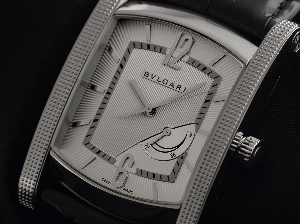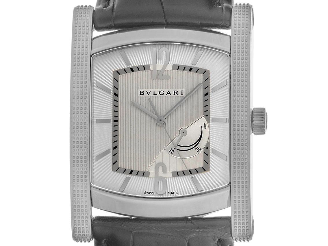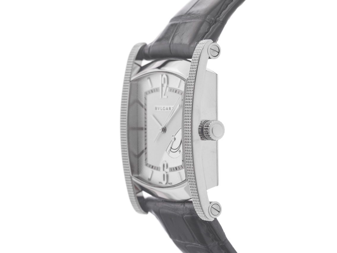 Gehäuse 18kt Weißgold poliert, rechteckig, Gehäusemaße ohne Krone (L x B x H) 47,7 x 36,7 x 10,2mm. Bulgari Armband Krokoleder schwarz mit Ziernaht, Anstoßbreite 29mm, Bulgari Faltschließe 18kt Weißgold mit Hersteller-Logo. Zifferblatt silberfarben mit aufgesetzten polierten Indexen und arabischen Ziffern sowie polierten Zeigern. Uhrwerk Handaufzug, Kaliber 1103.4 mit 21 Edelsteinen. Anzeige von Stunde, Minute und Sekunde über Zeiger aus der Mitte mit Sekundenstopp zur sekundengenauen Einstellung der Uhrzeit, Gangreserveanzeige zwischen 3 und 5 Uhr. Saphirglas kratzfest und gewölbt. Krone geriffelt. Boden 18kt Weißgold 6-fach verschraubt und graviert mit Saphirglas Sichtfenster. Gewicht der Uhr inklusive Armband 126g. Referenznummer: AAW48WGL, Gehäusenummer: L0XXX, ID: KH1786140000226H-15800, Artikelnummer: 10000084617. Mit Gangkontrolle und kompletter äußerlicher Aufarbeitung von Februar 2026. Original Bulgari Box und Garantie Papiere von Dezember 2011 sowie Beschreibung und Watchregister Auszug von Januar 2026, The Watch Register Zertifikat / ohne Eintrag (Internationale Datenbank für verlorene oder gestohlene Uhren), Full Set. Superschnäppchen, aus erster Hand, fast nicht getragen. Wie Neu. Lieferzeit sofort.