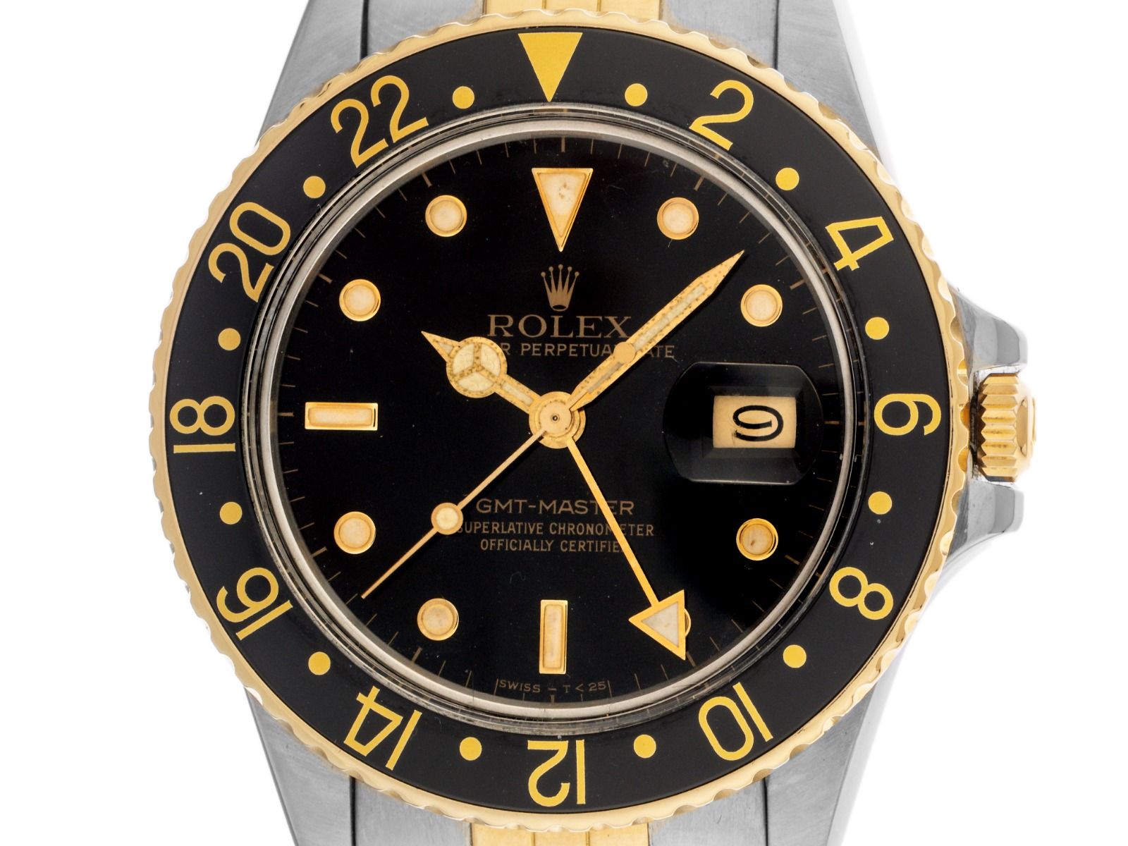 Gehäuse aus poliertem und satiniertem Edelstahl, Gehäusedurchmesser ohne Krone 40mm, Gehäusehöhe 12,8mm. Lünette aus 18kt Gelbgold mit schwarzem Inlay und 24-Stunden Skala, Flat 4, beidseitig drehbar. Armband Jubilé aus Edelstahl / 18kt Gelbgold, poliert und satiniert, Rolex Faltschließe aus Edelstahl mit Hersteller-Logo. Zifferblatt schwarz mit "SWISS - T < 25" Aufschrift, aufgesetzten in Gelbgold gefassten Indexen und Punkten sowie gelbgoldenen Zeigern. Uhrwerk Automatik, Chronometer, Rolex Manufakturkaliber 3075 mit 27 Edelsteinen. Anzeige von Stunde, Minute und Sekunde über Zeiger aus der Mitte mit Sekundenstopp zur sekundengenauen Einstellung der Uhrzeit, Datumsanzeige mit Schnellverstellung unter Glaslupe bei 3 Uhr, open 6/9 (offene 6 und 9 in der Datumsanzeige). Zweite Zeitzone (GMT) ablesbar über Lünette, einstellbar über gelbgoldenen Zeiger mit Spitze aus der Mitte. Plexiglas gewölbt. Krone verschraubbar mit Flankenschutz und Hersteller-Logo. Boden aus Edelstahl verschraubt. Gewicht der Uhr inklusive Armband 108g, Länge des Armbandes inklusive Gehäuse 190mm. Referenznummer: 16753, Gehäusenummer: 8218XXX, Baujahr: 1984, ID: KH1815160000326H-14200, Artikelnummer: 10000085078. Mit Gangkontrolle. Original Rolex Box mit Umkarton und Beschreibung sowie Ledermäppchen, Übersetzungsheft, Rolex Chronometer-Siegel und Watchregister Auszug von März 2026, The Watch Register Zertifikat / ohne Eintrag (Internationale Datenbank für verlorene oder gestohlene Uhren). Superschnäppchen, Kapitalanlage mit Wertsteigerungspotential, extrem seltenes Sammlerstück. Sehr guter Zustand. Lieferzeit sofort.