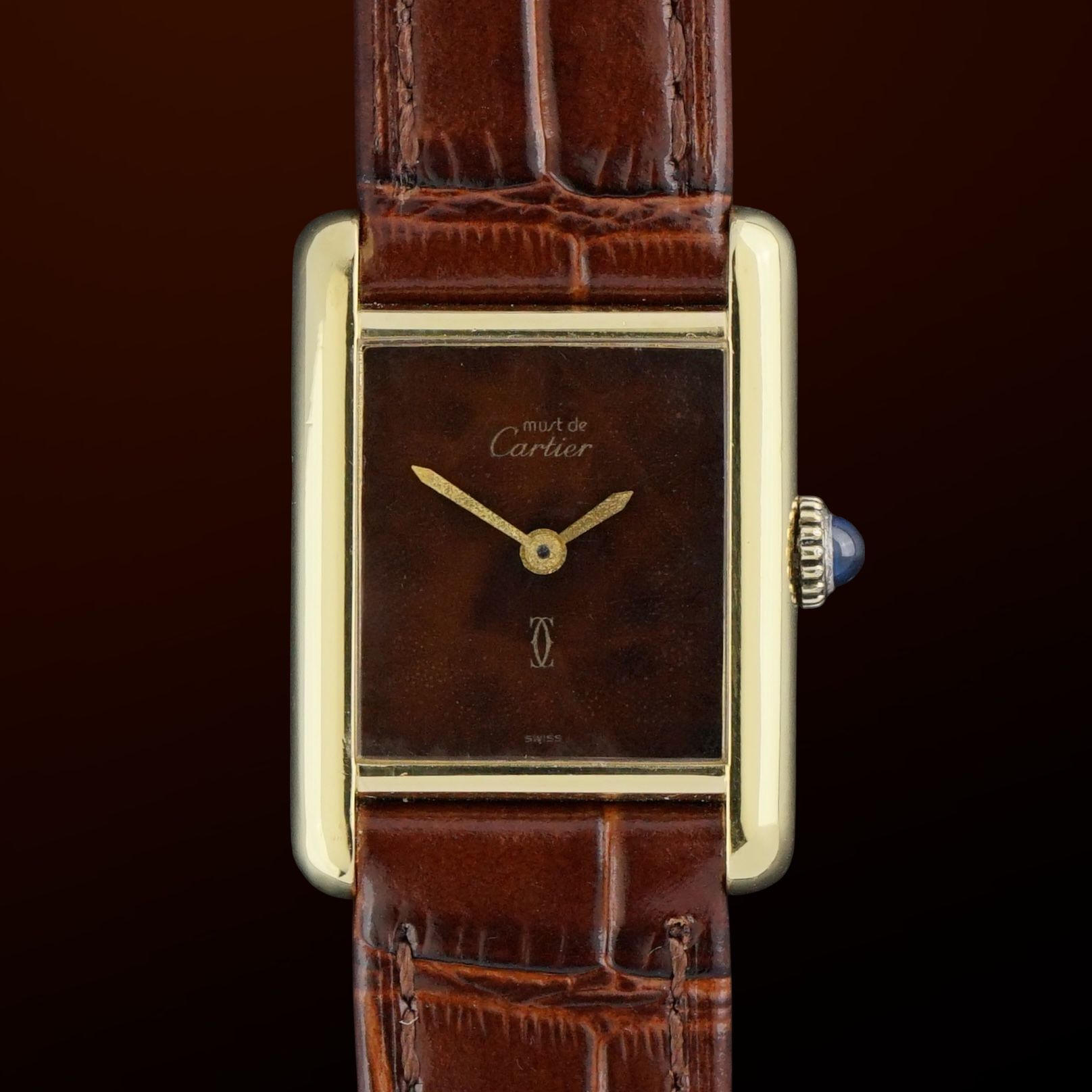 Vintage Cartier Tank Vermeil, produziert in den 1990er Jahren. Diese Uhr verfügt über eine wunderschöne und einzigartige Holz-ähnliche Zifferblatt mit einem subtilen Spinneneffekt, der nur aus bestimmten Lichtwinkeln sichtbar ist. Der tiefe, reiche Holzton kontrastiert wunderschön mit den goldenen Zeigern und dem vergoldeten Gehäuse.