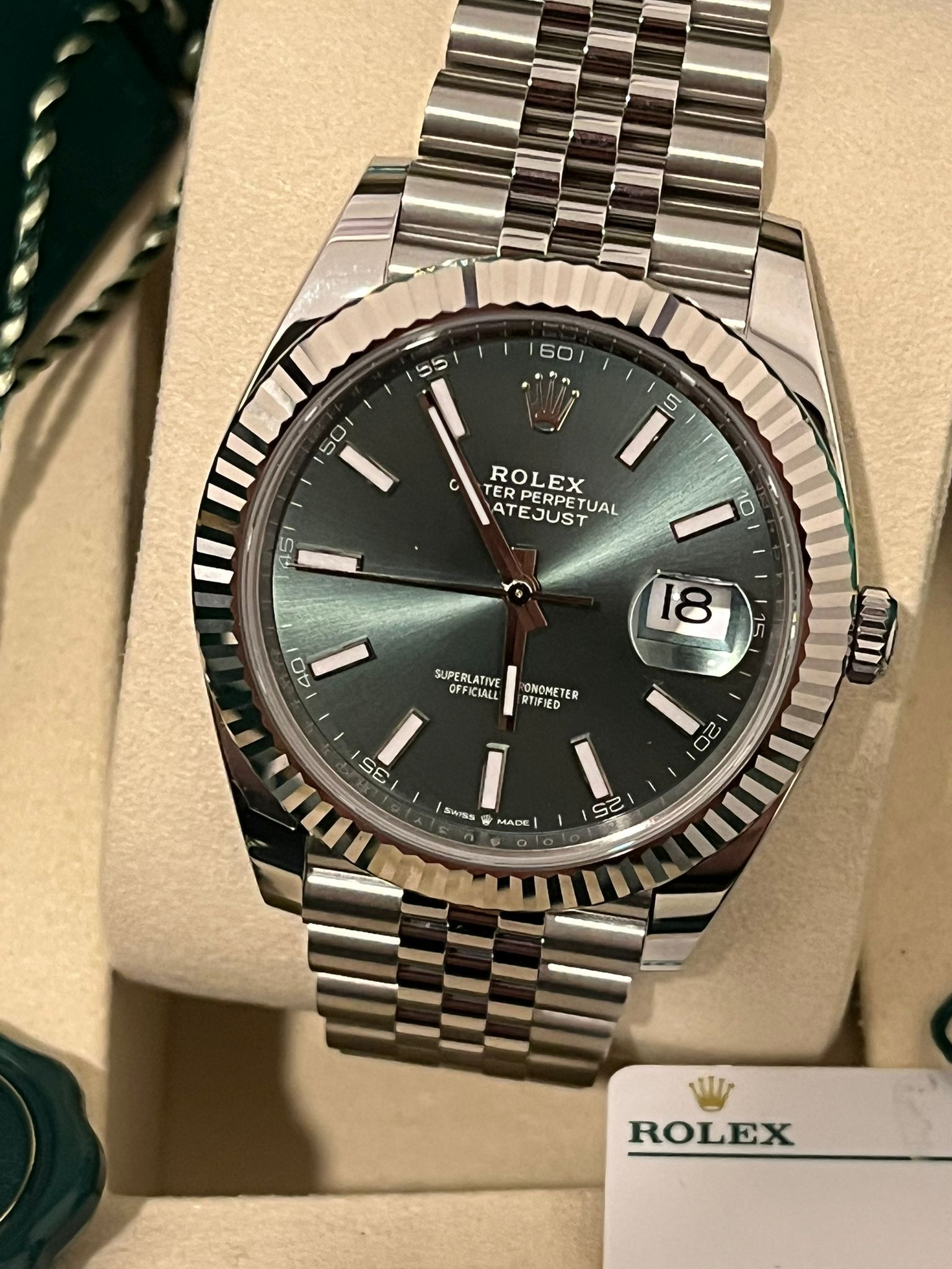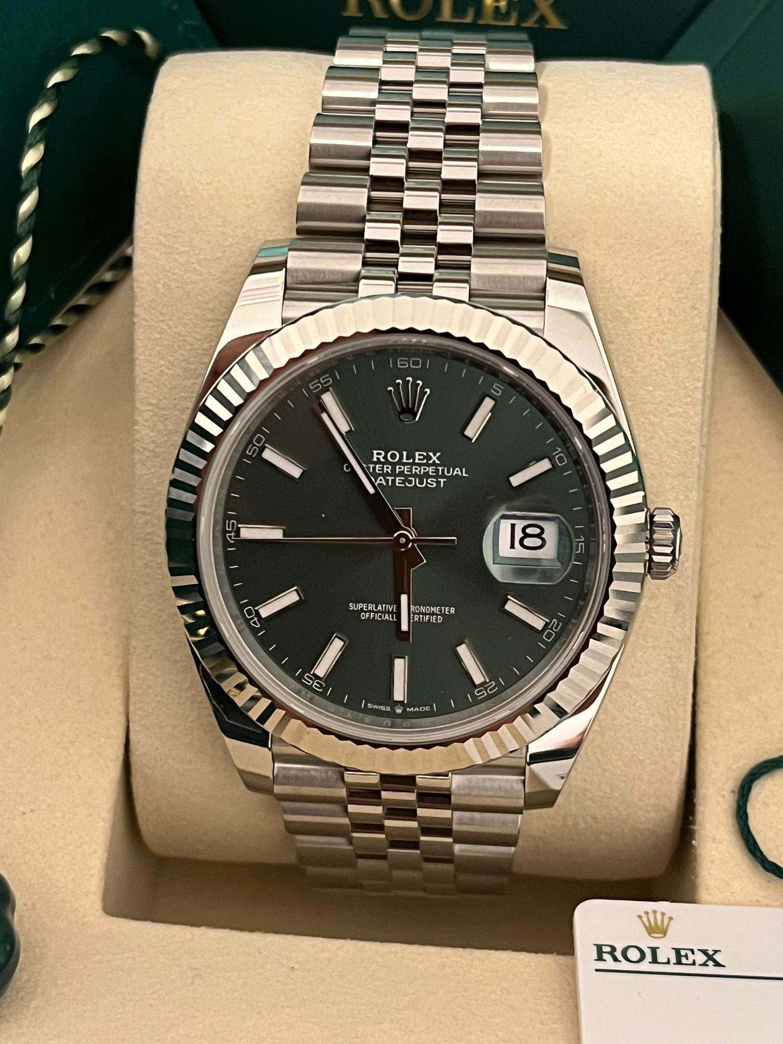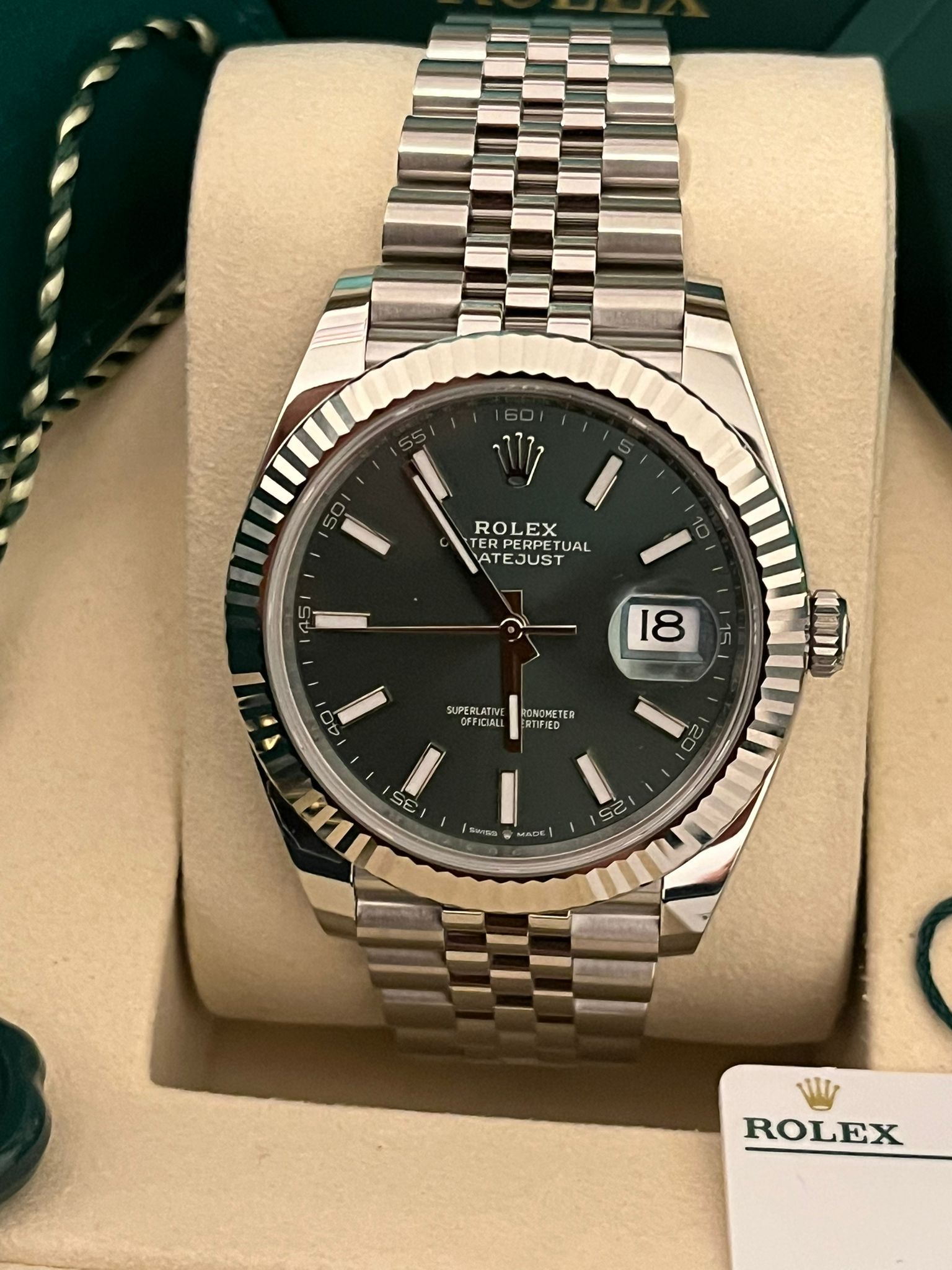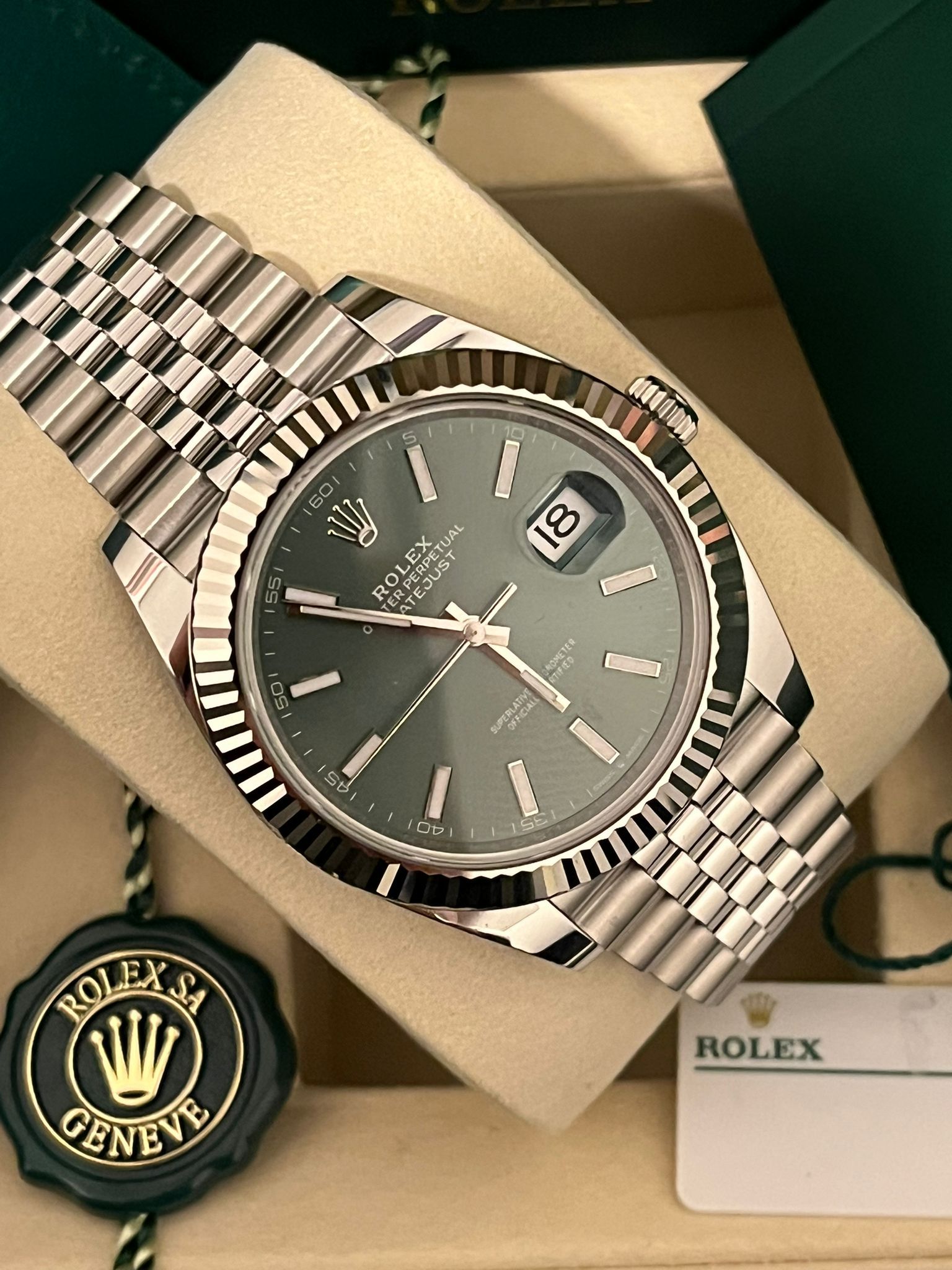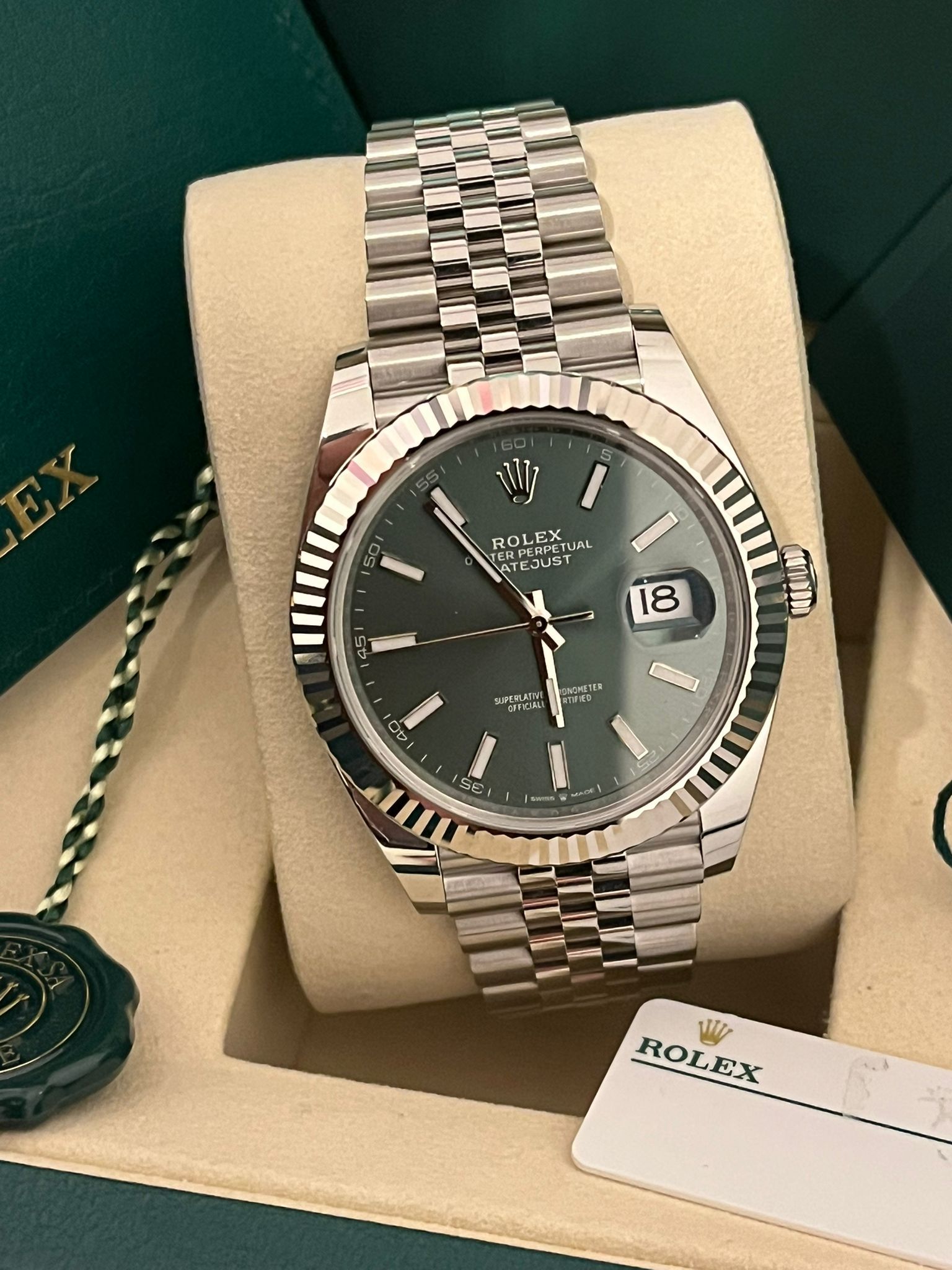Diese auffällige Rolex Datejust 41 Ref. 126334 wird mit dem äußerst begehrten grünen Zifferblatt und der ikonischen, fluted Lünette aus Weißgold präsentiert – eine der bekanntesten und gefragtesten Konfigurationen innerhalb der Datejust-Kollektion. Die Kombination aus dem 41 mm Oyster-Gehäuse aus Oystersteel, der eleganten fluted Lünette aus Weißgold und dem klassischen Jubilee-Armband ergibt ein perfekt ausgewogenes Zeitmesser, das das zeitlose Design und die verfeinerte Ästhetik von Rolex verkörpert.