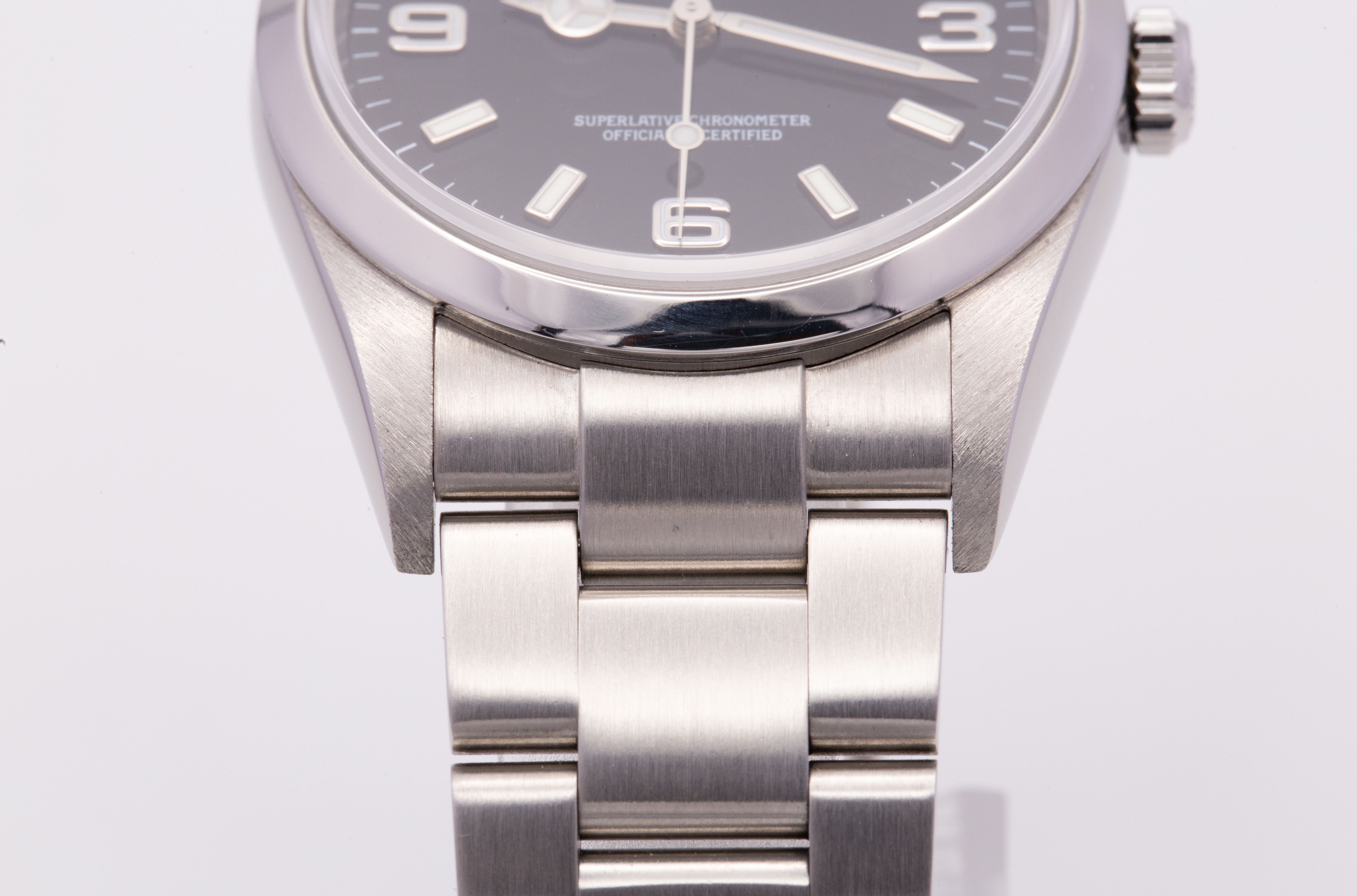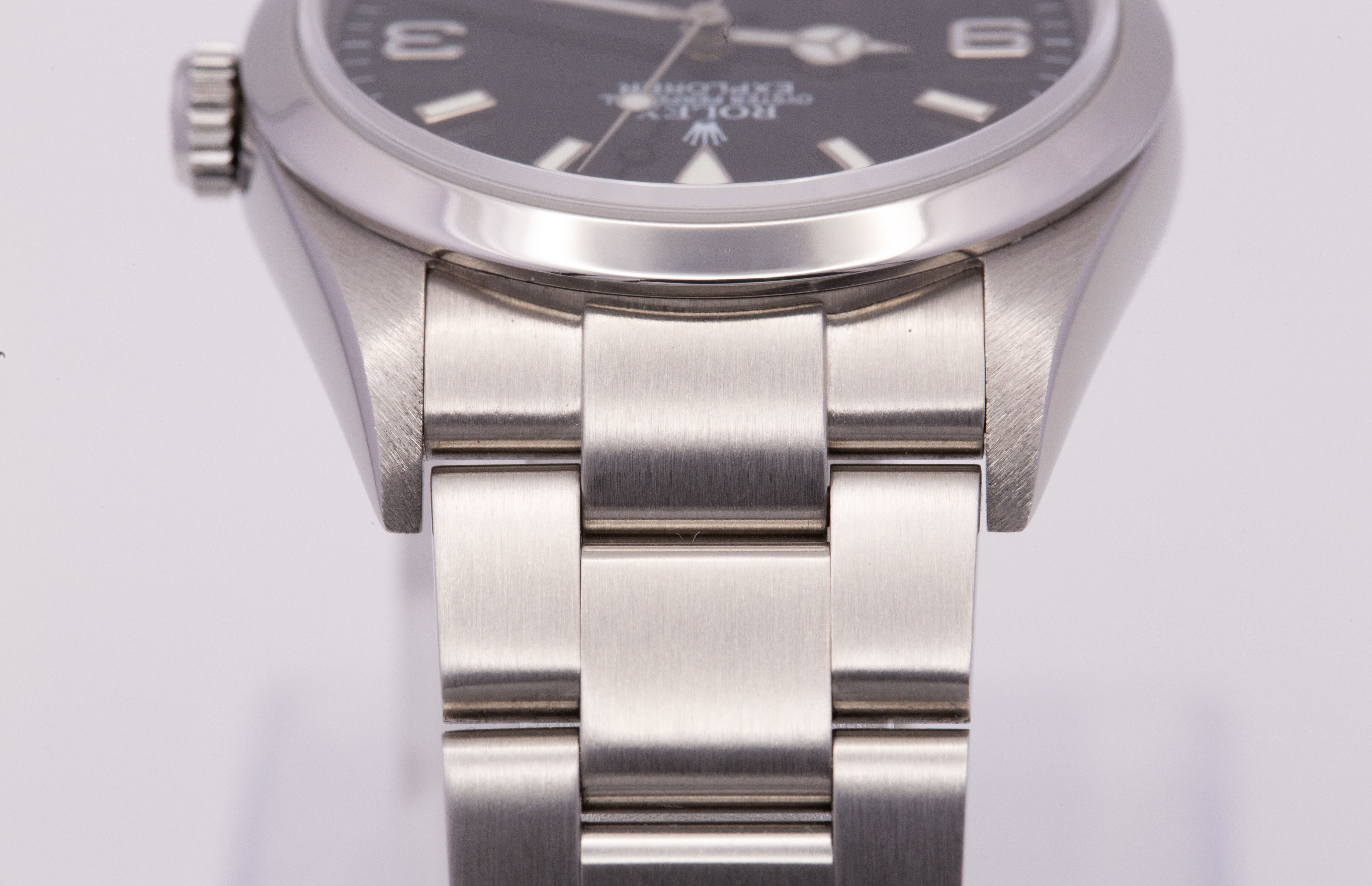 Zum Verkauf steht eine Rolex Explorer I Ref. 114270 aus dem Jahr 2005 im Fullset sowie mit frisch durchgeführter Revision.Das Gehäuse befindet sich in einem außergewöhnlich guten Erhaltungszustand. Die Hörner sind klar definiert, der ursprüngliche Schliff ist deutlich erkennbar und die Kanten sind sauber ausgeprägt. Es sind lediglich minimale, altersgerechte Tragespuren vorhanden. Die Wasserdichtigkeit wurde erfolgreich auf 10 bar geprüft.