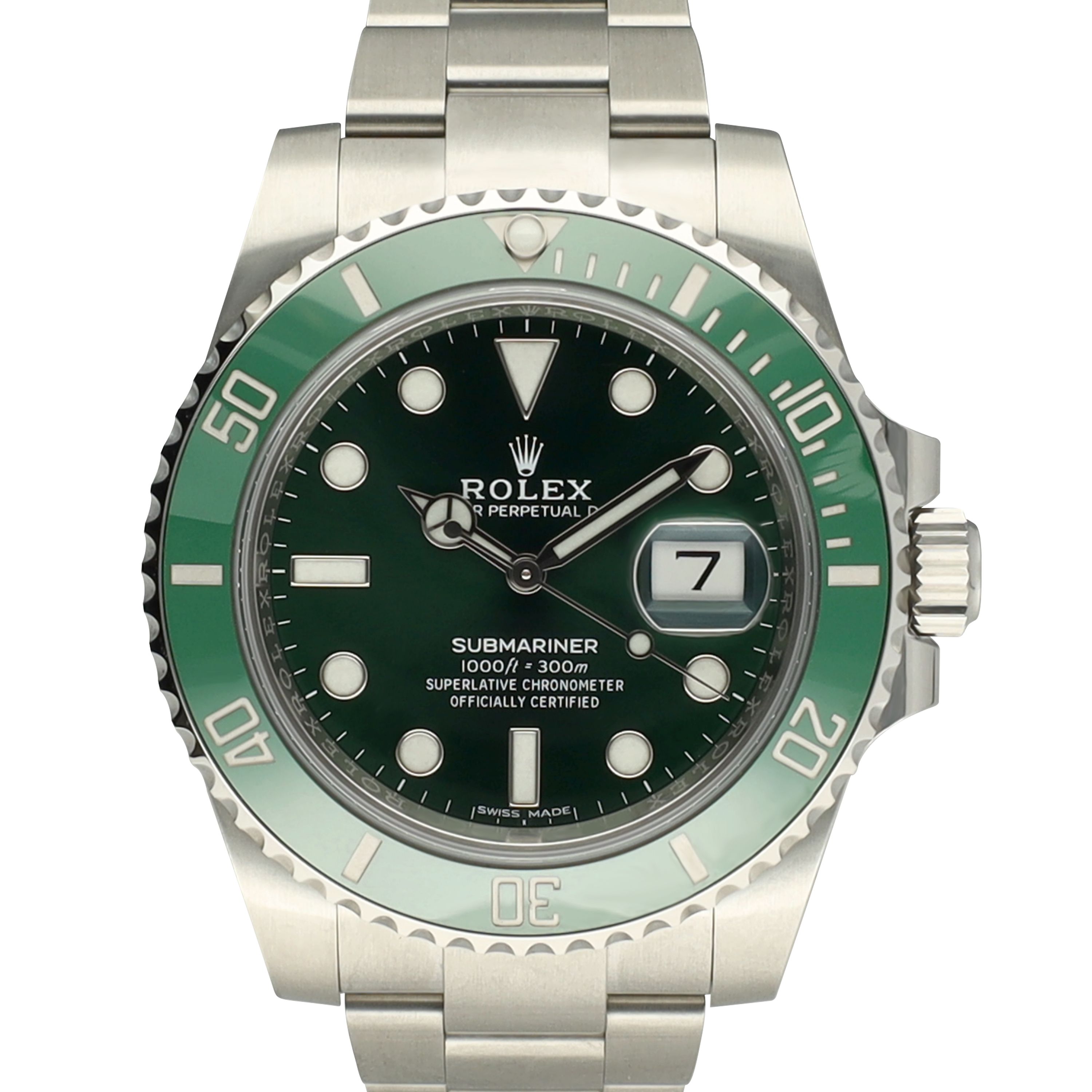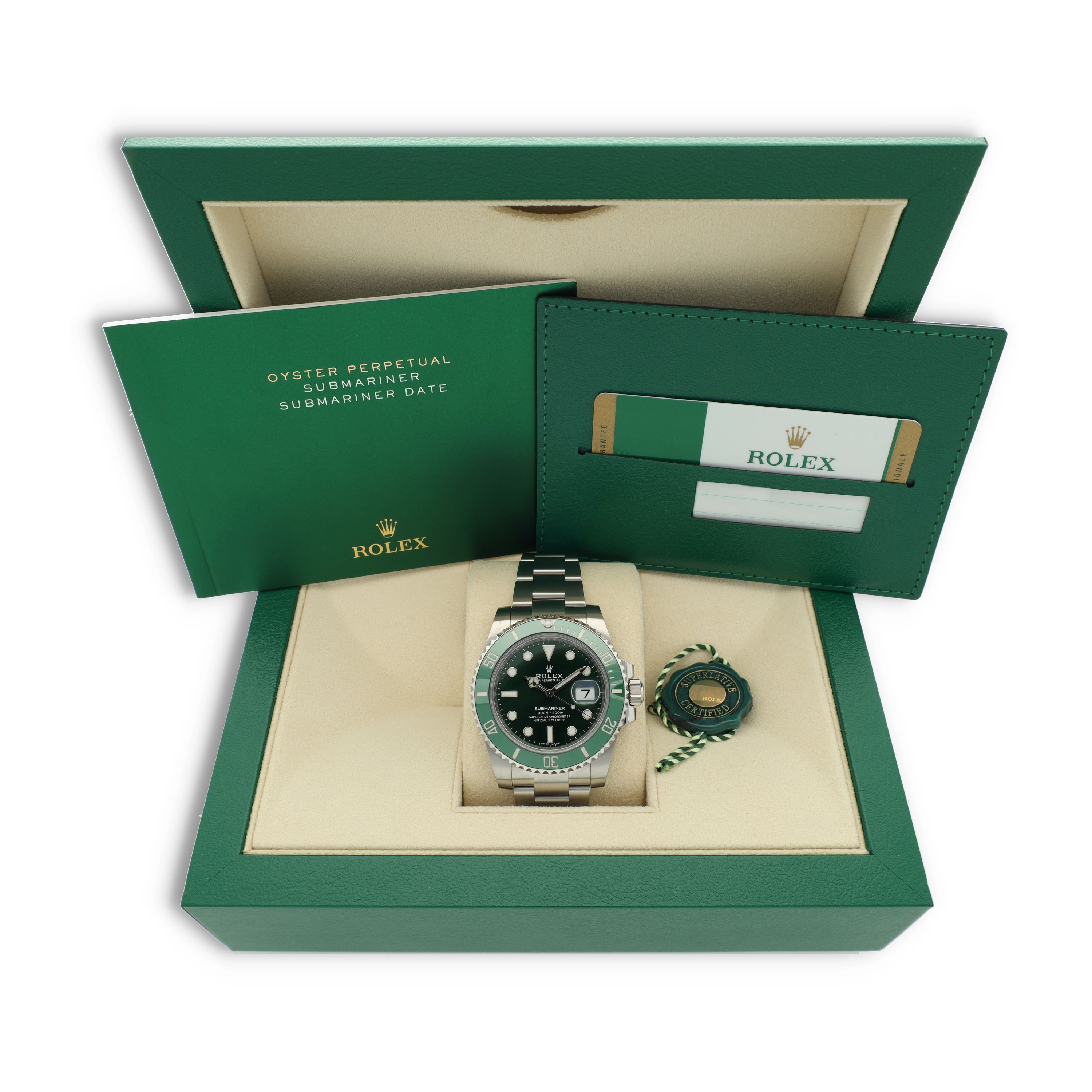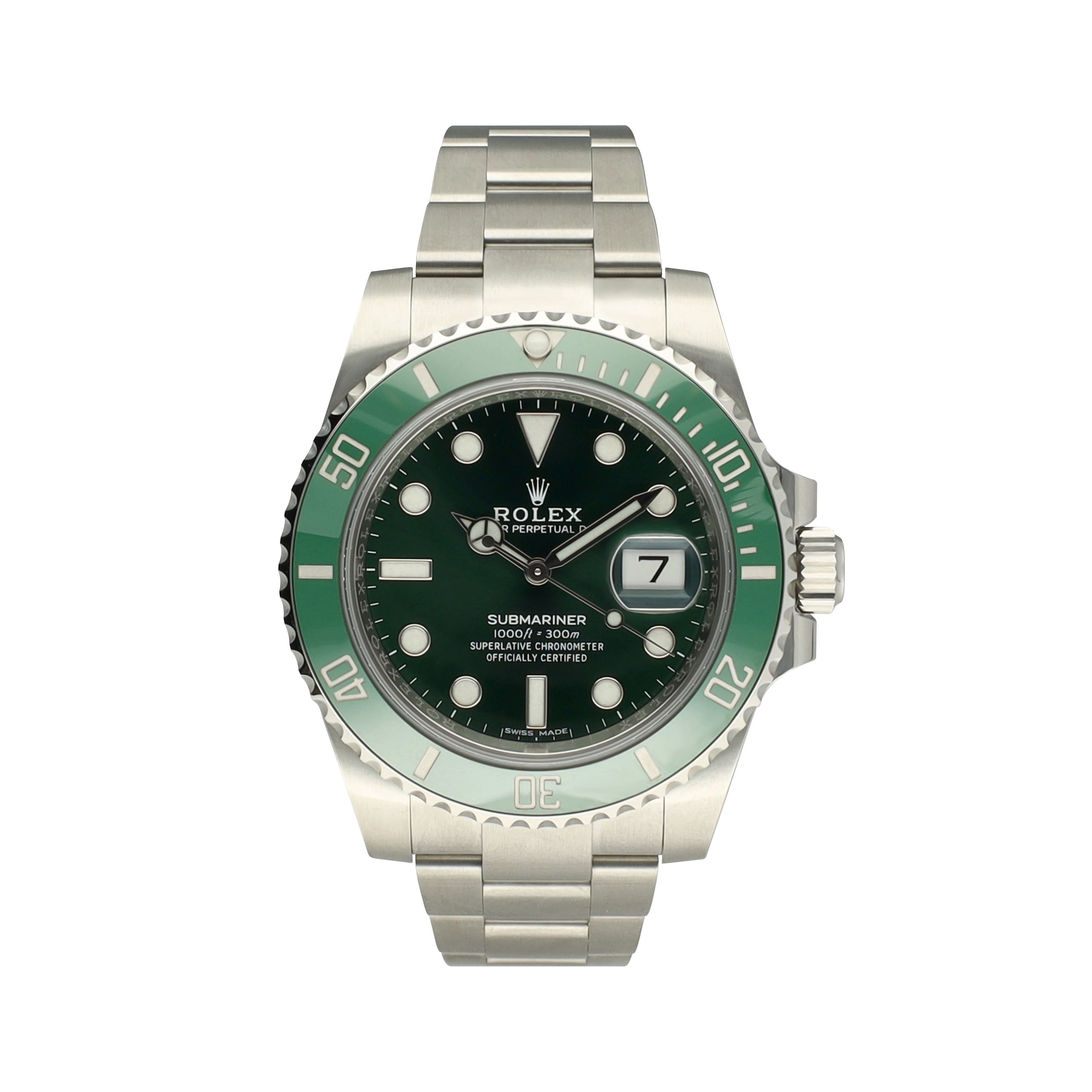 Die Rolex Submariner Date Ref. 116610LV ist eine der bekanntesten modernen Taucheruhren in der Rolex-Kollektion. Diese Konfiguration verfügt über das klassische grüne Zifferblatt, kombiniert mit der markanten grünen Cerachrom-Lünette, die den ikonischen „Hulk“-Look schafft und Sportlichkeit mit zeitlosem Rolex-Design perfekt verbindet.