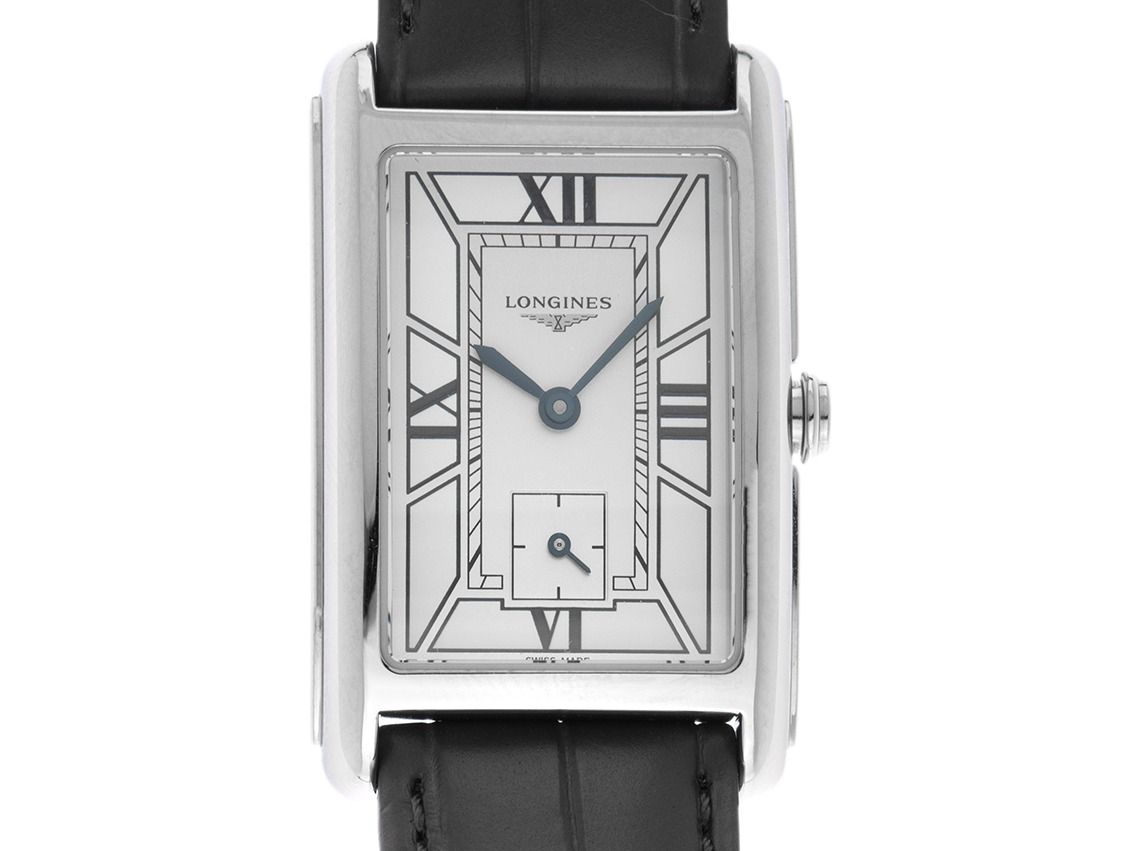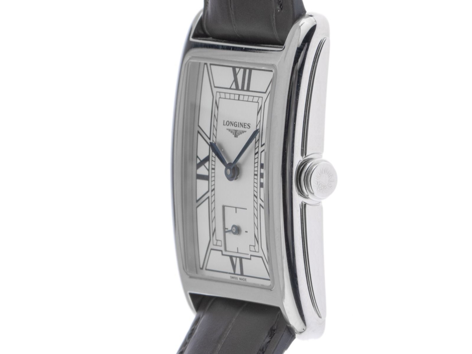 Gehäuse aus poliertem Edelstahl, rechteckig, Gehäusemaße ohne Krone (L x B x H) 37 x 23,3 x 6,8 mm. Lünette aus glattem und poliertem Edelstahl. Armband aus grauem Krokoleder mit Ziernaht, Schnellwechselfunktion, Anstoßbreite 17 mm, Stiftschließe aus Edelstahl mit Hersteller-Logo. Zifferblatt in Silber mit schwarzen römischen Ziffern und gebläuten Zeigern. Uhrwerk quarzgesteuert. Anzeige von Stunde und Minute über Zeiger aus der Mitte, kleine Sekunde mit Sekundenstopp zur sekundengenauen Einstellung der Uhrzeit bei 6 Uhr. Saphirglas kratzfest. Geriffelte Krone. Boden aus Edelstahl graviert. Gewicht der Uhr inklusive Armband 30 g. Wasserdicht bis 3 ATM. Referenznummer: L5.512.4.75.2, ID: ST610218601125H-1550, Artikelnummer: 10000083514. Original Longines Box mit Umkarton und Garantiepapieren von 2025, Full Set. Ungetragen. Lieferzeit sofort.
