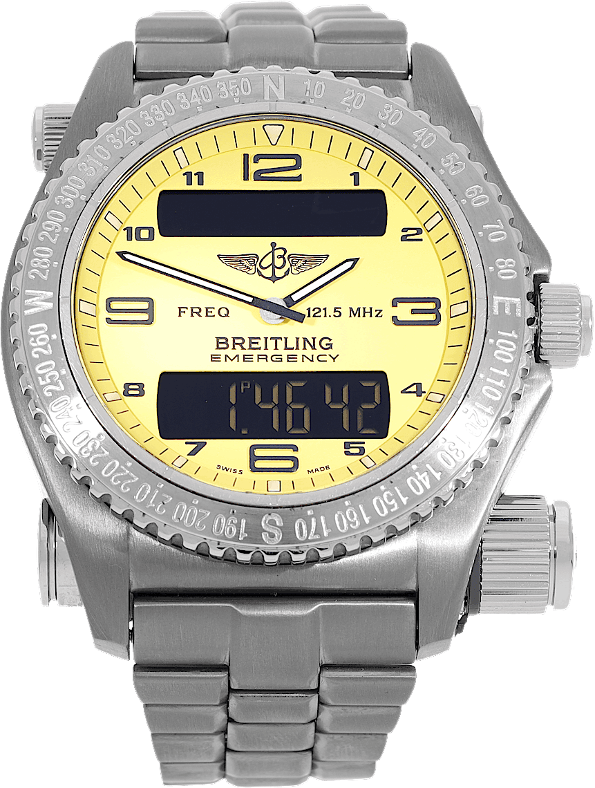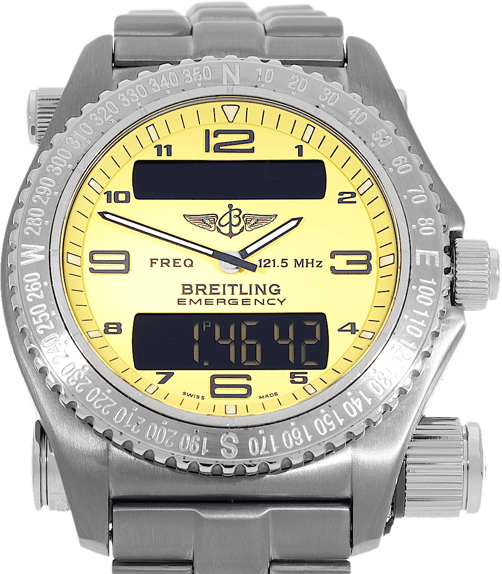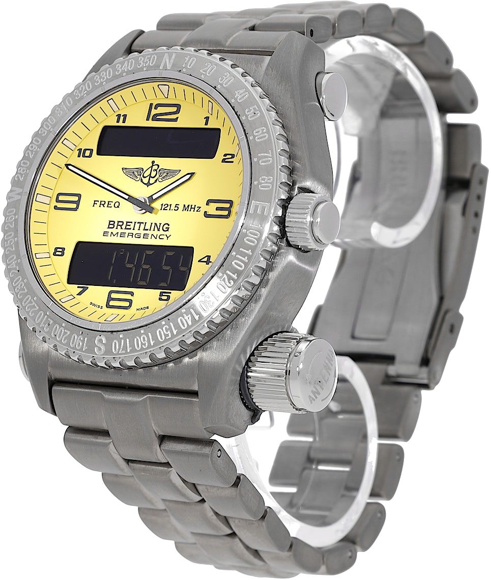Breitling Emergency, Referenz: E56121.1, Geschlecht: Männlich, Größe: 42mm, Zifferblattfarbe: Gelb, Armbandmaterial: Titan, Uhrwerk: Quarz, Jahr: 1999, Zustand: Bereits getragen, geringe bis keine Gebrauchsspuren. Das Uhrwerk ist einwandfrei und das Gehäuse wurde gereinigt. Die Uhr wurde getestet, um die volle Funktionalität sicherzustellen. Eine Inspektion durch unsere zertifizierten Uhrmacher garantiert die Echtheit., Dokumente: Originalunterlagen, CHRONEXT Zertifikat