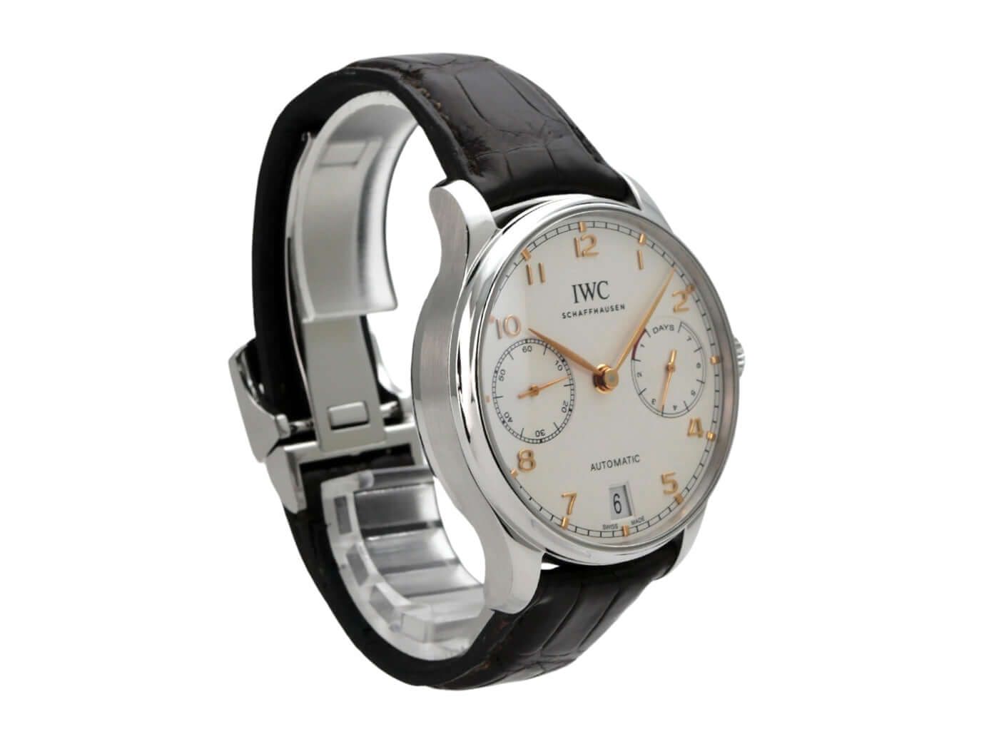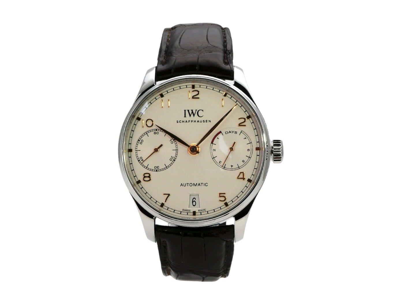 IWC Portugieser Automatic 7 Days Ref. IW500704 from 2015Case made of polished and satin-finished stainless steel, case diameter 42.3 mm, case height 14.5 mm, brown leather strap with folding clasp, silver-colored dial, IWC manufacture caliber 52010, automatic Pellaton winding, Breguet spring, power reserve after full winding 168 hours, rotor with 18-carat gold medallion, power reserve indicator, date, anti-reflective sapphire crystal, sapphire crystal display back, water-resistant up to 3 bar