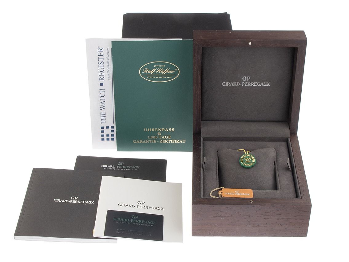 Gehäuse 18kt Gelbgold poliert und satiniert, Gehäusedurchmesser ohne Krone 43mm, Gehäusehöhe 13,5mm. Lünette 18kt Gelbgold glatt und poliert, Unterglas Rechenschieber mit Weltstädten, einstellbar über verschraubte Krone bei 9 Uhr. Armband Leder dunkelbraun mit Ziernaht, Anstoßbreite 22mm, Girard Perregaux Faltschließe 18kt Gelbgold mit Hersteller-Logo. Zifferblatt cremeweiß mit aufgesetzten gelbgoldenen Indexen, arabischen Ziffern und gelbgoldenen Zeigern. Uhrwerk Automatik, Chronograph, Kaliber Girard Perregaux 3387 mit 63 Edelsteinen. Anzeige von Stunde und Minute über Zeiger aus der Mitte, kleine Sekunde mit Sekundenstopp zur sekundengenauen Einstellung der Uhrzeit bei 3 Uhr, Datumsanzeige mit Schnellverstellung zwischen 1 und 2 Uhr, Unterglas Weltanzeige, Tag- und Nachtanzeige. Saphirglas kratzfest und gewölbt. Krone verschraubbar mit Hersteller-Logo. Boden 18kt Gelbgold 6-fach verschraubt und graviert mit Saphirglas Sichtfenster. Gewicht der Uhr inklusive Armband 173g. Referenznummer: 49800-51-151-BACD, Gehäusenummer: XXX, ID: P2705125000326H-20100, Artikelnummer: 10000085195. Mit Gangkontrolle und kompletter äußerlicher Aufarbeitung von März 2026. Original Girard Perregaux Box mit Umkarton und Garantie Papiere von März 2009 sowie Watchregister Auszug von März 2026, The Watch Register Zertifikat / ohne Eintrag (Internationale Datenbank für verlorene oder gestohlene Uhren), Full Set. Kapitalanlage mit Wertsteigerungspotential, extrem seltenes Sammlerstück, fast nicht getragen. Sehr guter Zustand. Lieferzeit sofort.