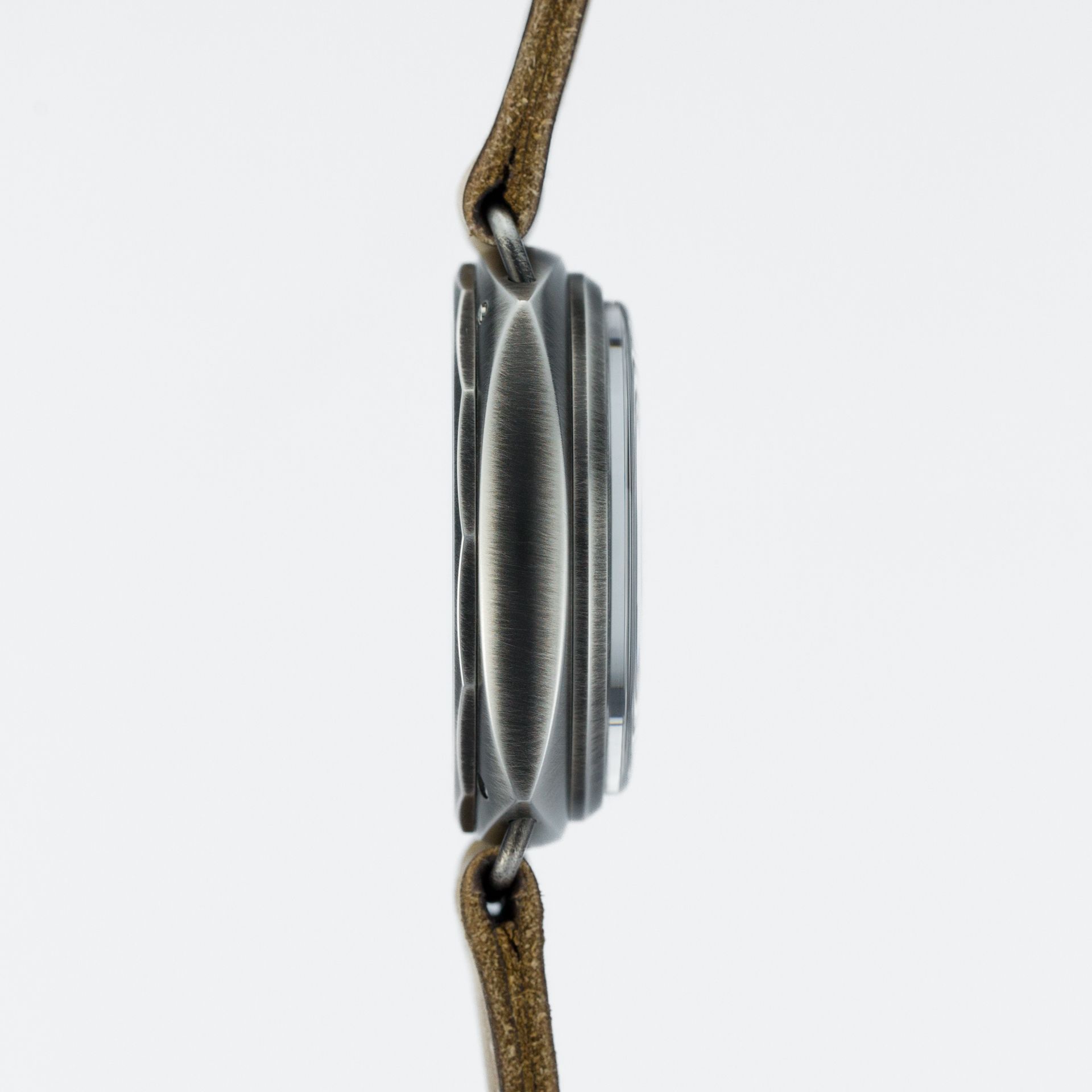 What is interesting in this case is that recycled steel has been used, which is aged in a special way to resemble the appearance of a long-used favorite tool, and the smoky dial with a complex rough texture and a strap of roughly processed nubuck reinforces the overall effect. The case size is the common for the Radiomir series 45 mm – this is truly a remarkable watch in every respect!