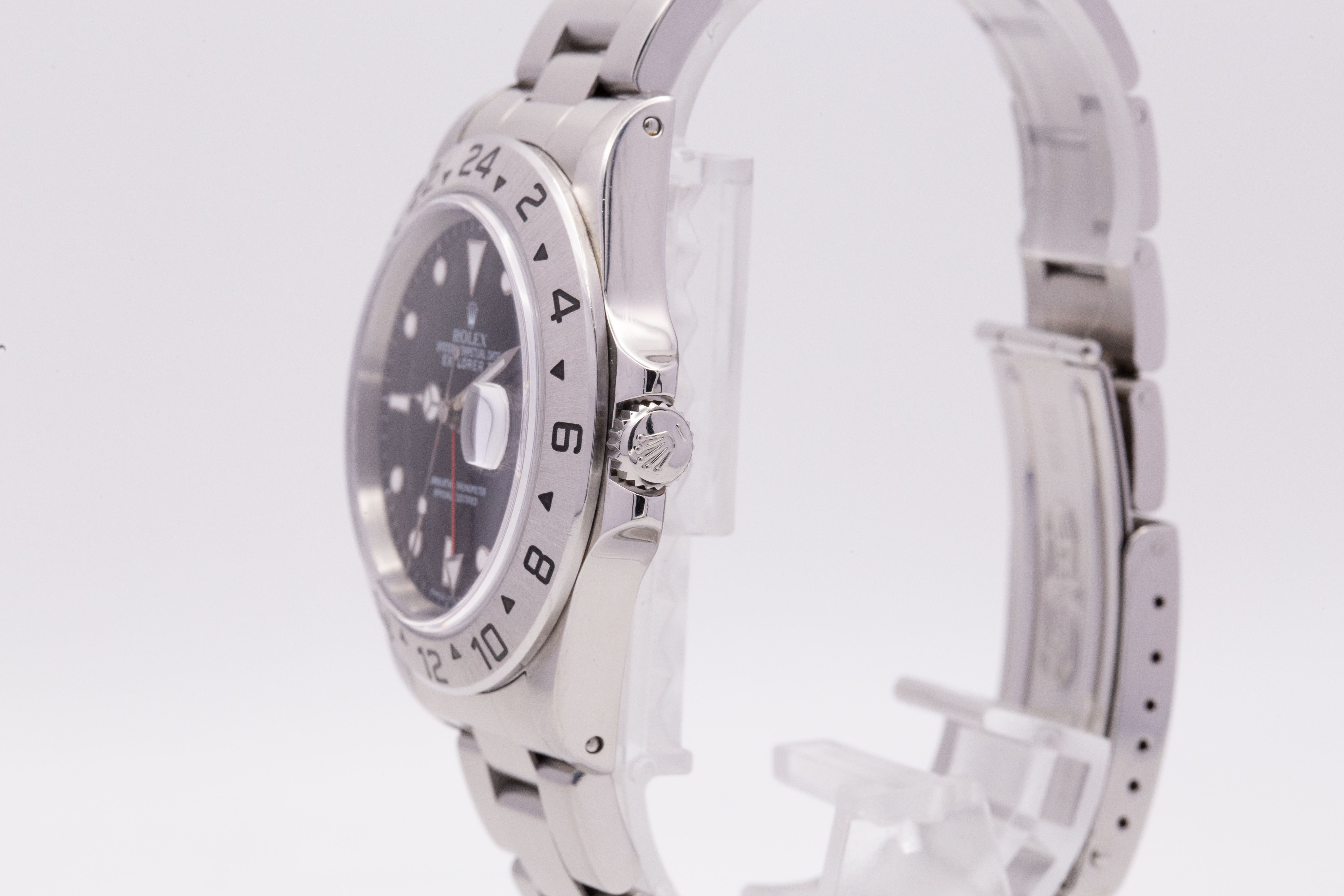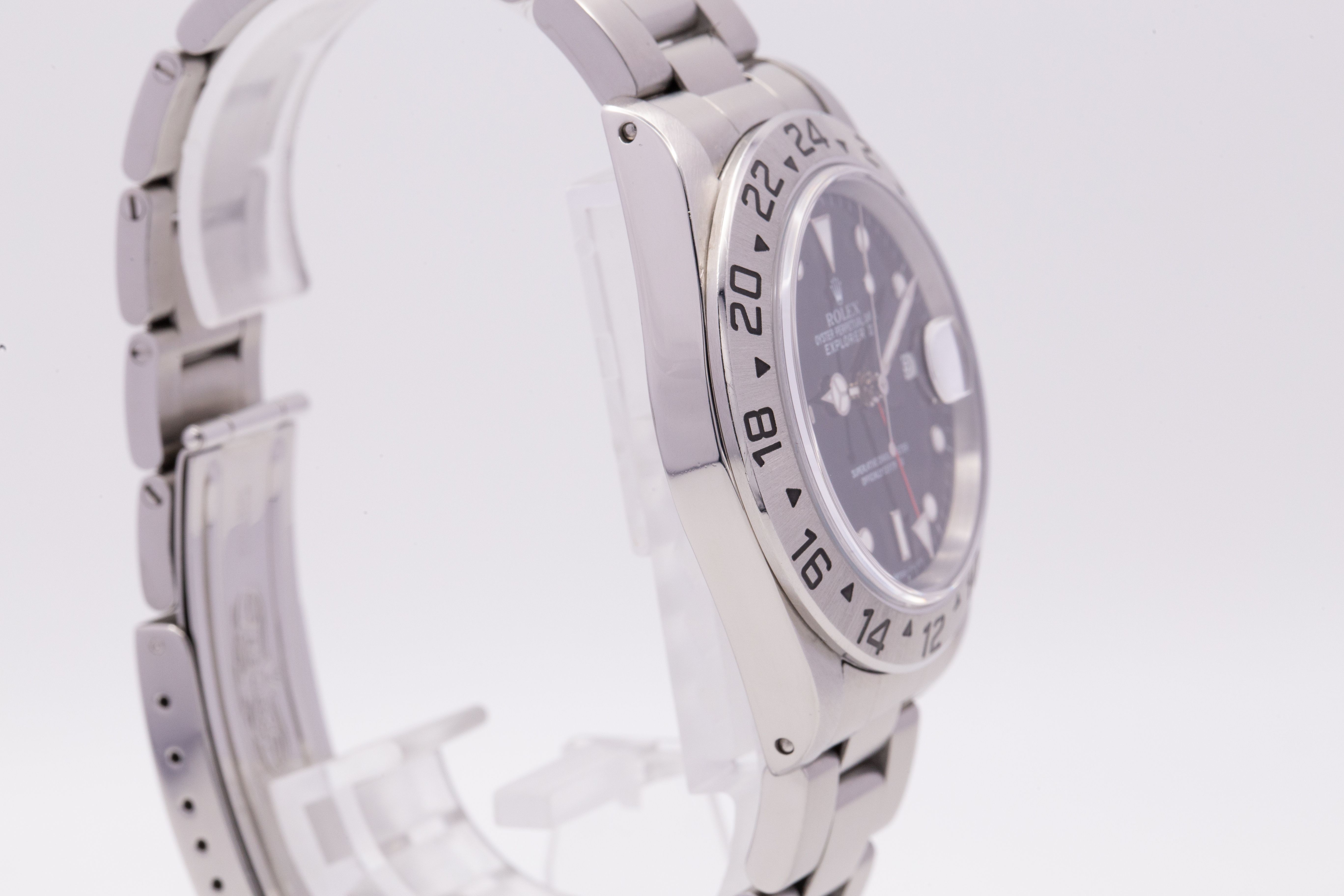 Die Explorer II Ref. 16570 gehört zu den letzten klassischen 5-stelligen Sportmodellen von Rolex und steht für funktionales, reduziertes Design ohne überflüssige Elemente. Das 40-mm-Gehäuse, die feststehende 24-Stunden-Lünette sowie der markante GMT-Zeiger unterstreichen den klaren Toolwatch-Charakter.
