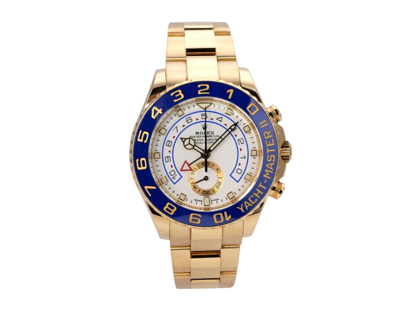 Rolex Yacht-Master II Yellow Gold 116688 from 2020 Case made of 18 kt yellow gold, polished and satin-finished, case diameter 44 mm, bezel made of 18 kt yellow gold with blue ceramic inlay, Oyster bracelet made of 18 kt yellow gold, polished and satin-finished with folding clasp, white dial with luminous indices and hands, automatic movement, Rolex manufacture caliber 4161 with 31 jewels, frequency 28,800 A/h, chronometer, small seconds display at 6 o'clock, scratch-resistant sapphire crystal, screw-down case back made of 18 kt yellow gold, water-resistant up to 10 bar. Pre-owned watch, very good condition, complete with box and papers, German delivery from 2020.