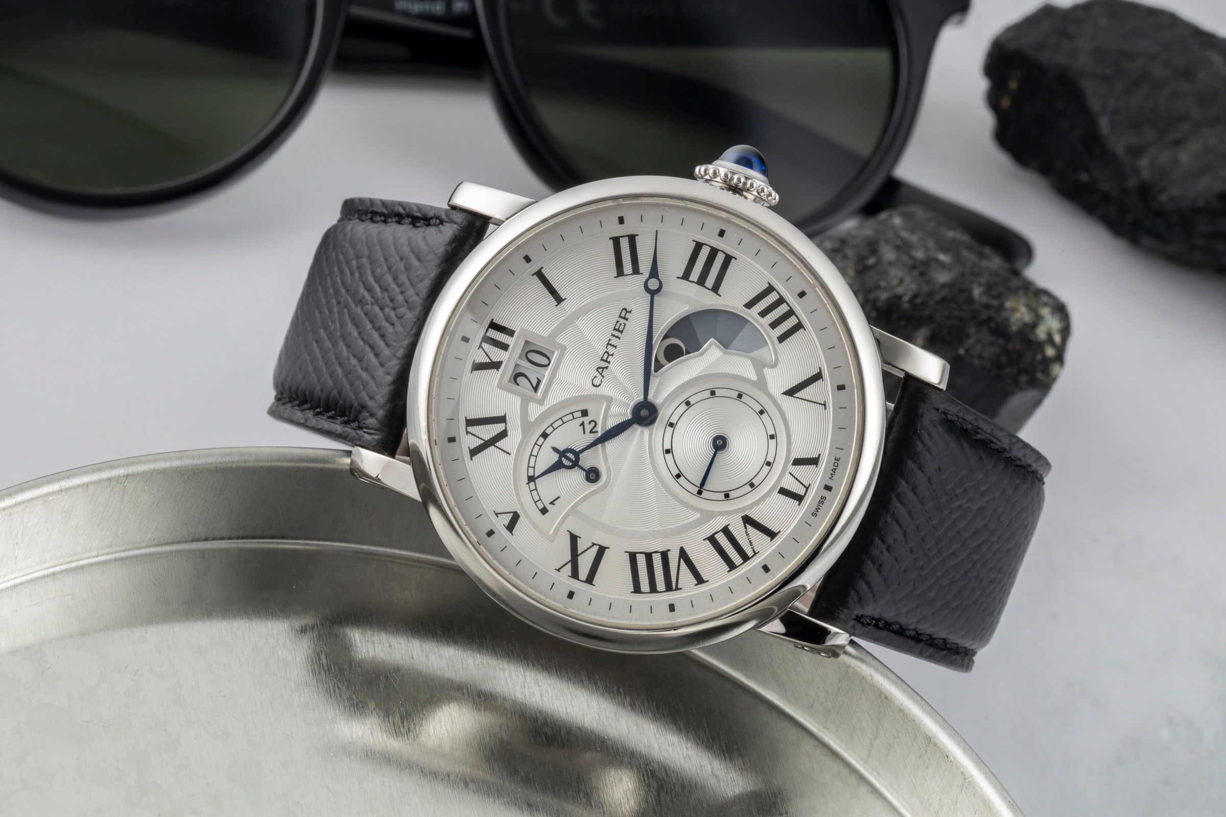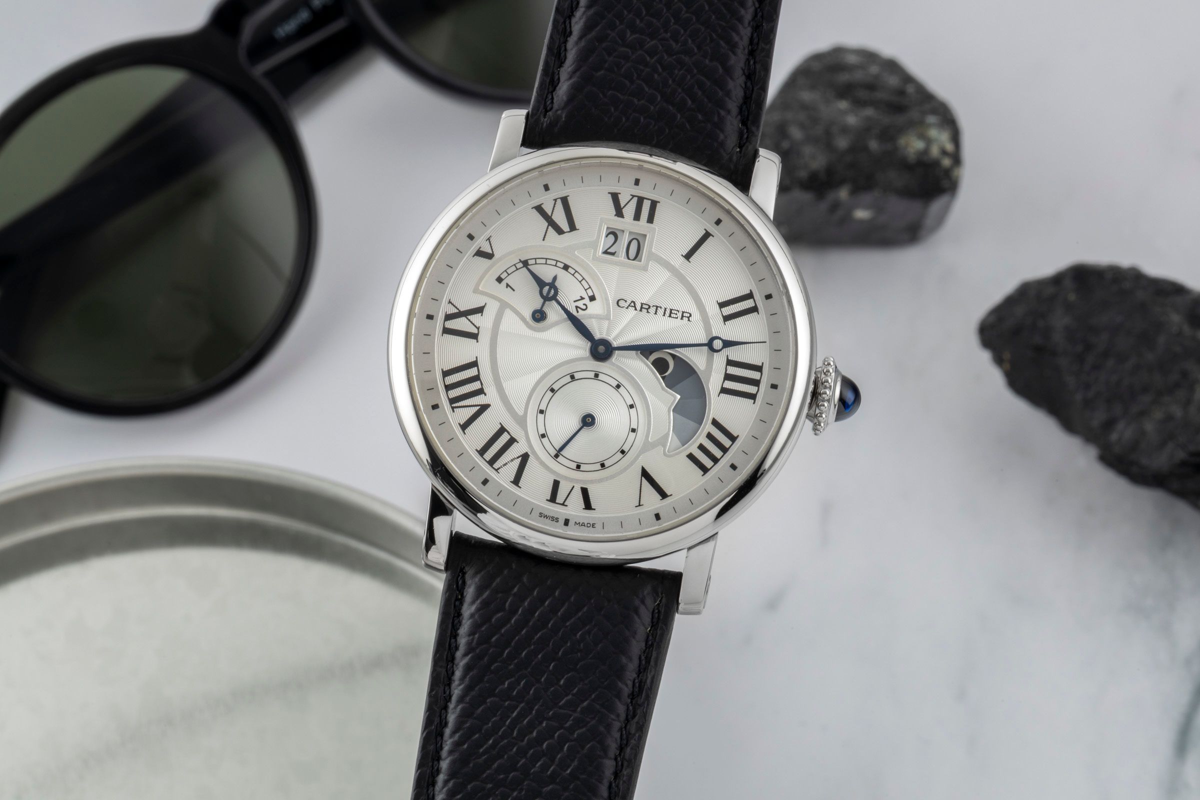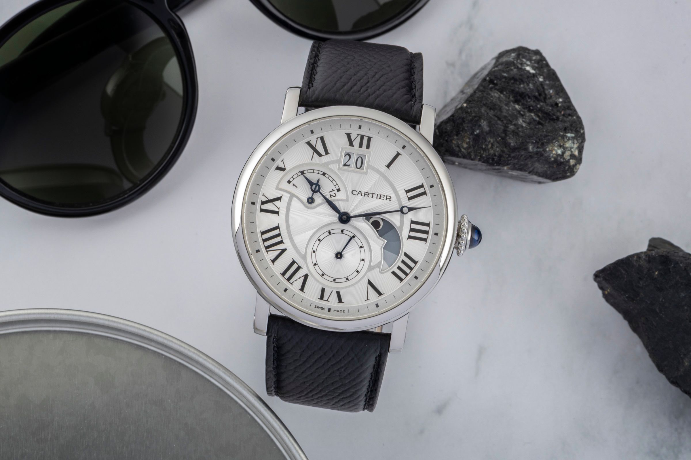 Alternative title: Cartier W1556368 Rotonde de Cartier Second Time Zone Day / Night Stainless Steel / Silver; Cartier Rotonde de Cartier Grossdatum Retrograde 2. Zeitzone W1556368 Papiere [2600825]