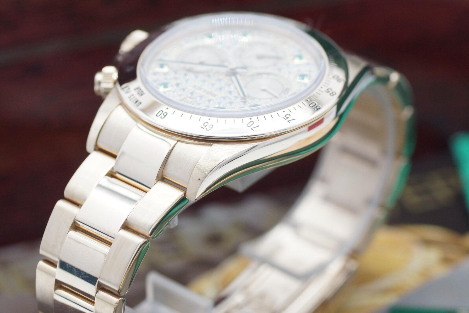 - Leichte Gebrauchsspuren wie feine Kratzer oder kleine Oberflächenkratzer. Gehäuse, Lünette und Armband behalten ihre scharfen Kanten und die ursprüngliche Form. Kann professionell poliert worden sein, ohne die originalen Konturen zu verändern. Mechanisch voll funktionsfähig.