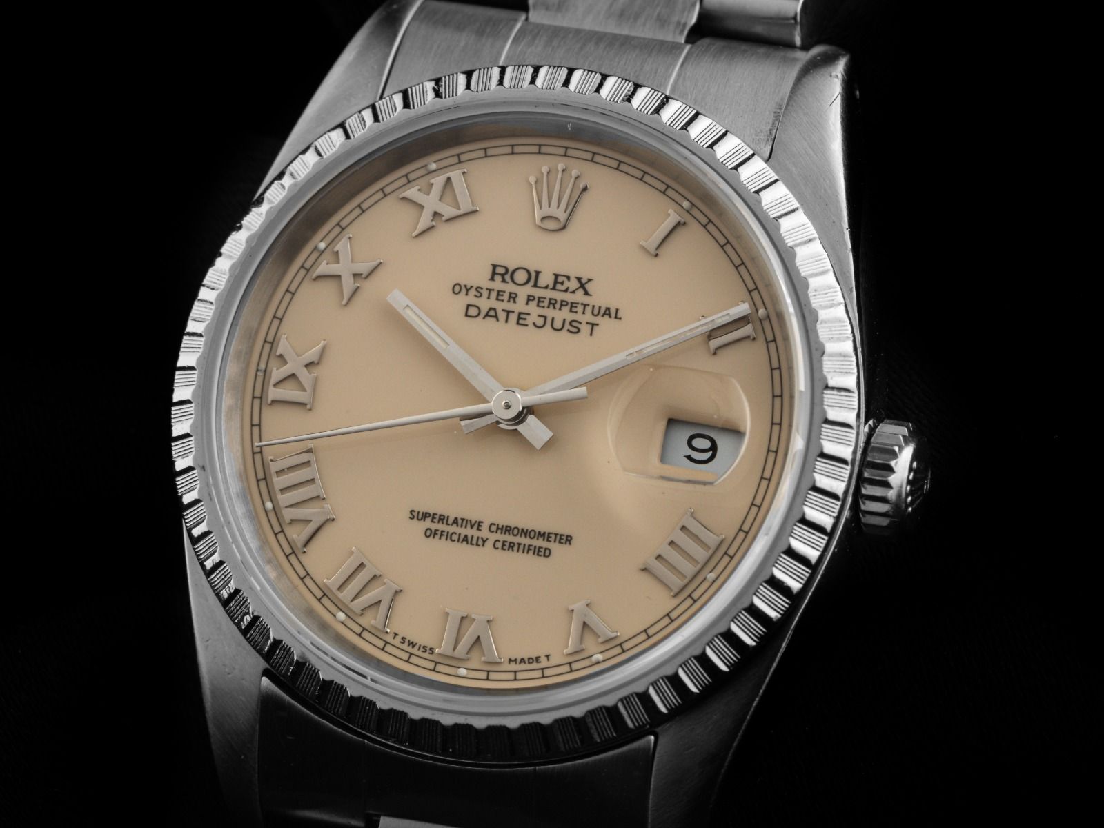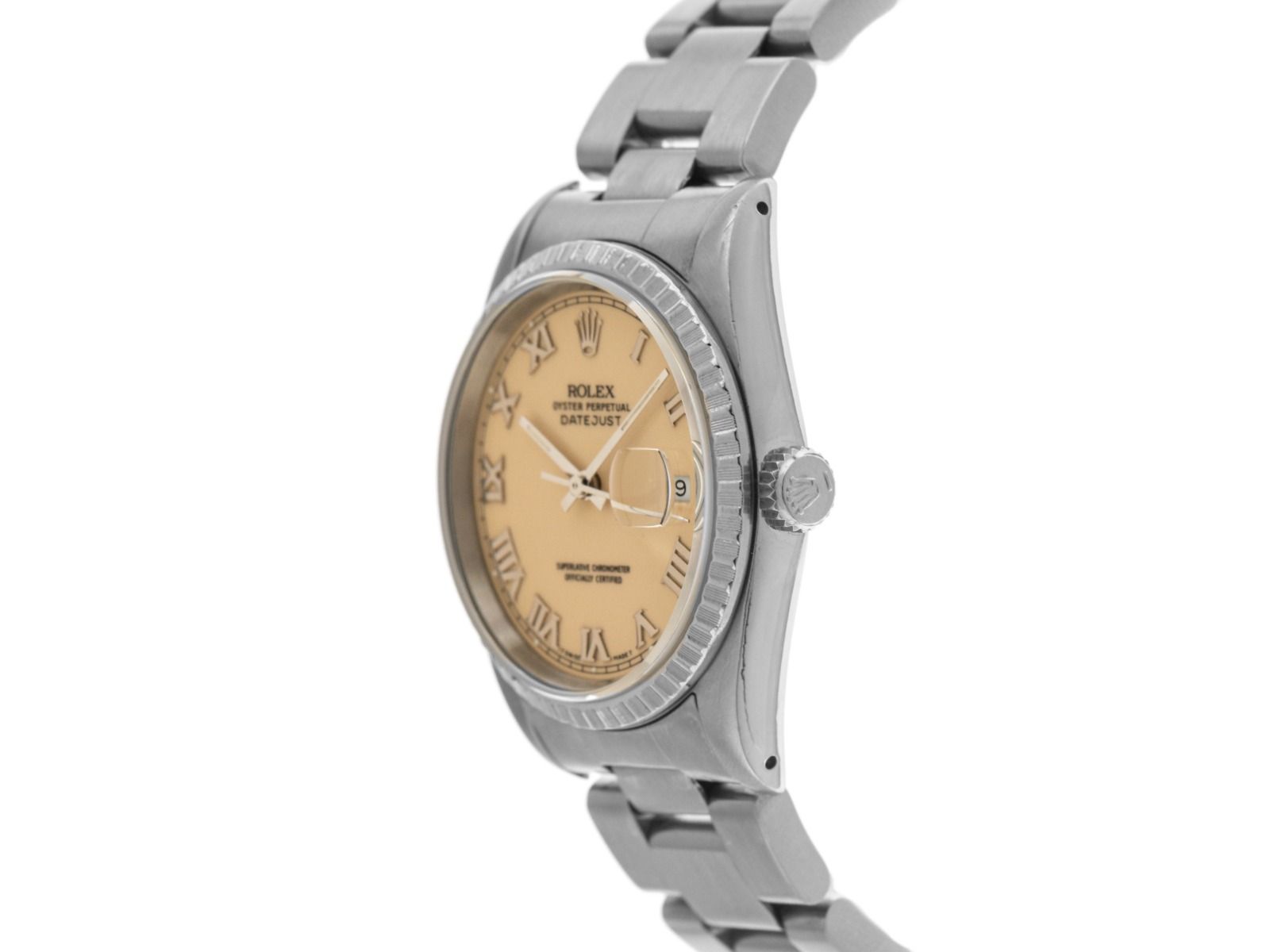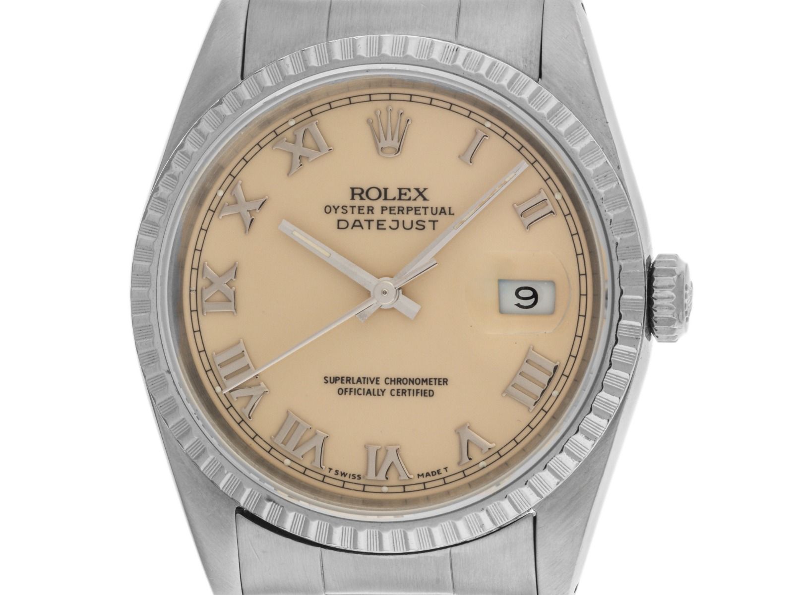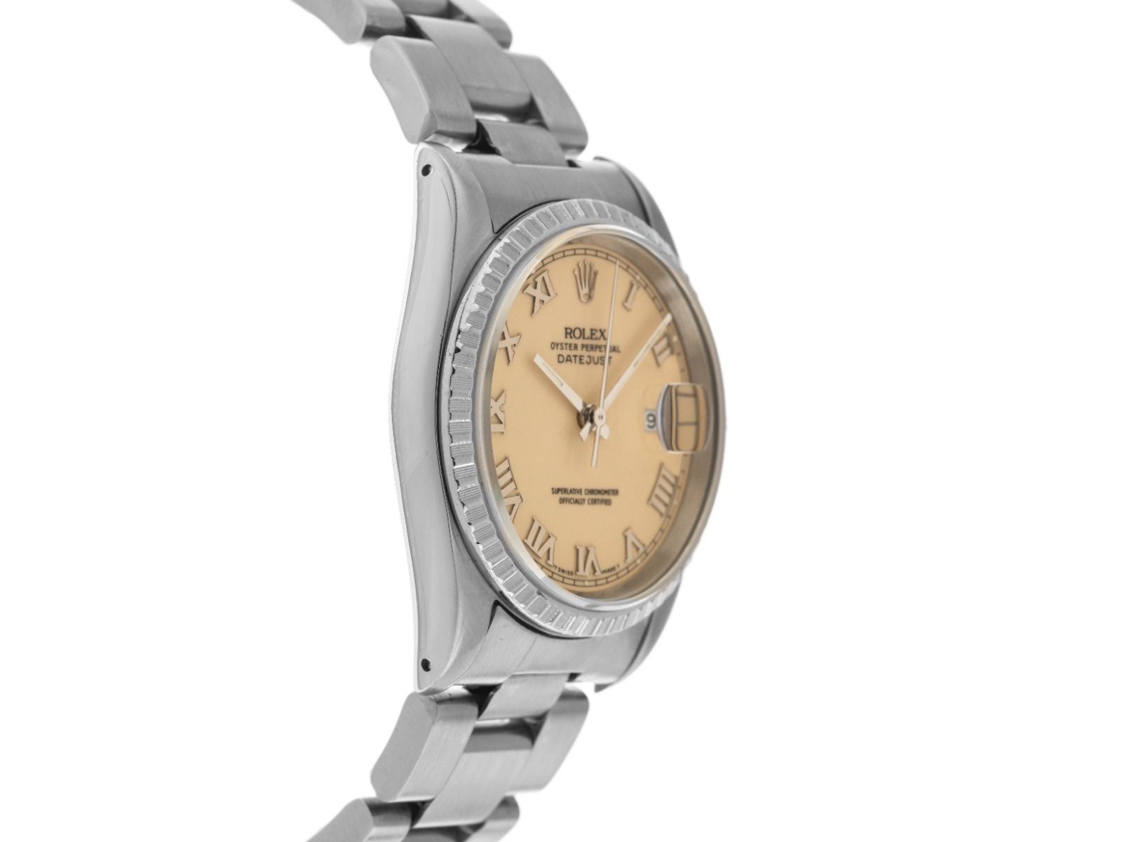 Gehäuse aus poliertem und satiniertem Edelstahl, Gehäusedurchmesser ohne Krone 36mm, Gehäusehöhe 11,5mm. Lünette aus geriffeltem, poliertem und satiniertem Edelstahl. Armband Oyster aus poliertem und satiniertem Edelstahl, Faltschließe aus Edelstahl mit Hersteller-Logo. Zifferblatt in cremefarbener Ivory Safari mit aufgesetzten römischen Ziffern aus Weißgold und Zeigern aus Weißgold, "T SWISS MADE T" Aufschrift bei 6 Uhr. Uhrwerk Automatik, Chronometer, Rolex Manufakturkaliber 3135 mit 31 Edelsteinen. Anzeige von Stunde, Minute und Sekunde über zentrale Zeiger mit Sekundenstopp zur sekundengenauen Einstellung der Uhrzeit, Datumsanzeige mit Schnellverstellung unter Glaslupe bei 3 Uhr. Saphirglas kratzfest. Verschraubbare Krone mit Hersteller-Logo. Boden aus Edelstahl, verschraubt. Gewicht der Uhr inklusive Armband 101g, Länge des Armbandes inklusive Gehäuse 190mm. Referenznummer: 16220, Baujahr: 1988, Gehäusenummer: L660XXX, ID: P273481540326H-7900, Artikelnummer: 10000085270. Mit Gangkontrolle und kompletter äußerlicher Aufarbeitung von März 2026. Original Rolex Box mit Umkarton und Beschreibung sowie Ledermäppchen, Übersetzungsheft, Rolex Chronometer-Siegel und Watchregister Auszug von März 2026, The Watch Register Zertifikat / ohne Eintrag (Internationale Datenbank für verlorene oder gestohlene Uhren). Superschnäppchen, Kapitalanlage mit Wertsteigerungspotential, extrem seltenes Sammlerstück. Sehr guter Zustand. Lieferzeit sofort.