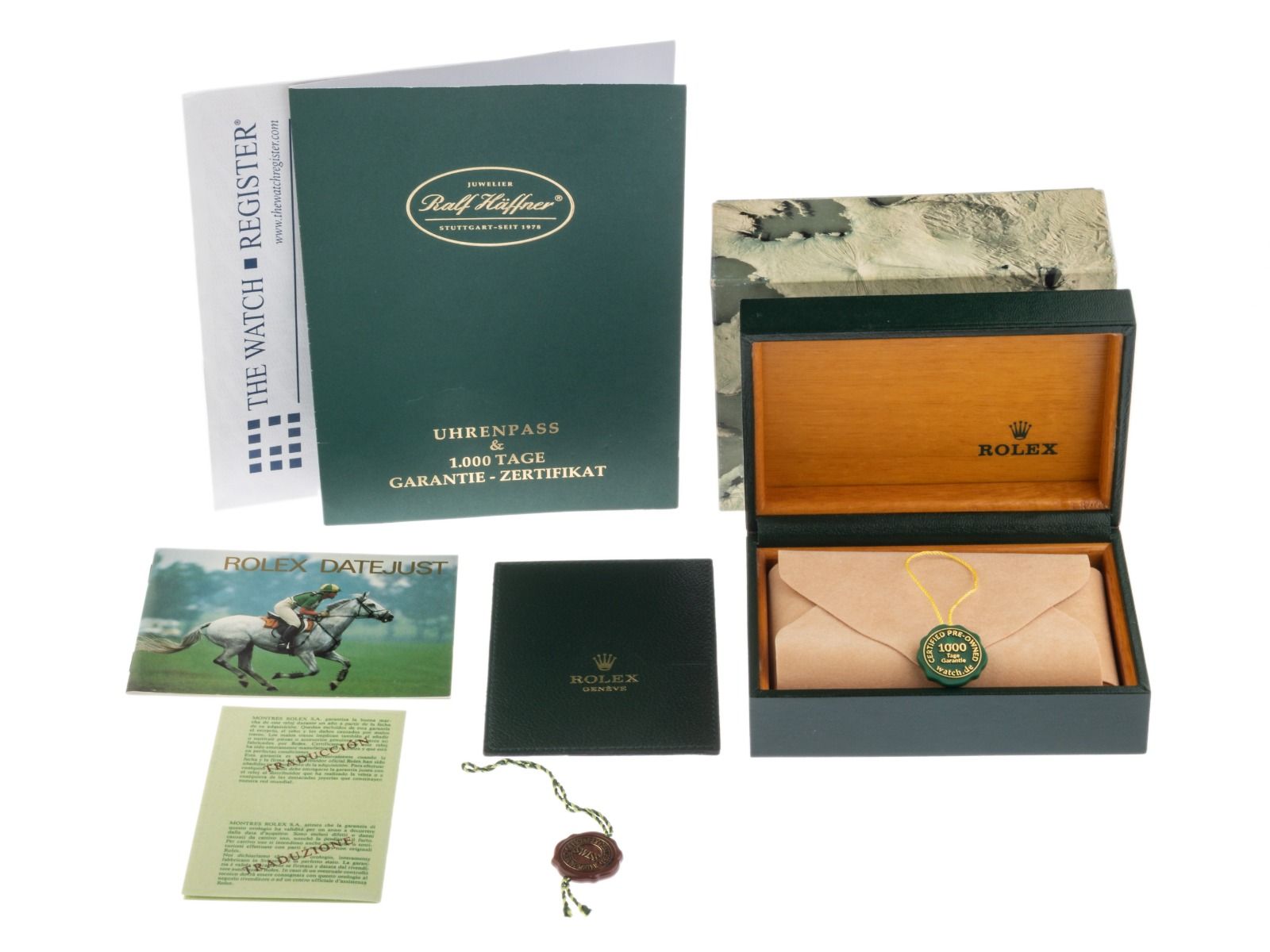 Inklusive certified pre owned Siegel / Uhrenpass mit einem Farbbild, der genauen Beschreibung sowie dem Wiederbeschaffungswert der Uhr über 7900,-€ und 1000 Tage Garantie ab Kaufdatum.