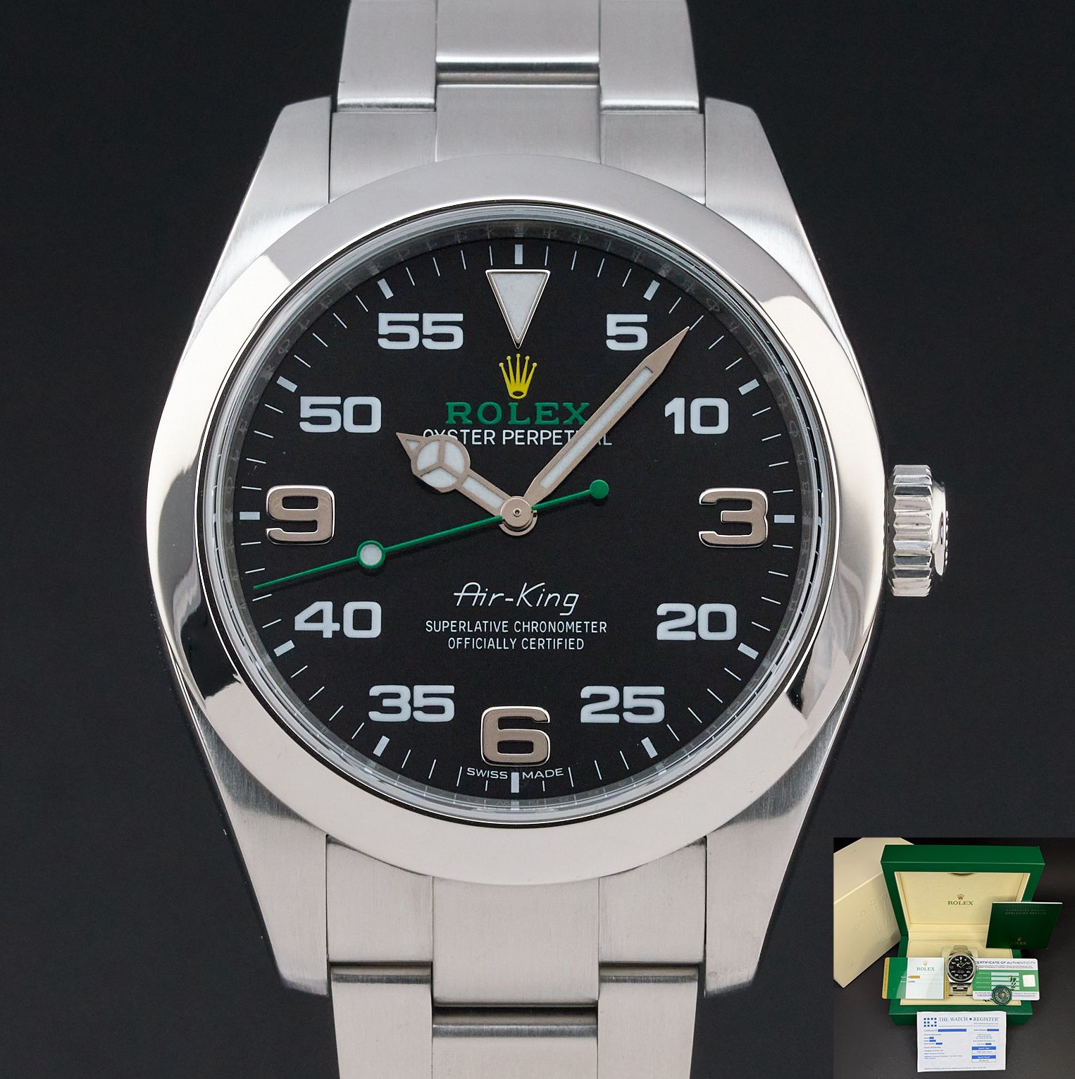 Diese Rolex Air-King 116900 verfügt über eine schwarze arabische Zifferblatt und ist aus Edelstahl gefertigt, mit einem Produktionsjahr von 2019.
