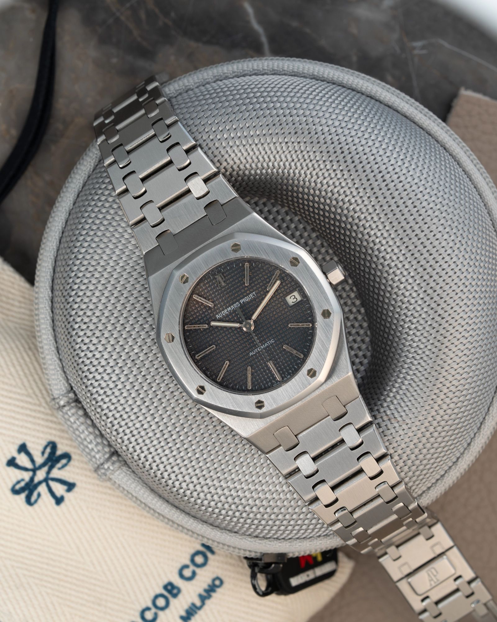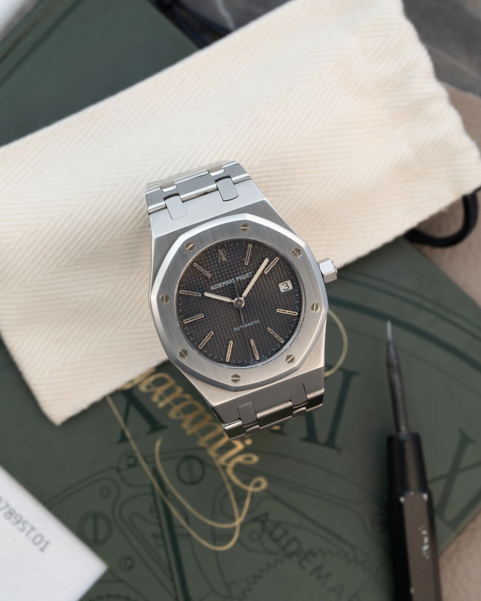 This Royal Oak is delivered with the original papers and Audemars Piguet box. It was originally sold in 2001.