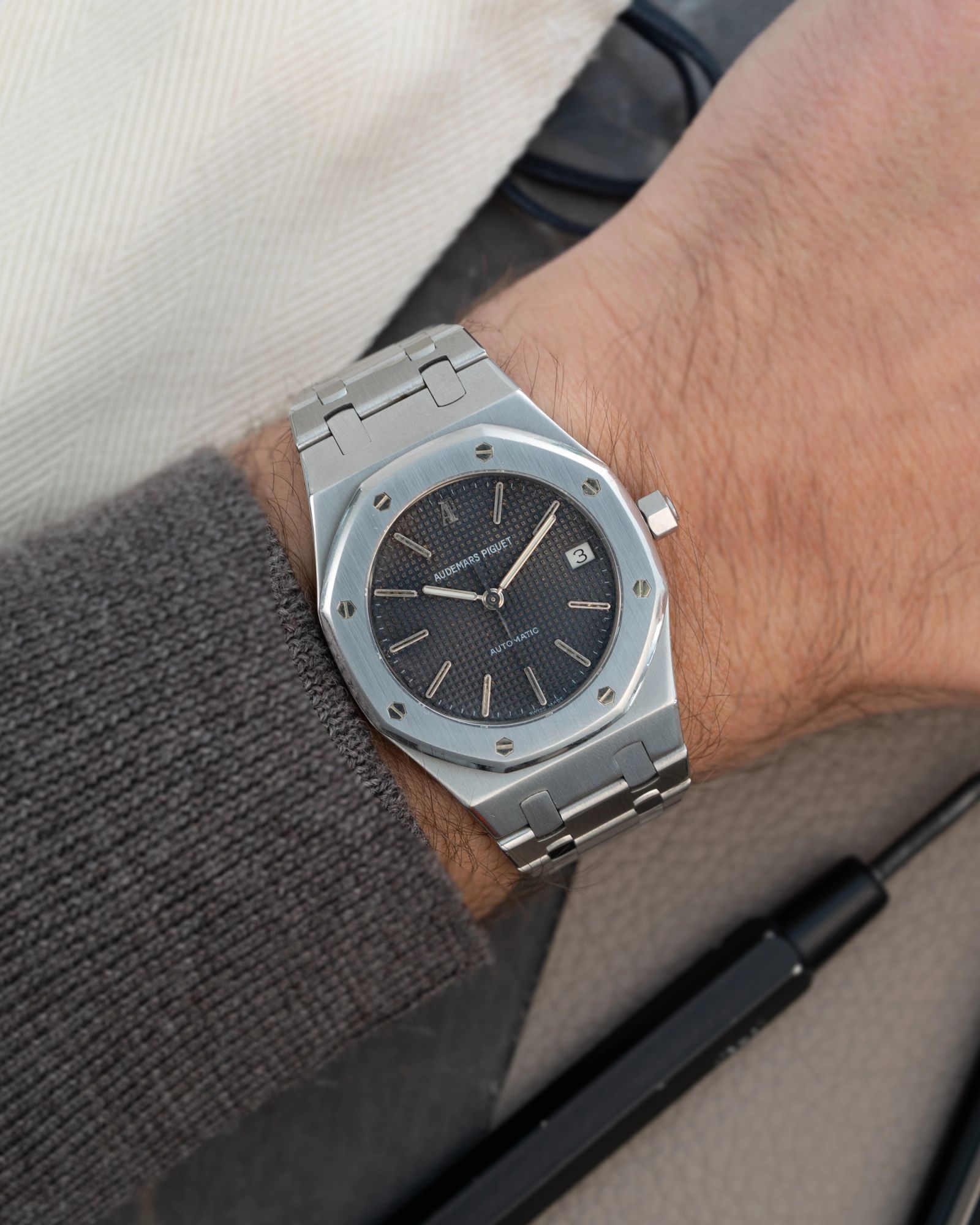 This Audemars Piguet Royal Oak reference 14790, the mid-size “Tropical” execution of the Gérald Genta design, is in overall great condition. At 36 mm this Royal Oak is more wearable than the ‘Jumbo’, but due to its 8mm thickness it still has a civilized wrist presence and that’s what we strive for. The Royal Oak has the recognisable octagonal bezel, case and stainless steel integrated bracelet.This watch features a ‘petite tapisserie’ grey dial which has a tropical effect. The dial features the more sought after long indexes. The hands are filled with luminova.