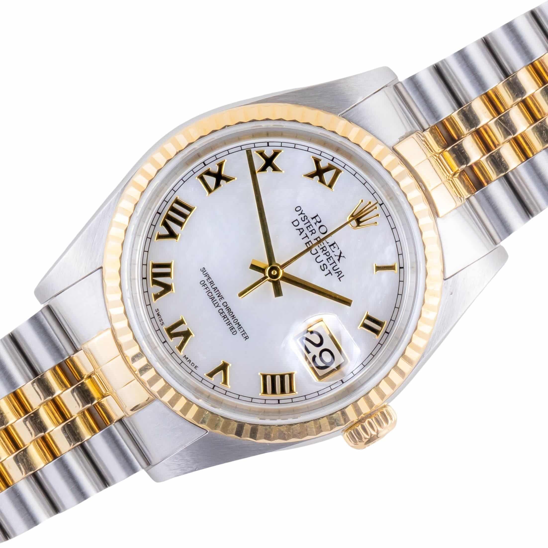 Rolex Oyster Perpetual Datejust Referenz 16233 aus 1995, inklusive vollständigem Set. Die Datejust 16233 hat ein 36 mm Gehäuse aus Gold und Edelstahl, ein zweifarbiges Jubilee-Armband und eine geriffelte Lünette aus 18 Karat Gold. Diese Datejust 16233 verfügt über ein automatisches Uhrwerk Kaliber 3135 mit einer Schnellverstellung für das Datum, ein kratzfestes Saphirglas und eine silberne MOP-Zifferblatt mit Tritiumzeigern.