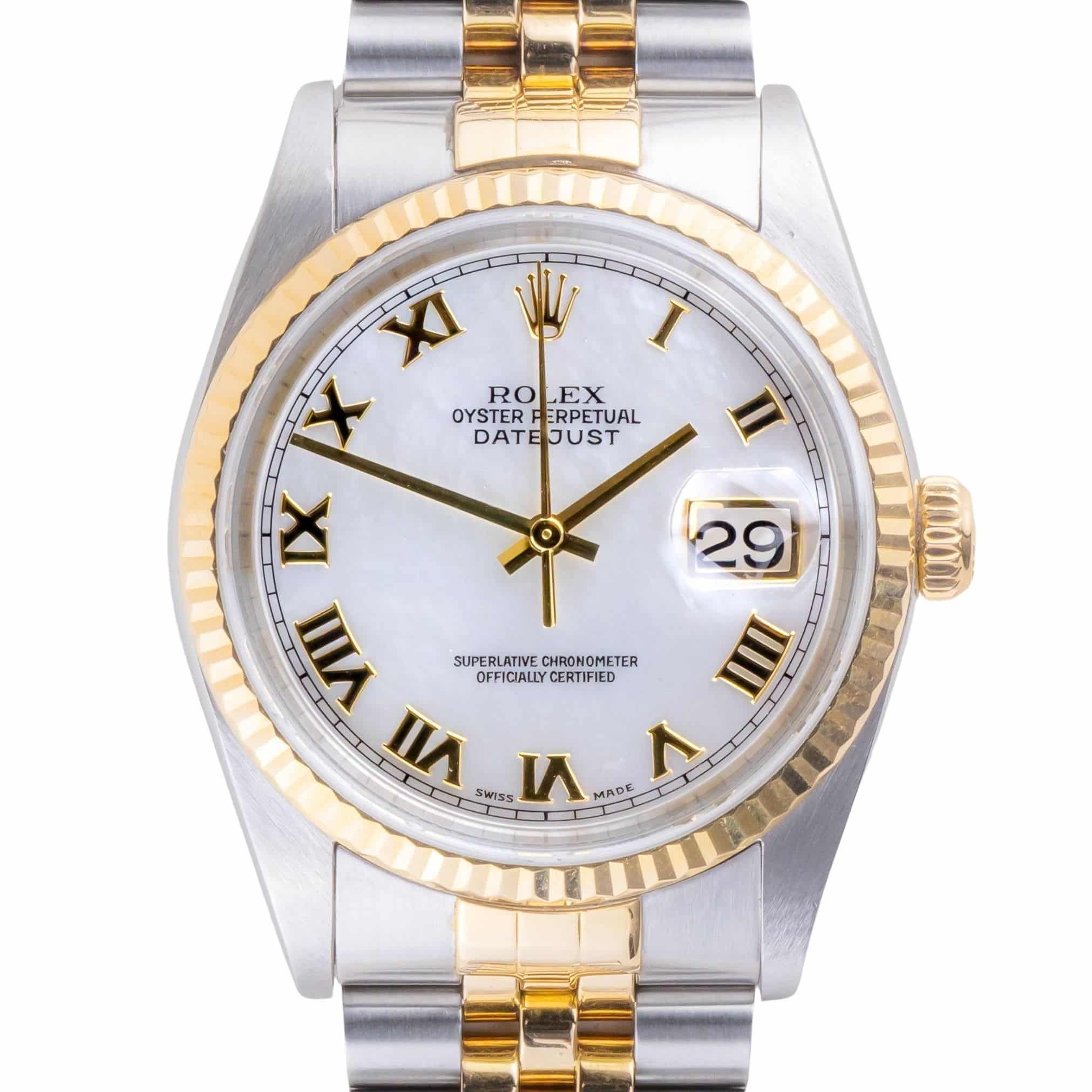 Rolex Oyster Perpetual Datejust reference 16233 from 1995 including full set. The Datejust 16233 measures a 36mm gold and stainless steel case, two-tone Jubilee bracelet and fluted 18k gold bezel. This Datejust 16233 features an automatic movement caliber 3135 with a quickset date function, a scratch resistance sapphire crystal and a silver MOP dial with tritium hands.Every watch sold by Langedyk Vintage Watches is included with a LVW watch box, Authenticity report and free worldwide (insured) shipment. In addition, every pre-owned watch is offered with our 12-month warranty from the date of purchase.
