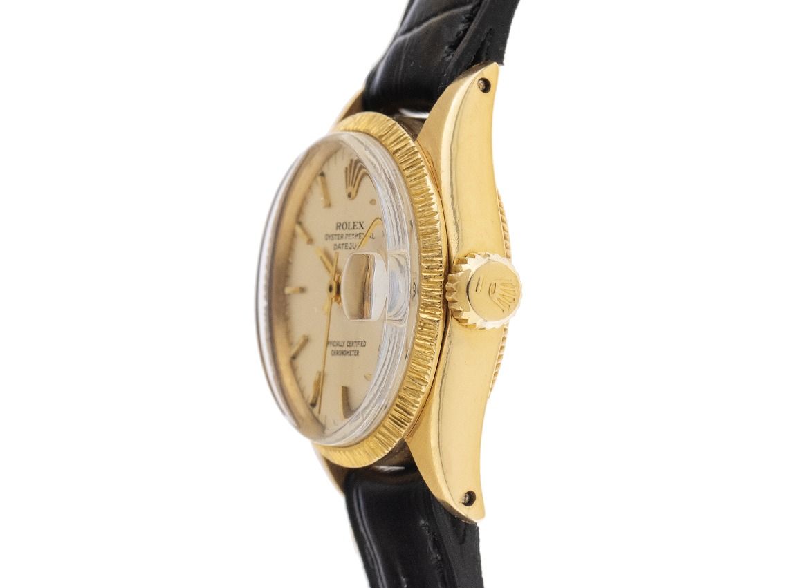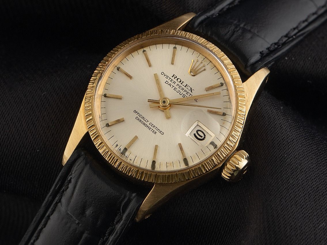 Gehäuse aus poliertem und satiniertem Edelstahl, Gehäusedurchmesser ohne Krone 26mm, Gehäusehöhe 11,7mm. Lünette aus 18kt Gelbgold mit Rindengravur. Armband aus schwarzem Leder mit Ziernaht, Anstoßbreite 13mm, Stiftschließe aus vergoldetem Gelbgold. Zifferblatt in Silber mit aufgesetzten gelbgoldenen Indexen und gelbgoldenen Zeigern. Uhrwerk Automatik, Rolex Manufakturkaliber 2030 mit 28 Edelsteinen. Anzeige von Stunde, Minute und Sekunde über Zeiger aus der Mitte, Datumsanzeige unter Glaslupe bei 3 Uhr, open 6/9 (offene 6 und 9 in der Datumsanzeige). Plexiglas. Verschraubbare Krone mit Hersteller-Logo. Boden aus 18kt Gelbgold, verschraubt. Gewicht der Uhr inklusive Armband 30g. Referenznummer: 6527, Baujahr: 1967, Gehäusenummer: 1818XXX, ID: P273776000326HW-8100, Artikelnummer: 10000085273. Mit Gangkontrolle und kompletter äußerlicher Aufarbeitung von März 2026. Original Rolex Box und Beschreibung, Ledermäppchen, Übersetzungsheft, Rolex Chronometer-Siegel sowie Watchregister Auszug von März 2026, The Watch Register Zertifikat / ohne Eintrag (Internationale Datenbank für verlorene oder gestohlene Uhren). Superschnäppchen, Kapitalanlage mit Wertsteigerungspotential. Sehr guter Zustand. Lieferzeit sofort.