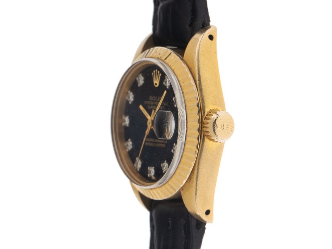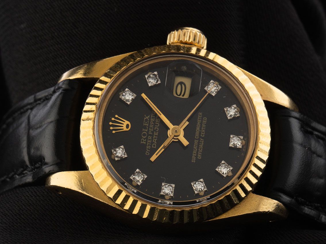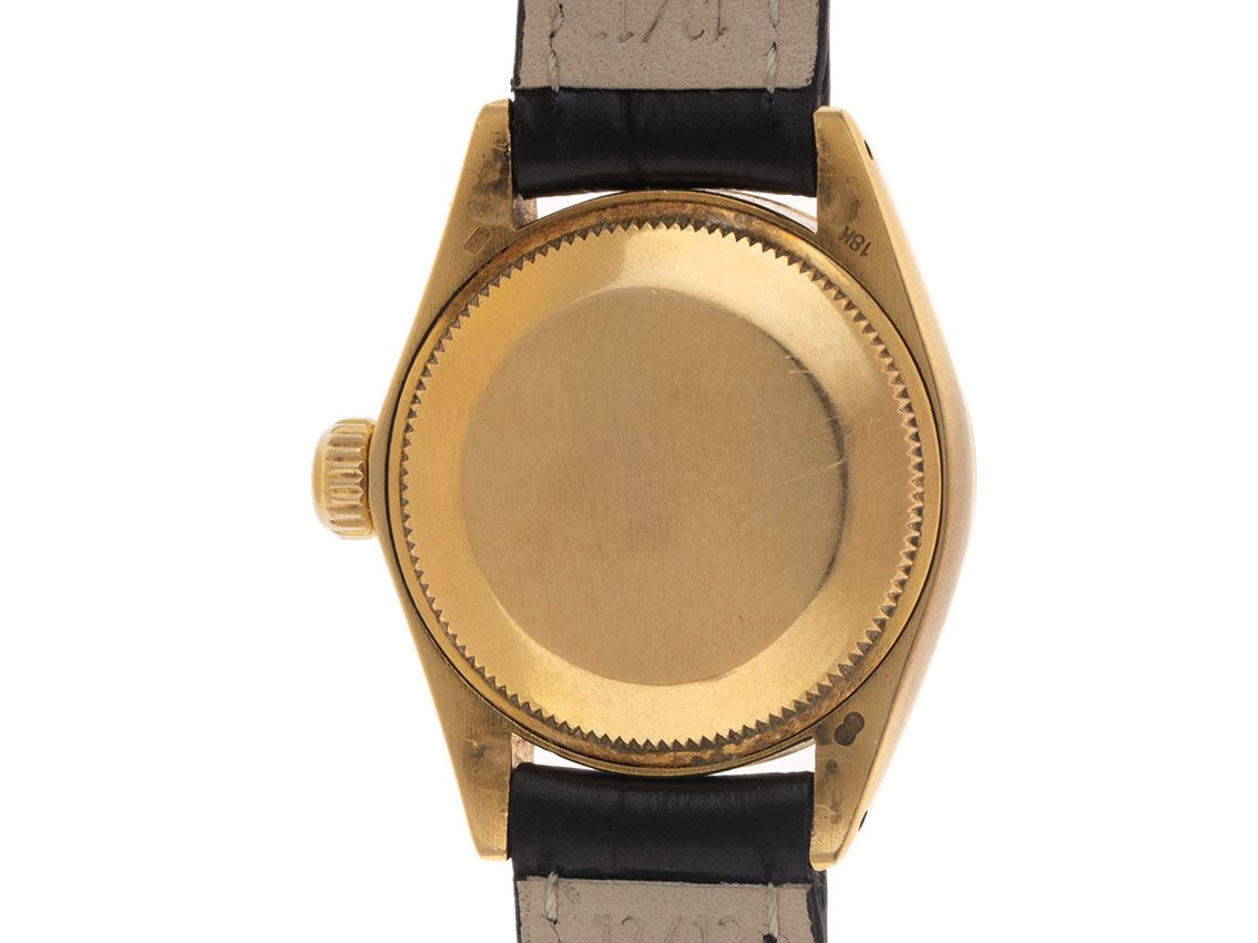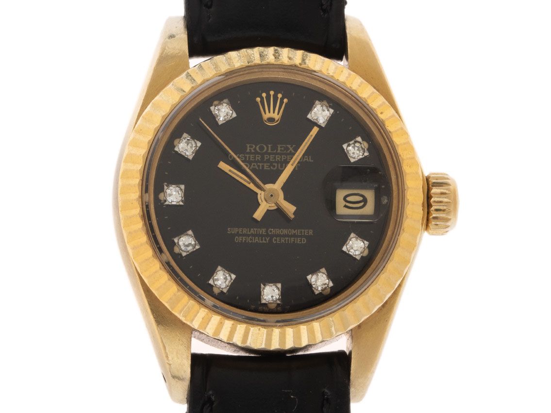Gehäuse 18kt Gelbgold poliert und satiniert, Gehäusedurchmesser ohne Krone 26mm, Gehäusehöhe 11,2mm. Lünette 18kt Gelbgold geriffelt und poliert. Armband Krokoleder schwarz, Anstoßbreite 13mm, Stiftschließe vergoldet. Zifferblatt schwarz mit aufgesetzten Diamantindexen und gelbgoldenen Zeigern. Uhrwerk Automatik, Chronometer, Rolex Manufakturkaliber 2030 mit 28 Edelsteinen. Anzeige von Stunde, Minute und Sekunde über Zeiger aus der Mitte mit Sekundenstopp zur sekundengenauen Einstellung der Uhrzeit, Datumsanzeige unter Glaslupe bei 3 Uhr. Plexiglas. Krone verschraubbar mit Hersteller-Logo. Boden 18kt Gelbgold verschraubt. Gewicht der Uhr inklusive Armband 34g. Referenznummer: 6917, Gehäusenummer: 6616XXX, Baujahr: 1981, ID: P273870000326HW-7900, Artikelnummer: 10000085274. Mit Gangkontrolle und kompletter äußerlicher Aufarbeitung von März 2026. Original Rolex Box sowie Beschreibung, Übersetzungsheft, Ledermäppchen, Rolex Chronometer-Siegel und Watchregister Auszug von März 2026, The Watch Register Zertifikat / ohne Eintrag (Internationale Datenbank für verlorene oder gestohlene Uhren). Kapitalanlage mit Wertsteigerungspotential, extrem seltenes Sammlerstück. Sehr guter Zustand. Lieferzeit sofort.