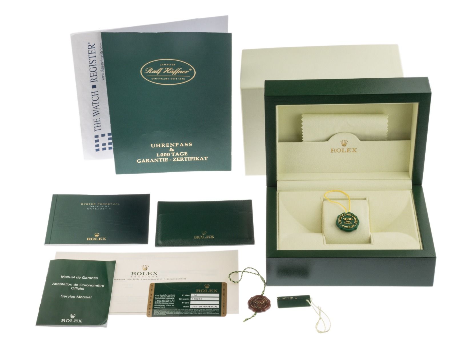 Inklusive certified pre owned Siegel / Uhrenpass mit einem Farbbild, der genauen Beschreibung sowie dem Wiederbeschaffungswert der Uhr über 12500,-€ und 1000 Tage Garantie ab Kaufdatum.