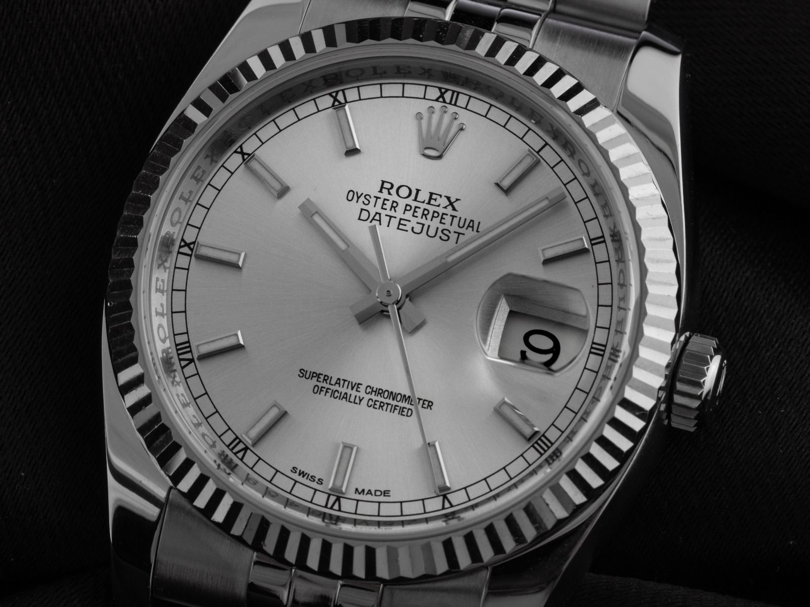 Gehäuse aus poliertem und satiniertem Edelstahl, Gehäusedurchmesser ohne Krone 36mm, Gehäusehöhe 11,5mm. Lünette aus poliertem und geriffeltem 18kt Weißgold. Armband Jubilé aus poliertem und satiniertem Edelstahl, verdeckte Crownclasp-Faltschließe aus Edelstahl mit Hersteller-Logo. Zifferblatt in Silber mit aufgesetzten Indexen und zeigern aus Weißgold. Uhrwerk Automatik, Chronometer mit Zeugnis, Rolex Manufakturkaliber 3135 mit 31 Edelsteinen. Anzeige von Stunde, Minute und Sekunde über Zeiger aus der Mitte mit Sekundenstopp zur sekundengenauen Einstellung der Uhrzeit, Datumsanzeige mit Schnellverstellung unter Glaslupe bei 3 Uhr. Saphirglas kratzfest. Verschraubbare Krone mit Hersteller-Logo. Boden aus Edelstahl verschraubt. Gewicht der Uhr inklusive Armband 115g, Länge des Armbandes inklusive Gehäuse 170mm. Referenznummer: 116234, Gehäusenummer: 25VK8XXX, ID: P2755153000326HW-12500, Artikelnummer: 10000085299. Mit Gangkontrolle und kompletter äußerlicher Aufarbeitung von März 2026. Original Rolex Box mit Umkarton und Garantiepapieren von September 2013, LC 100 / Germany EU sowie Beschreibung, Ledermäppchen, Rolex Chronometer-Siegel, Tag, Erstkaufrechnung und Watchregister-Auszug von März 2026, The Watch Register Zertifikat / ohne Eintrag (Internationale Datenbank für verlorene oder gestohlene Uhren), Full Set. Superschnäppchen, Kapitalanlage mit Wertsteigerungspotential, aus erster Hand, fast nicht getragen. Wie Neu. Lieferzeit sofort.