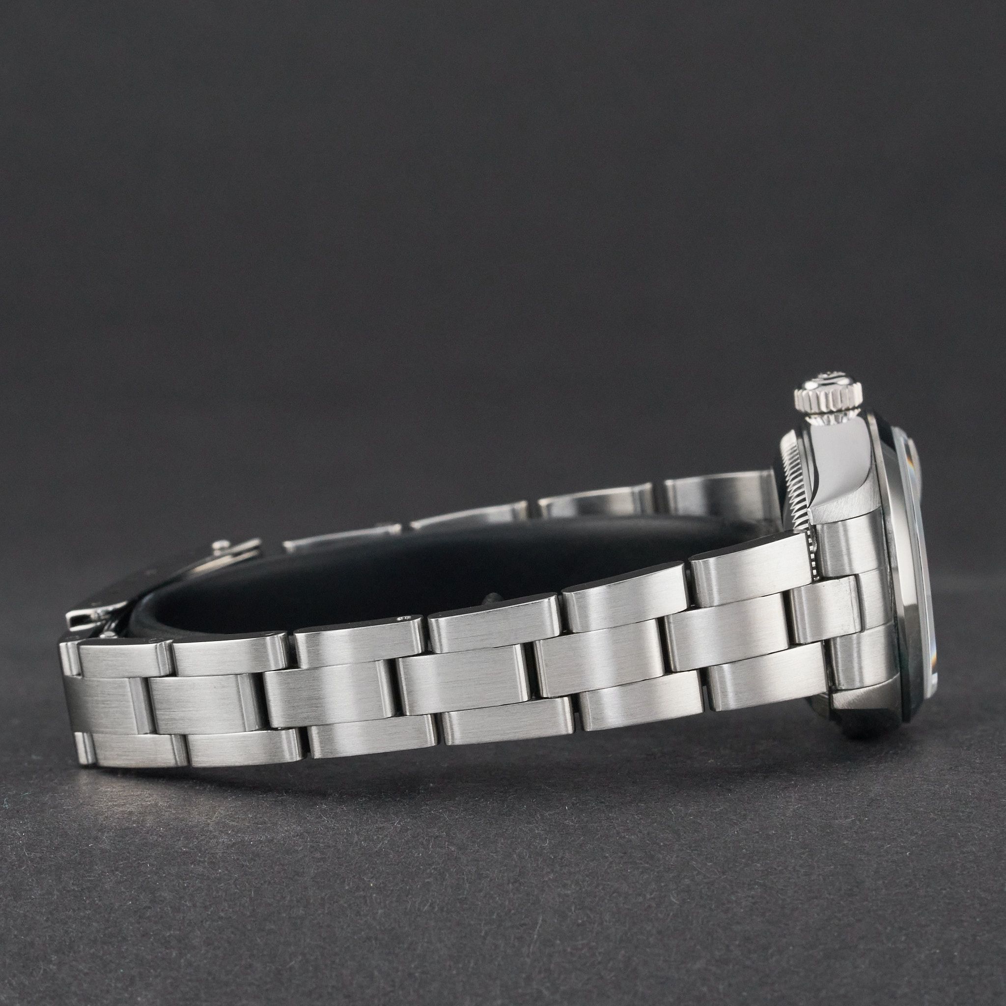- Leichte Gebrauchsspuren wie feine Kratzer oder kleine Oberflächenkratzer. Gehäuse, Lünette und Armband behalten ihre scharfen Kanten und die ursprüngliche Form. Kann professionell poliert worden sein, ohne die originalen Konturen zu verändern. Mechanisch voll funktionsfähig.