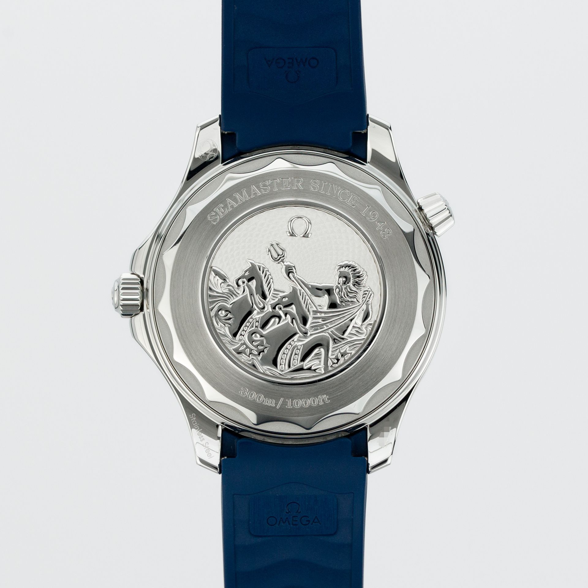 It is distinguished from the other Diver 300M models by several design elements – the most visible being the special "Summer Blue" color, which graduates from the center to the edges of the dial. The second distinctive element is the color of the luminescence (again, blue), as well as the color of the numerals on the bezel, which are also rendered in blue. The third accent is the solid case back, which depicts Poseidon driving a team of two seahorses – the signature emblem of the Seamaster.
