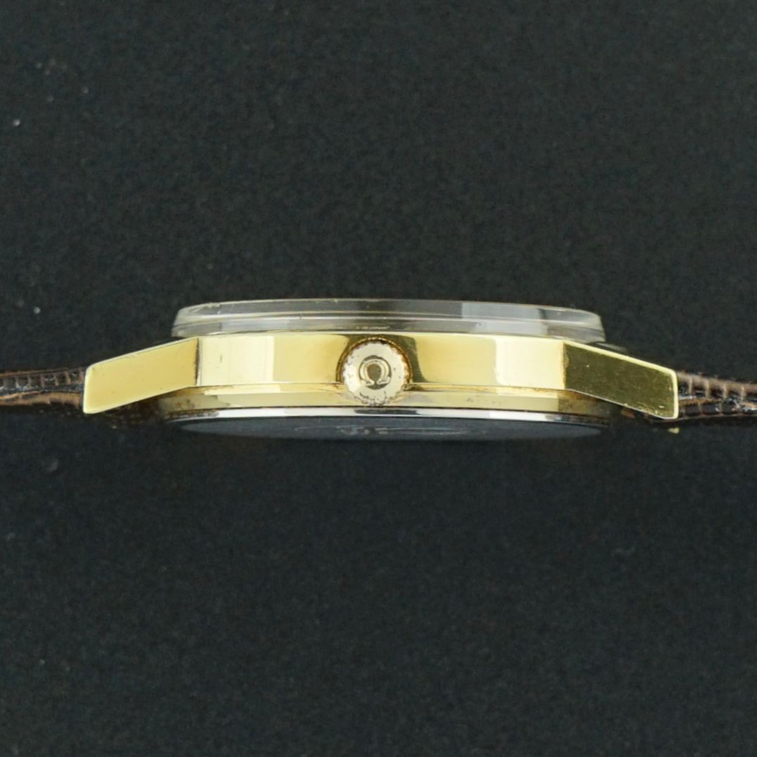 Eine Vintage Omega Genève, produziert im Jahr 1972, mit einem wunderschönen goldenen Zifferblatt und einem Sonnenschliff-Effekt. Das Zifferblatt wird durch elegante goldene und schwarze Akzente ergänzt.