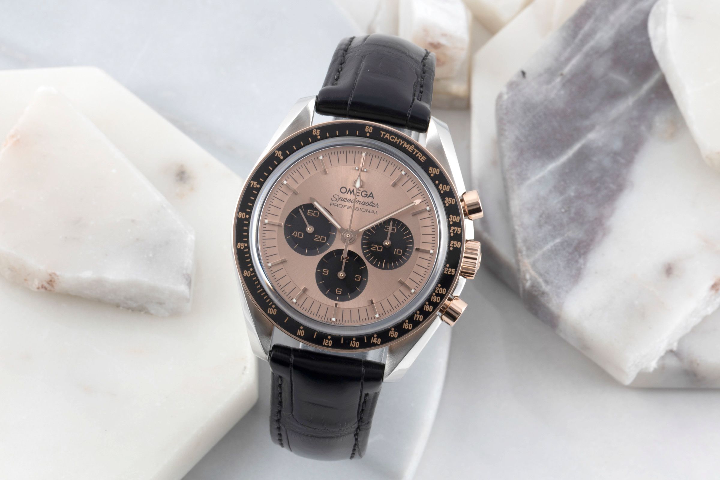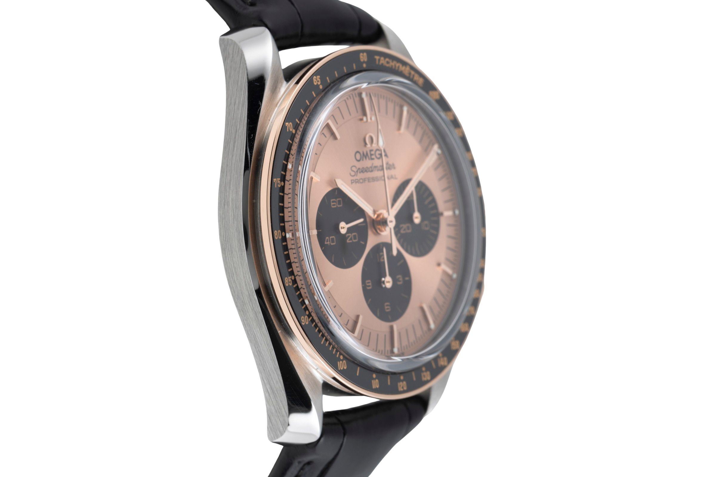 Alternative title: Omega 310.23.42.50.99.001 Speedmaster Professional Moonwatch 3861 Stainless Steel - Sedna Gold / Pink / Alligator; Omega Speedmaster Moonwatch Chronograph Stahl/Gold Ref. 310.23.42.50.99.001 B&P [2600906]