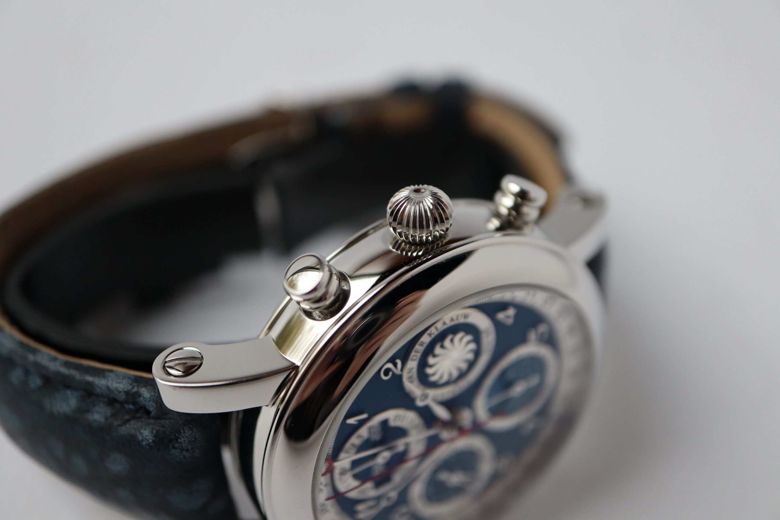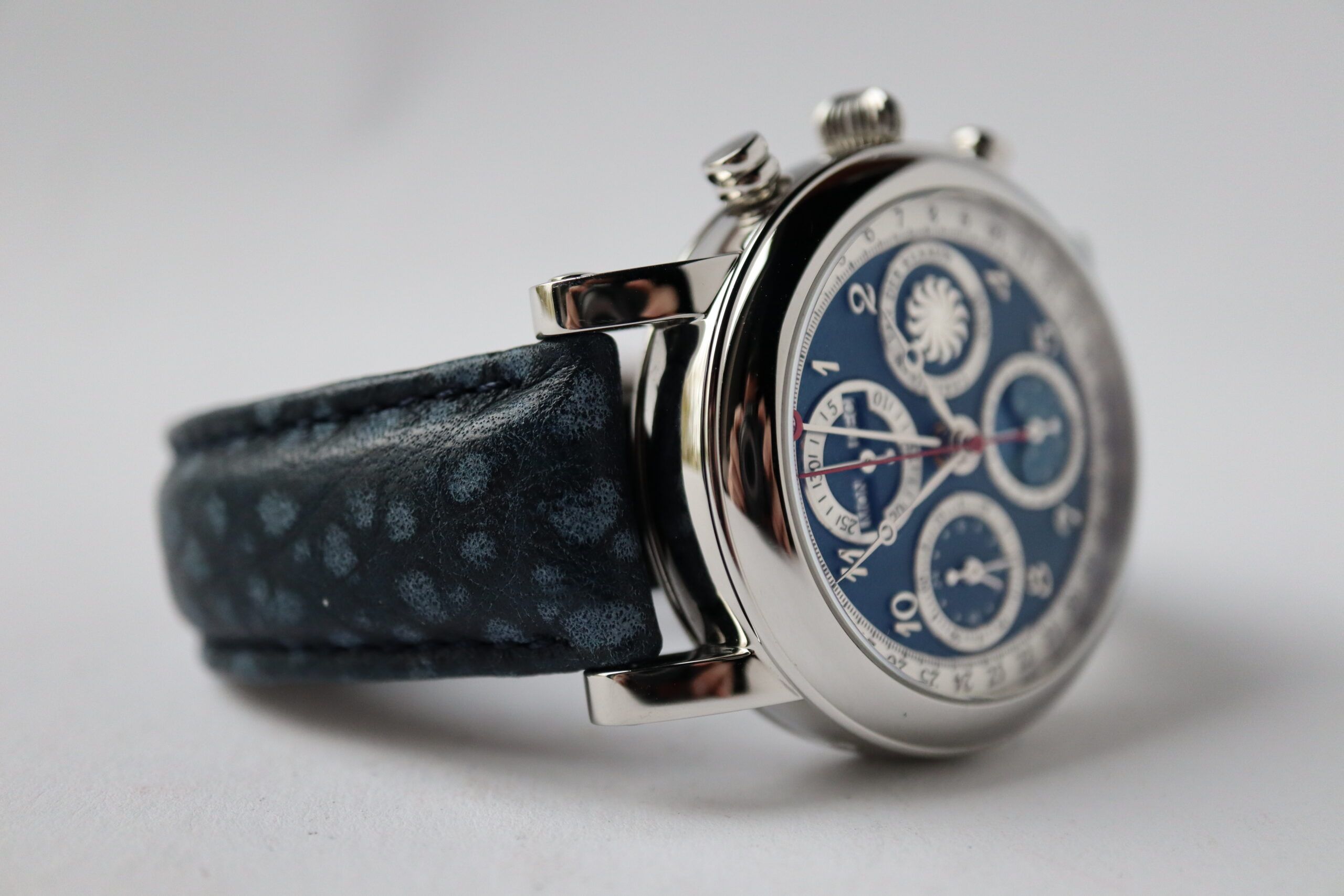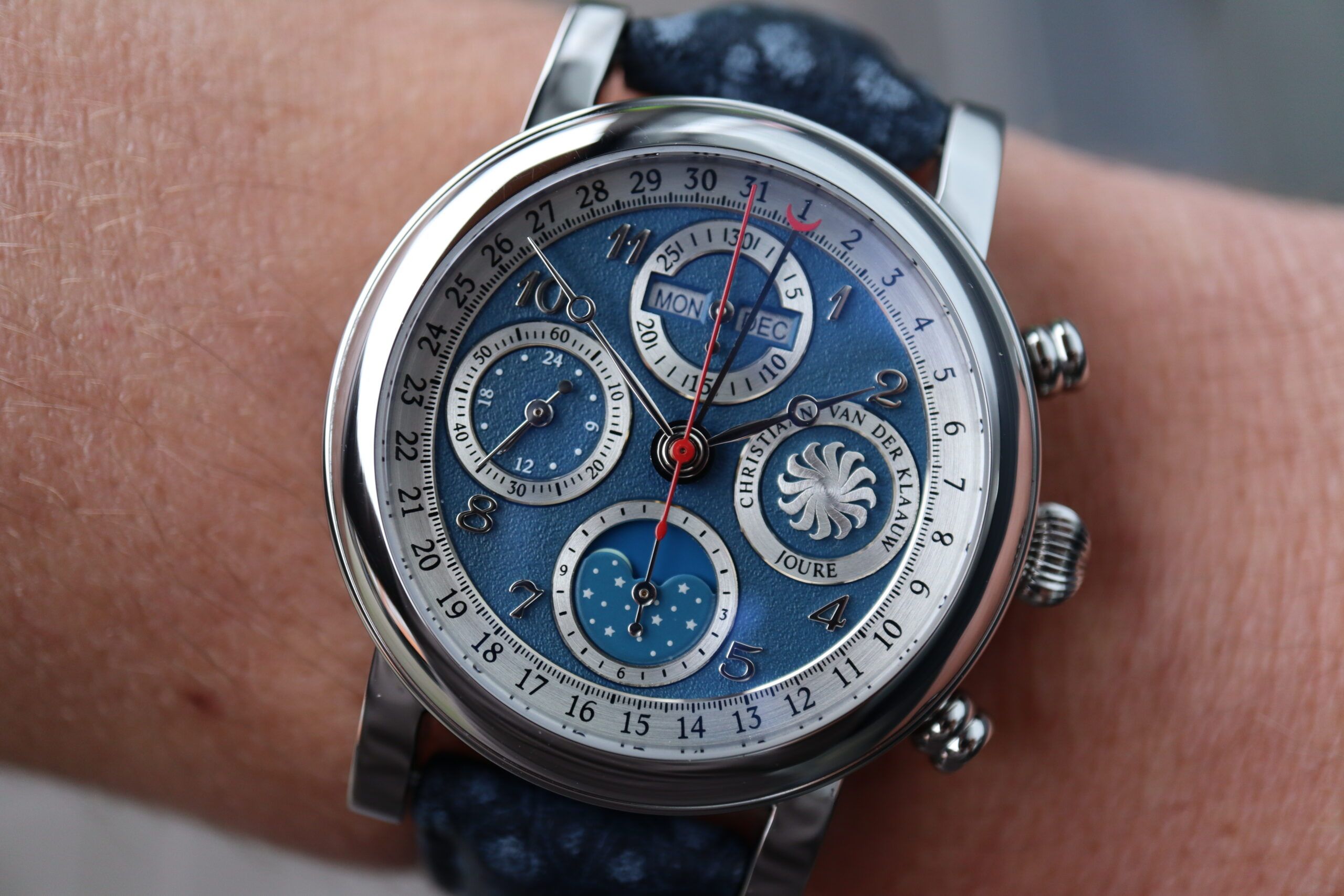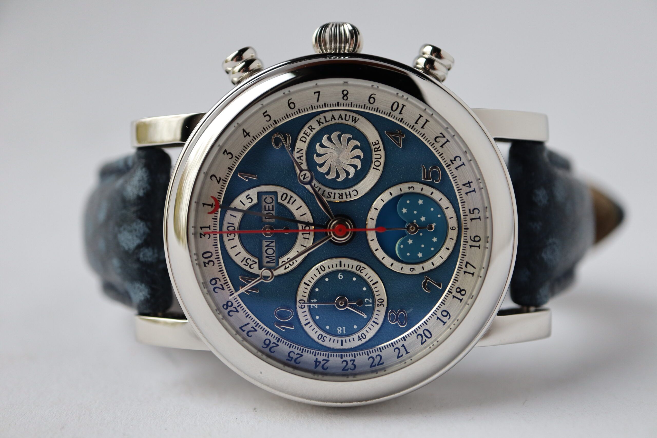 Klassische astronomische Uhrenmacherkunst in ihrer besten Form, kombiniert mit einem sportlichen Design. Dieser Chronograph mit Sekunden-, Minuten- und Stundenanzeige wird von einer vollständigen Datumsanzeige und einem 24-Stunden-Indikator begleitet. Die Position des Mondes kann auf der 6-Uhr-Position abgelesen werden. Wenn der Mond links von der Mitte ist, befindet er sich im ersten Viertel. Wenn der Mond in der Mitte ist, ist es Vollmond und rechts von der Mitte ist er im letzten Viertel. Wenn der Mond nicht sichtbar ist, sieht man einen wunderschönen Sternenhimmel im Fenster, es ist Neumond.