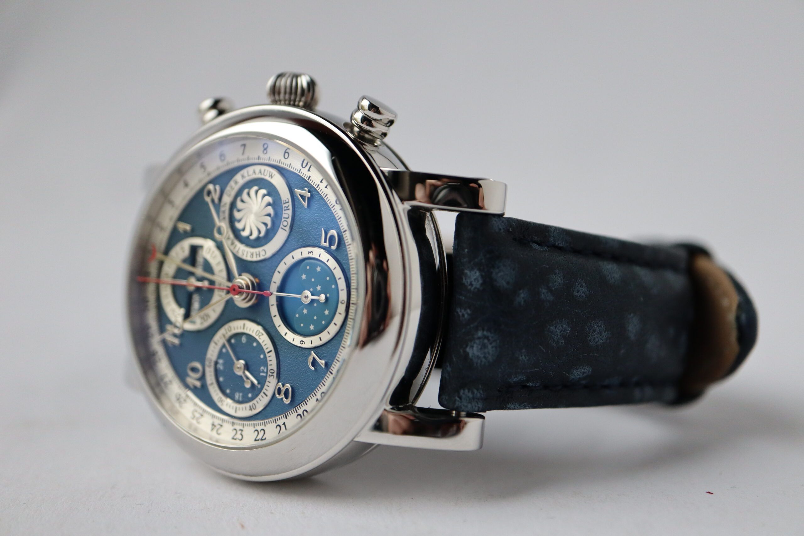 Classic astronomical watch making at its very best, combined with a sporty design. This chronograph with seconds, minute and hour counter is accompanied by a full date indication and 24 hour indicator. The position of the Moon can be read at the 6 o’clock position. When the Moon is left of centre, it is in its first quarter. When the Moon is in the centre, it is full Moon and right of centre, it is in its last quarter. If the Moon is not visible, you see a beautiful starry sky in the window, it is new Moon.