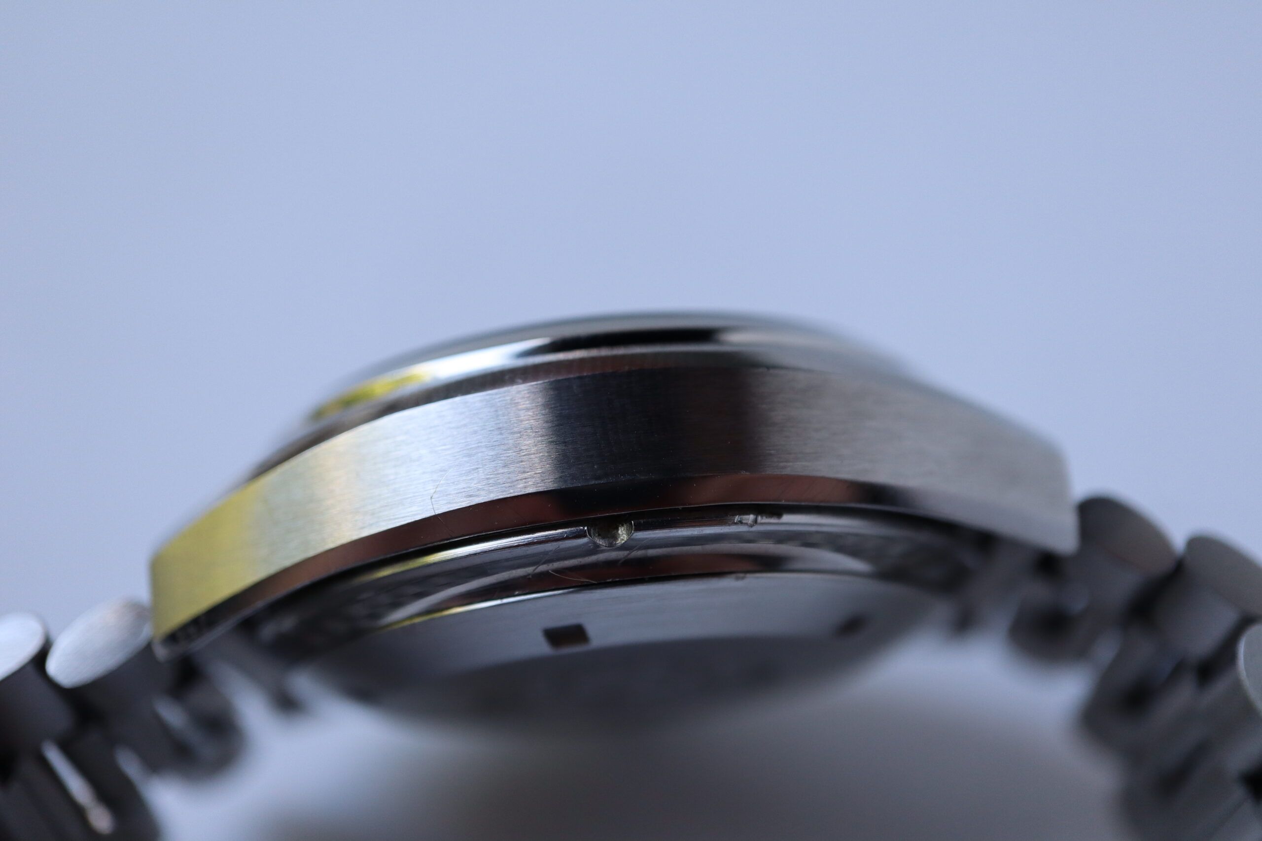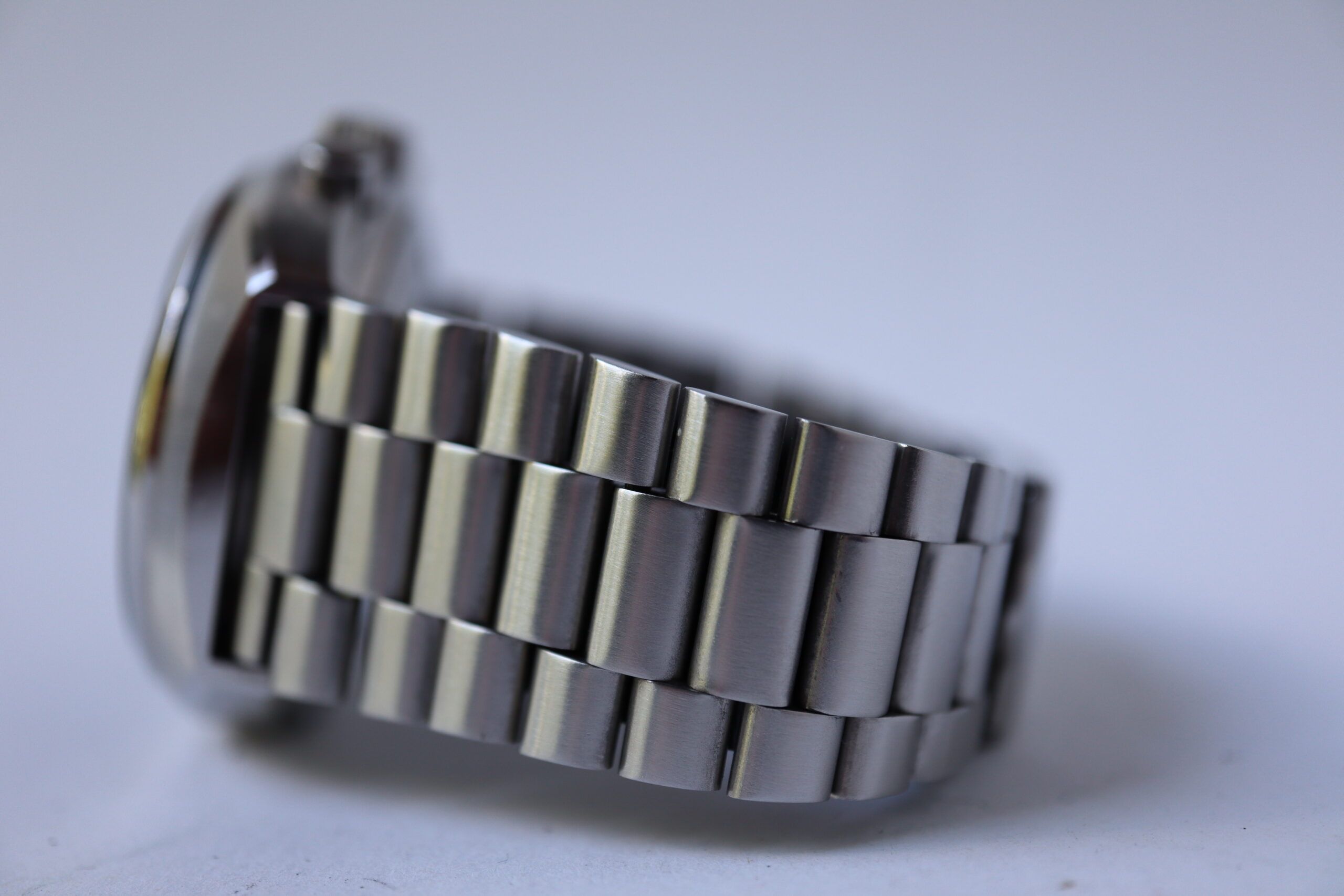 - Sichtbare Gebrauchsspuren wie Kratzer, kleine Dellen oder leichtes Spiel im Armband. Kann professionell poliert worden sein. Mechanisch voll funktionsfähig.